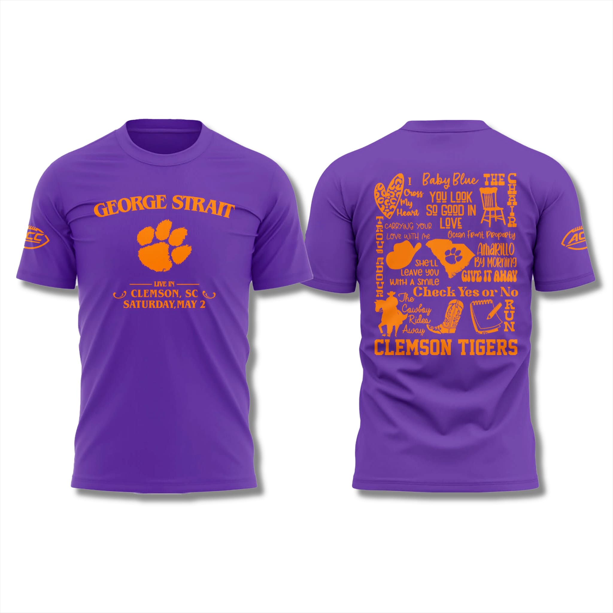 The shirt design stands out with an artistic arrangement of Strait’s hits combined with the traditional colors of the Clemson Tigers. Available at iFrogtees in 3 colors – purple, orange, and black – for you to choose and style for the show.