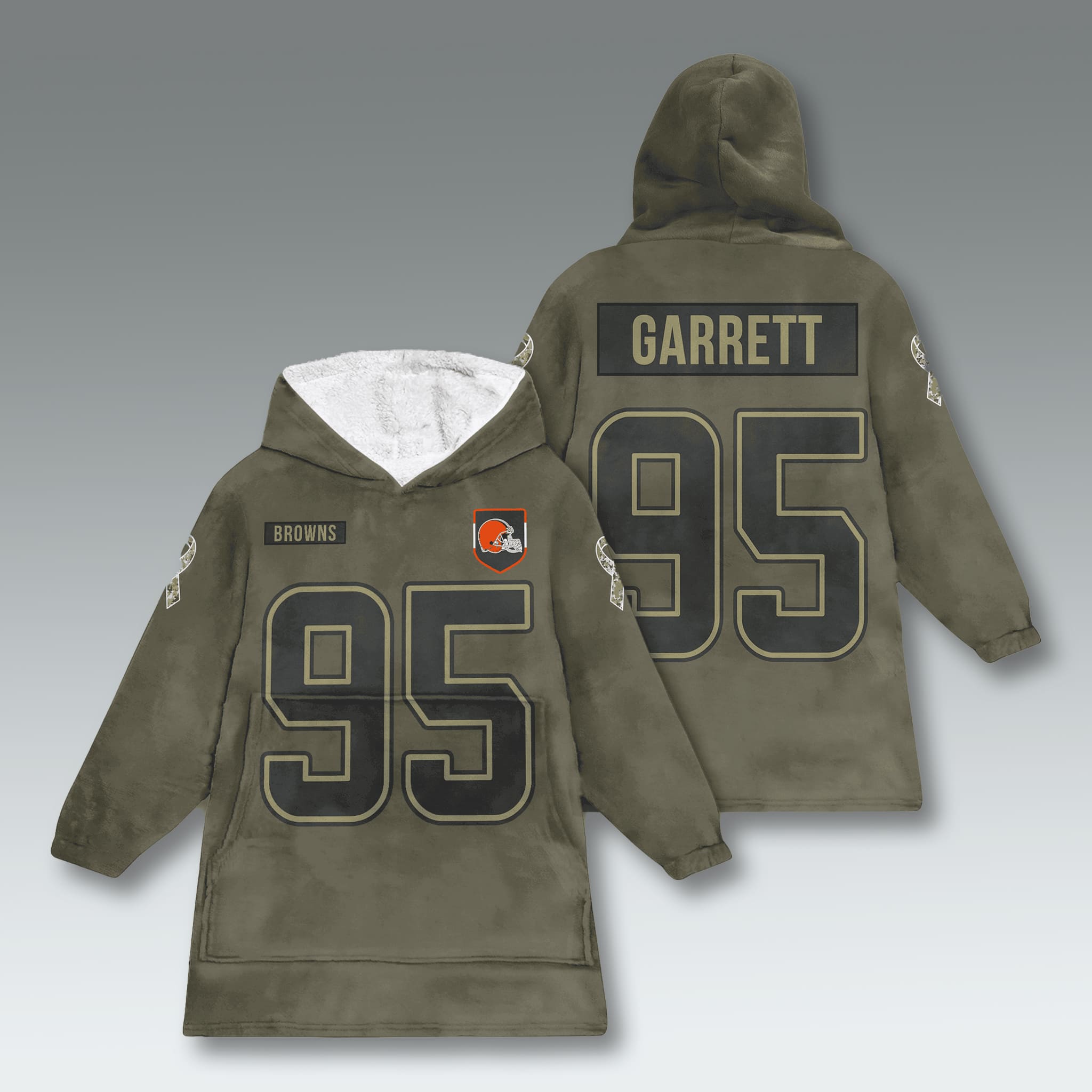 The massive, oversized hoodie is rendered in a military-inspired olive green, symbolizing the “Salute To Service” theme. It prominently features Myles Garrett’s name and number 95 in bold, tactical lettering, complete with the Browns logo and recognition ribbons on the sleeves, merging team graphics with a patriotic tribute.