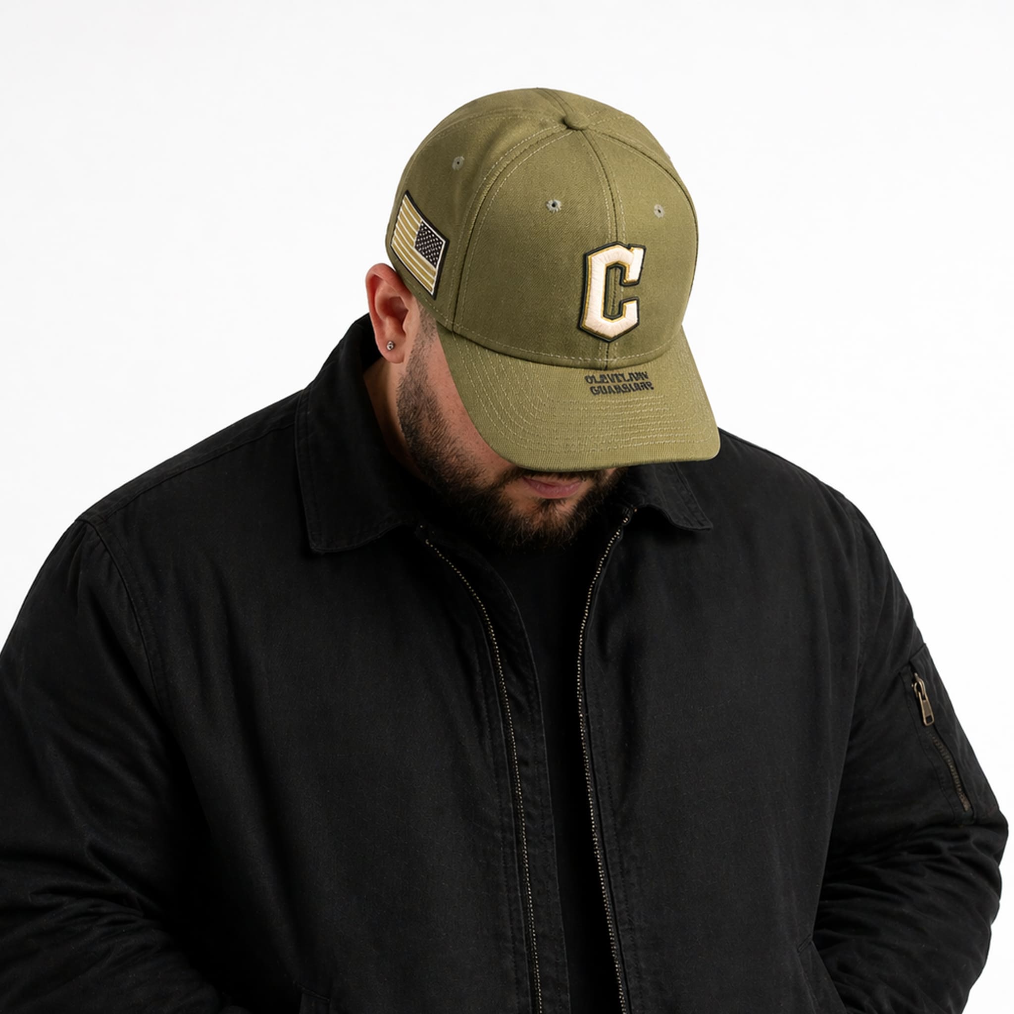 Olive green base, the Guardians “C” in cream and black at the center – bold, solid, the kind of embroidery that holds up for years. American flag patch on the left panel in tonal olive and tan. “Cleveland Guardians” along the underside of the brim and the color story is entirely military. With breathable yet durable fabric and a structured form, this hat is an easy everyday piece that works across seasons and styles.