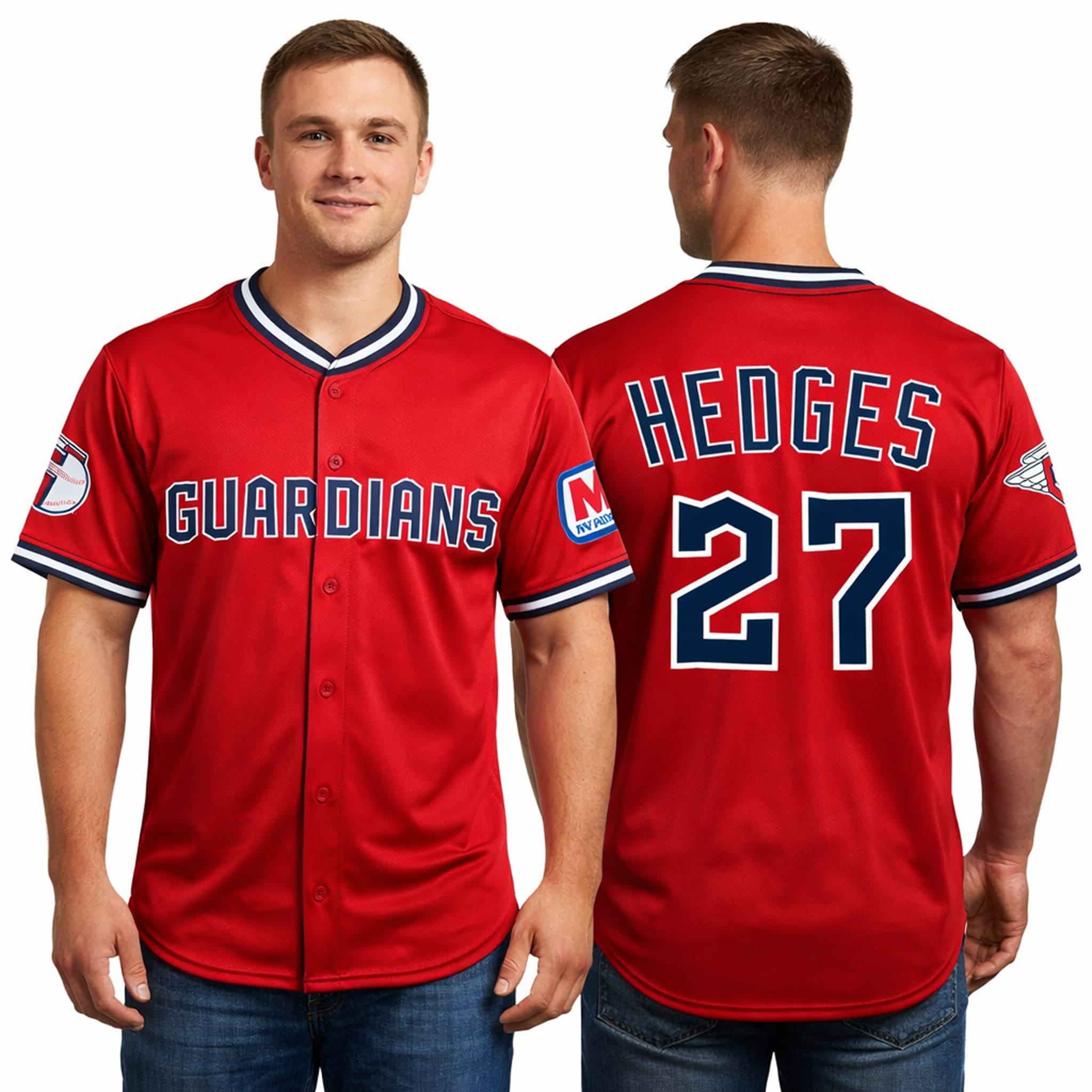 This limited-edition jersey stands out with bold style: a bright red base (red jersey), large block “GUARDIANS” lettering across the chest, classic navy-and-white trim on the collar and sleeves, the name HEDGES and number 27 prominently displayed on the back, a Marathon patch on the right sleeve (courtesy of Marathon), and breathable 100% polyester fabric – perfect for cheering as Hedges blocks pitches or for showing off your Guardians pride around town!