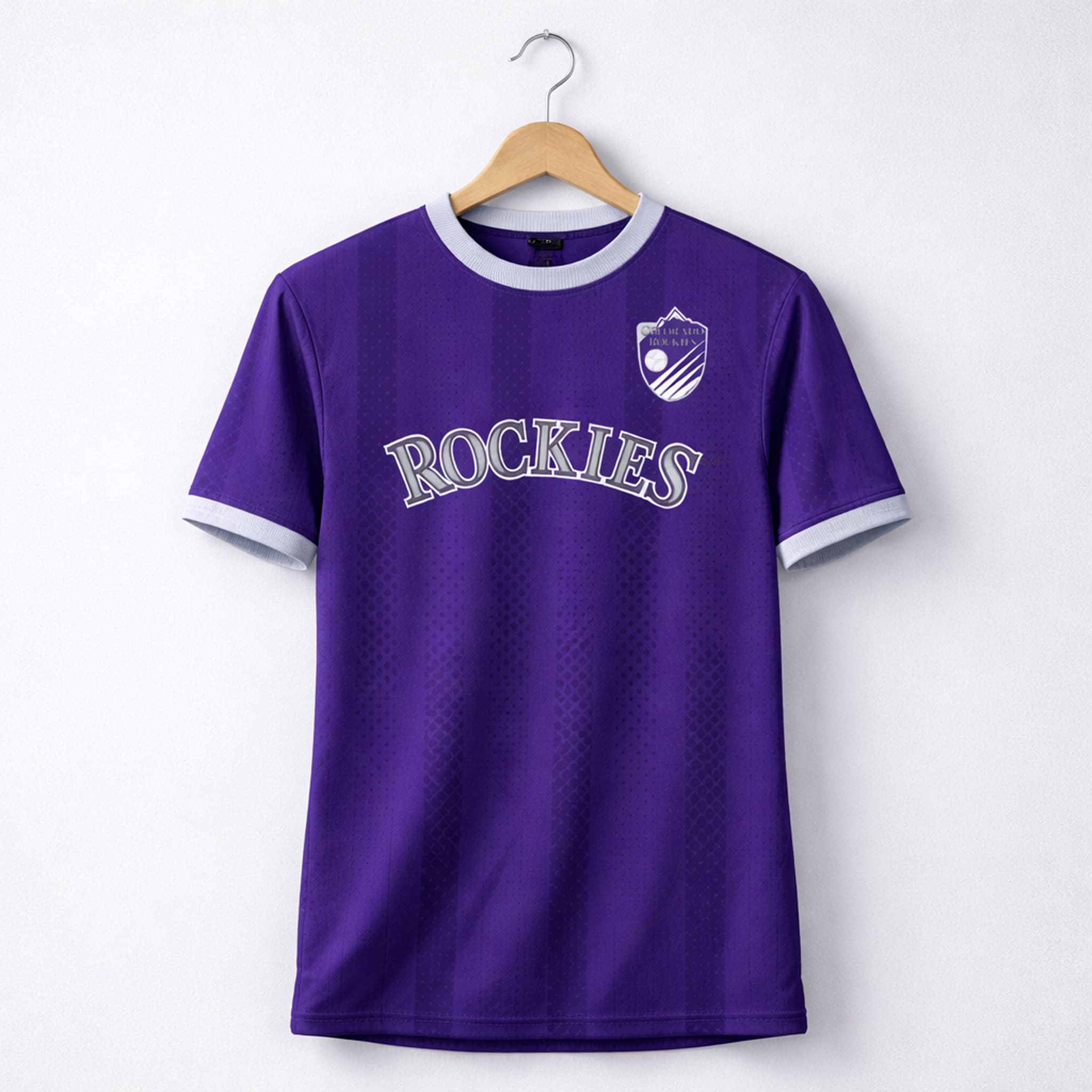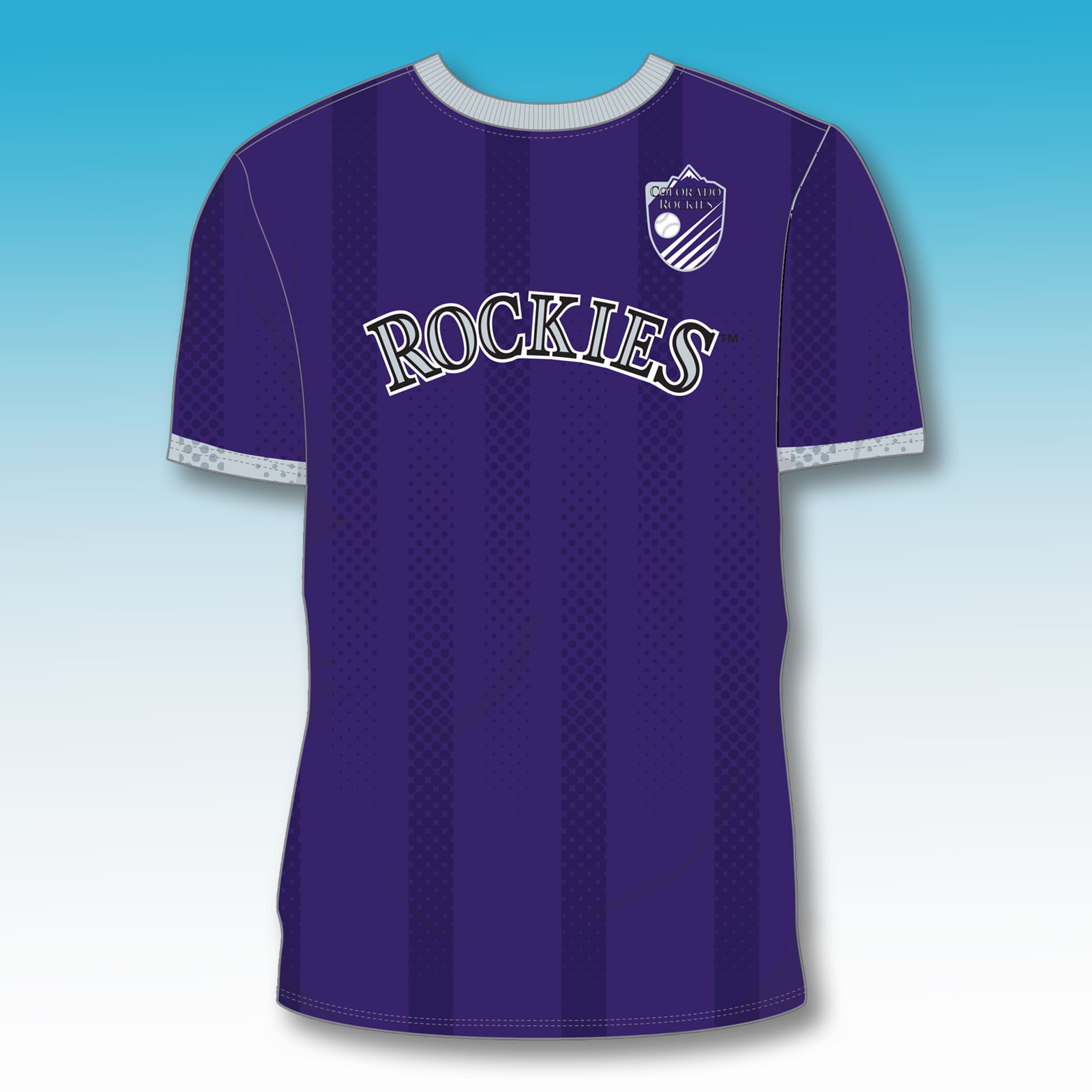 This jersey features a unique and emotional design: a traditional purple base highlighted with bold vertical stripes and breathable mesh dot patterns. The word “ROCKIES” is prominently displayed across the chest in striking white, black, and gray tones. The iconic Colorado Rockies shield logo (mountains and a baseball) is placed proudly on the chest, creating an overall look that is both modern and deeply athletic. The jersey is made from premium breathable material, comfort so you can cheer intensely throughout the game or showcase your Rockies pride anywhere.