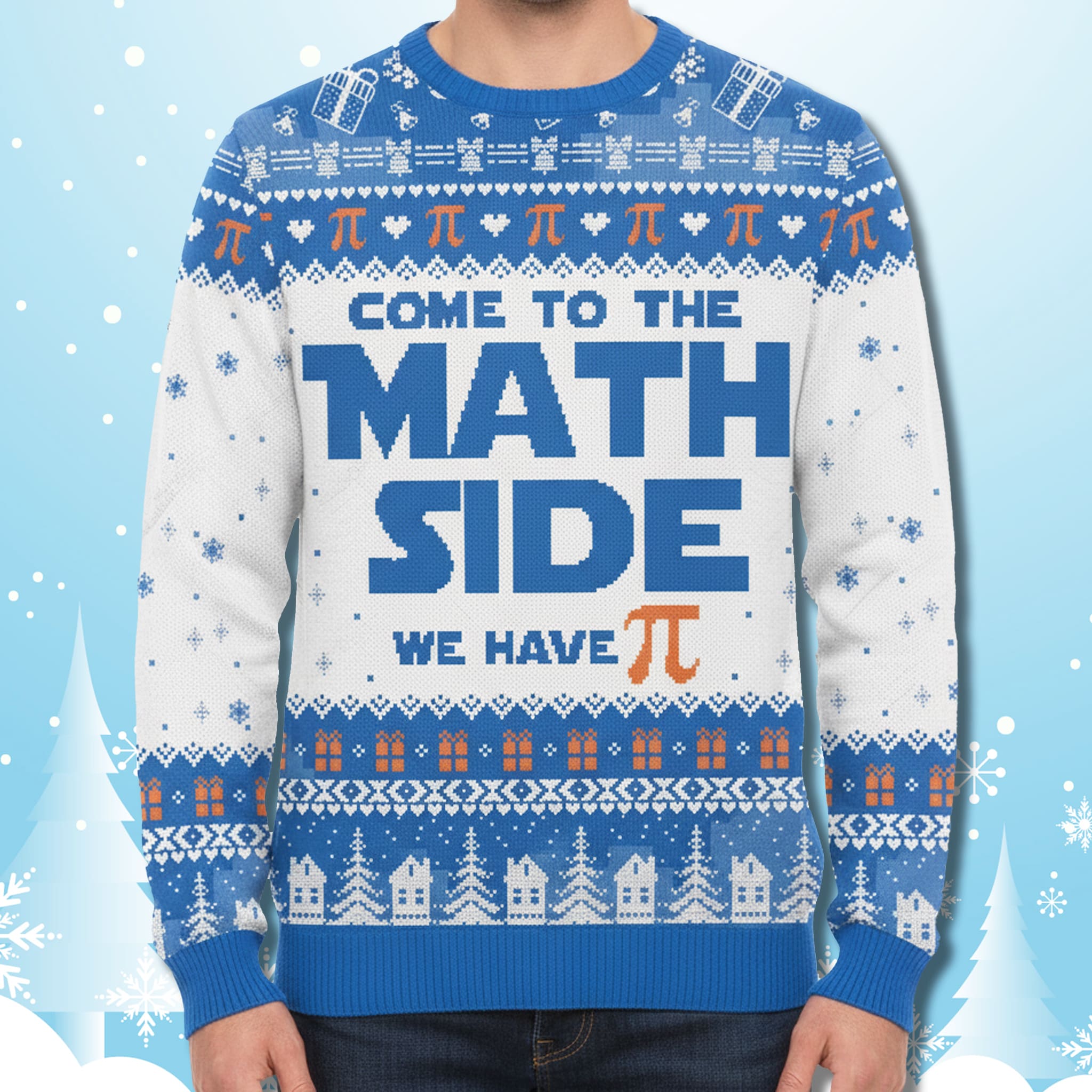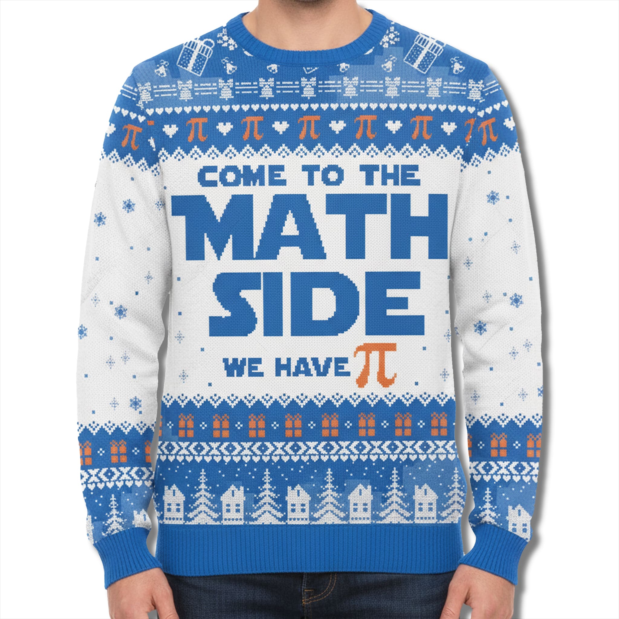 The Come To The Math Side We Have Pi Ugly Sweater Christmas is a witty invitation for math lovers, scientists, or pop culture fans who enjoy blending intellect with holiday cheer. This sweater combines deep blue, crisp white, and bright orange accents. The centerpiece boldly displays “COME TO THE MATH SIDE WE HAVE Pi”, while classic holiday motifs are cleverly replaced with π symbols, gift boxes, and snowy winter houses.