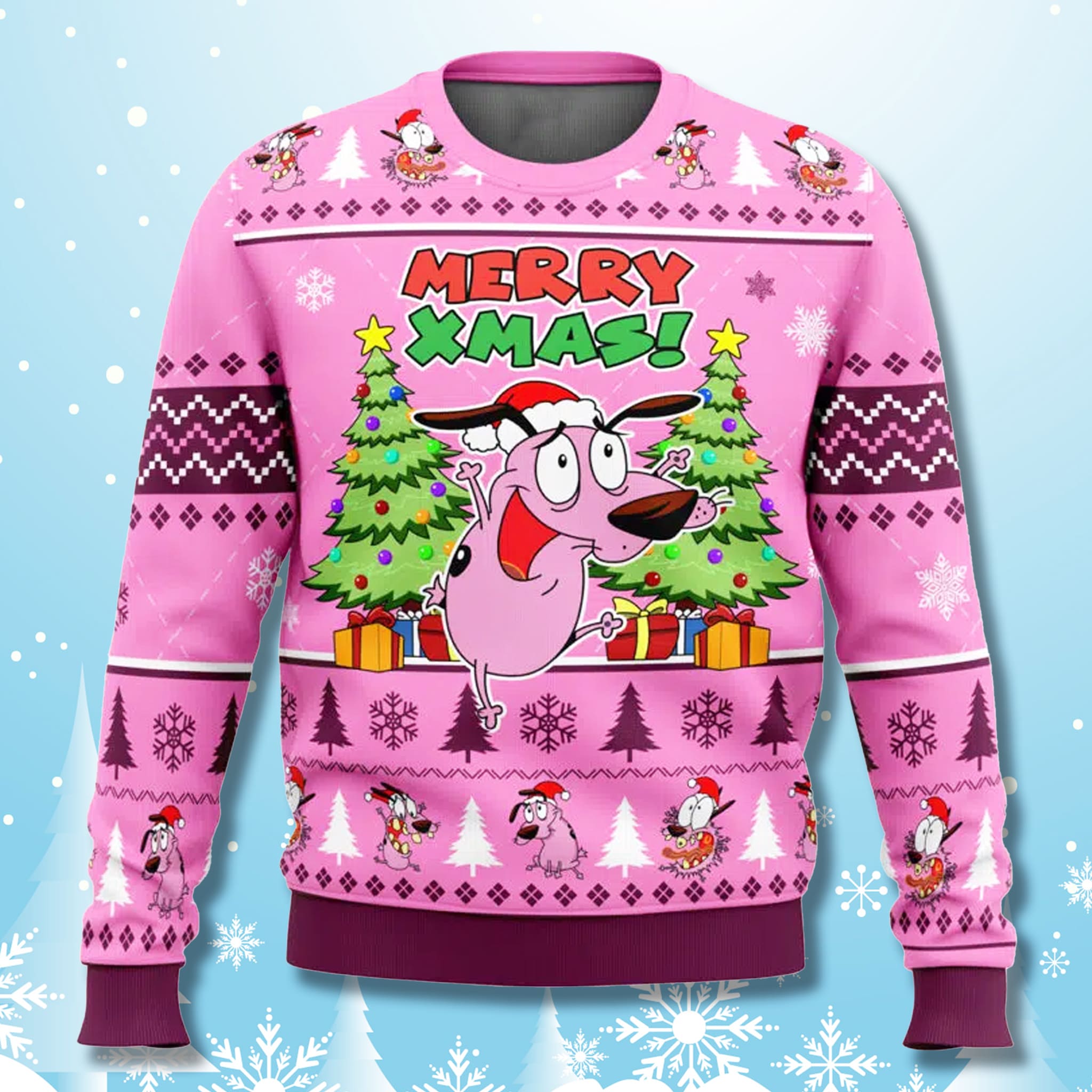 Overcome Your Fears and Celebrate. Don’t be a “Stupid Dog” and miss out! This Courage The Cowardly Dog Pink Ugly Sweater perfectly blends the show’s dark humor with cheerful festive fun. It’s a great conversation starter and the ideal gift for any 90s cartoon fan.