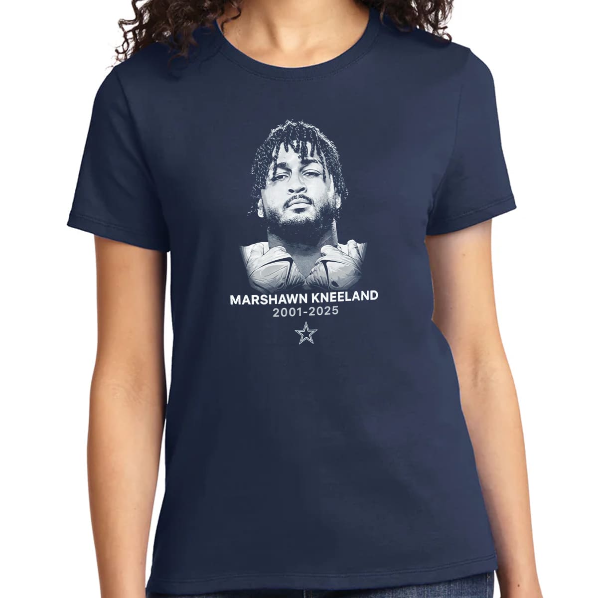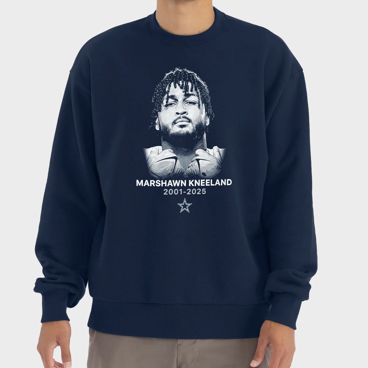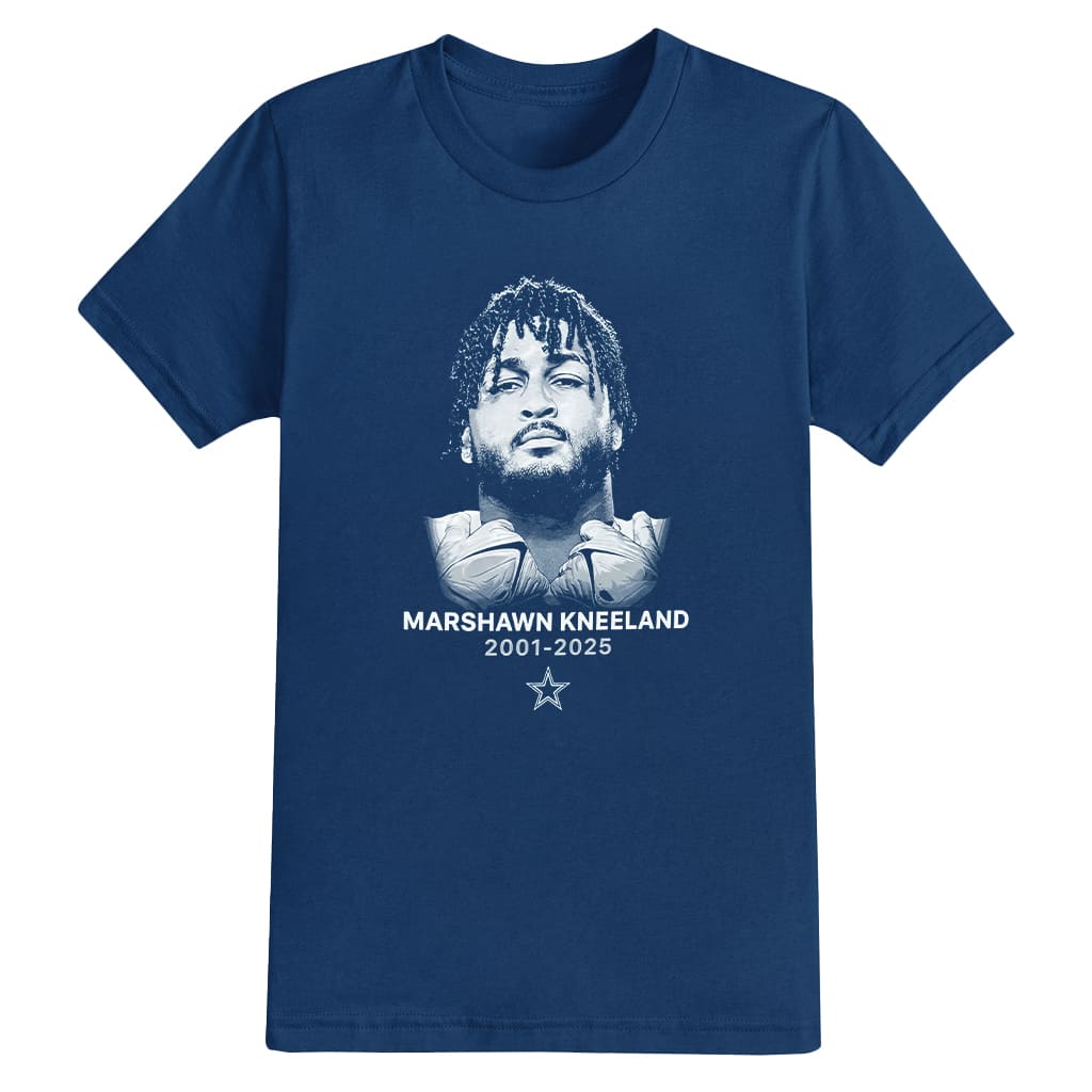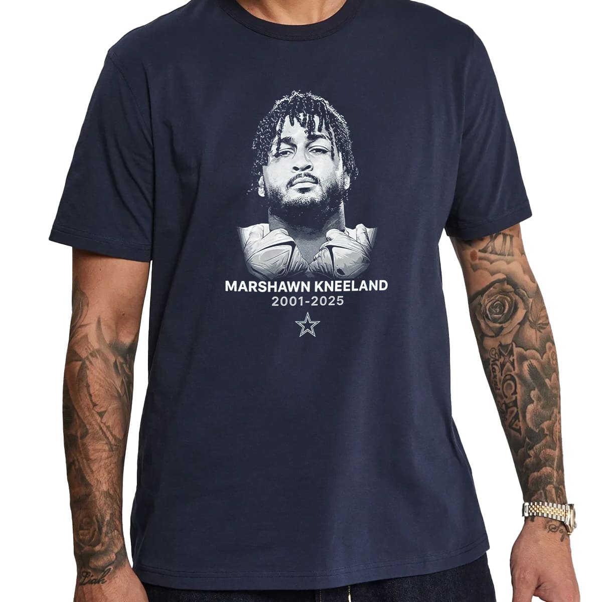 The design of this Marshawn Kneeland shirt features a solemn black-and-white portrait, the text “MARSHAWN KNEELAND 2001–2025,” and the Cowboys star below, turning the shirt into a symbol of unity for Cowboys Nation, marking and honoring a warrior who fought with relentless effort.