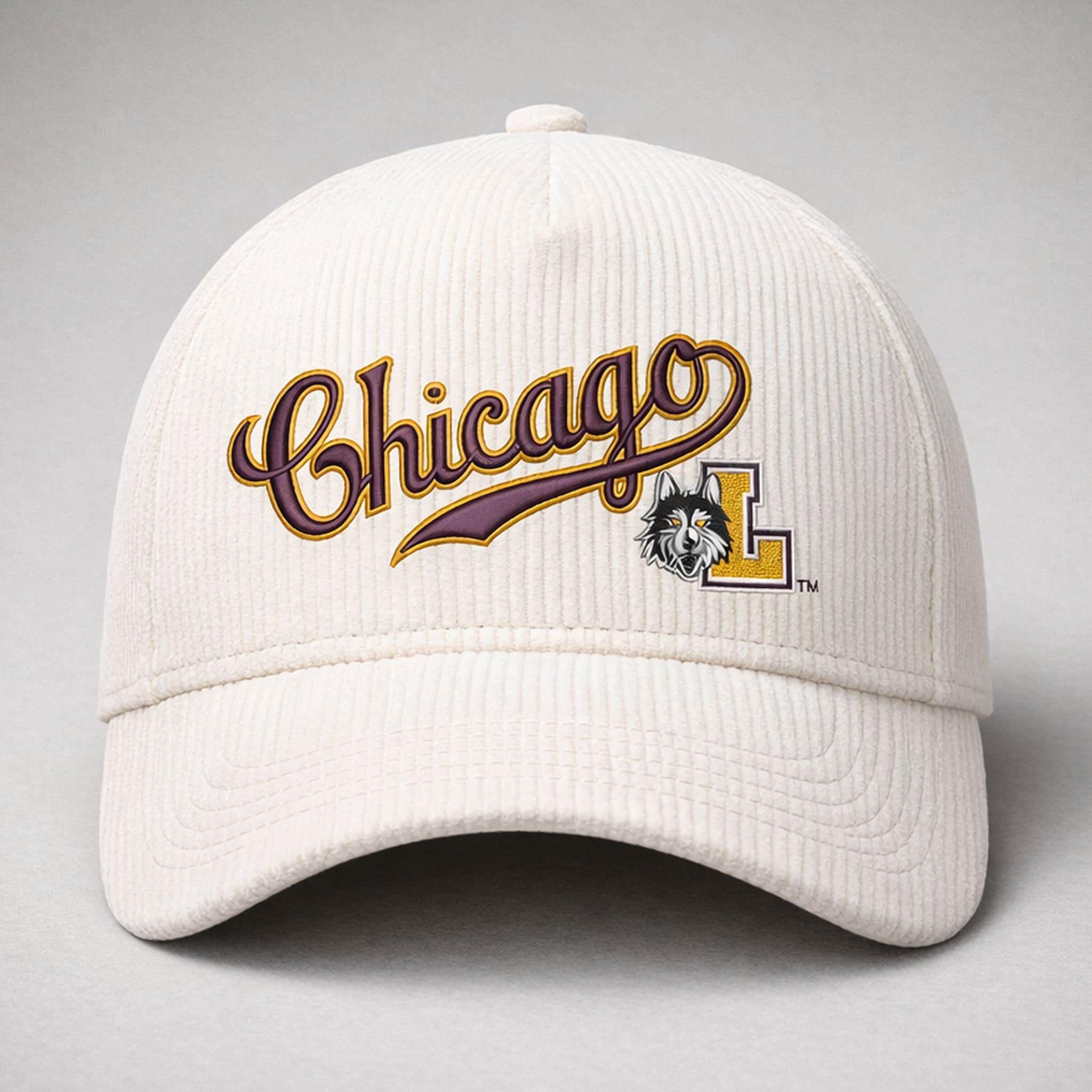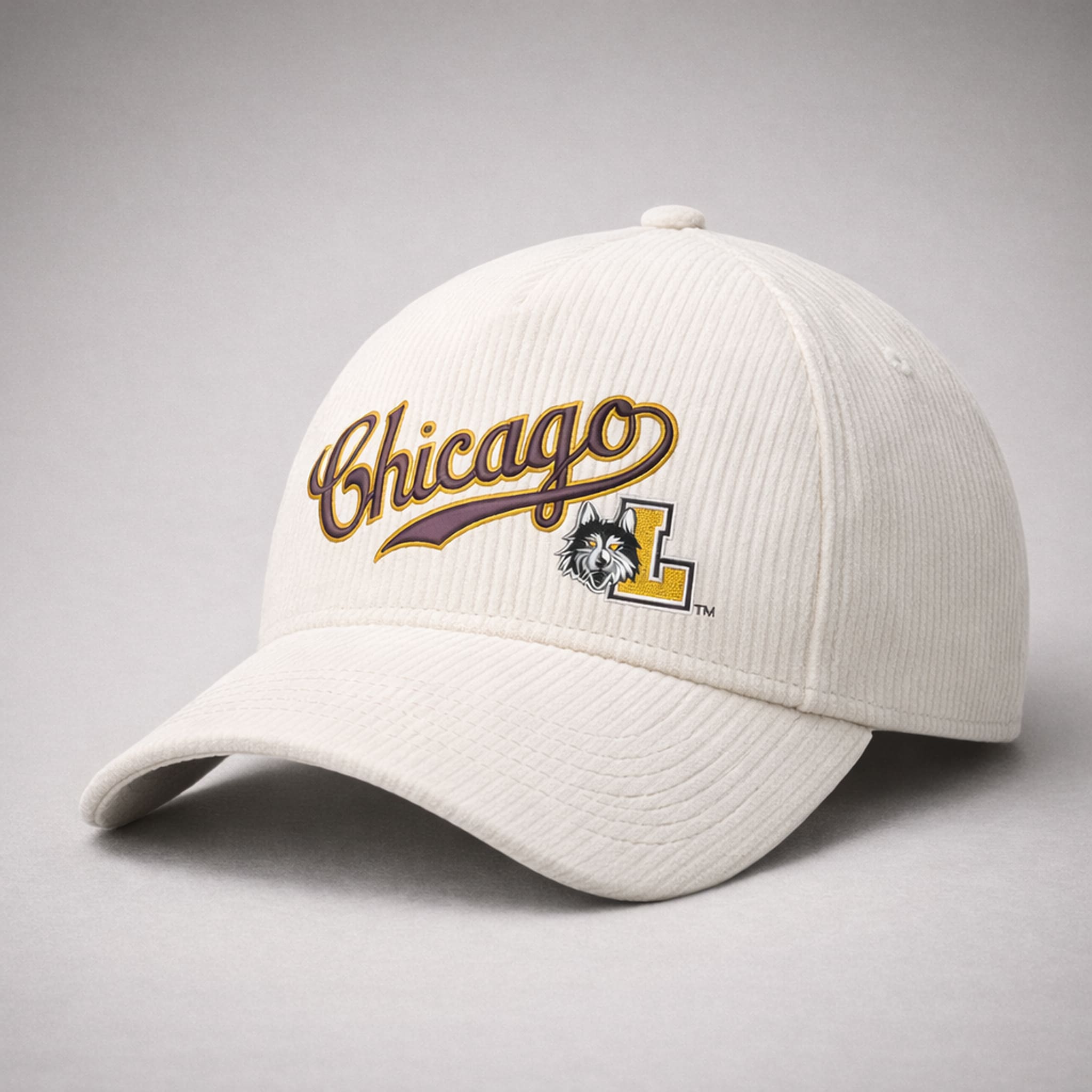 The design features a classic and elegant cream-white corduroy fabric. The highlight is the soft embroidered “Chicago” lettering along with the iconic LU Wolf logo representing Loyola University Chicago. On the back, “Chicago Cubs” is embroidered, reinforcing the strong connection between the city’s iconic team and one of its most prestigious institutions.