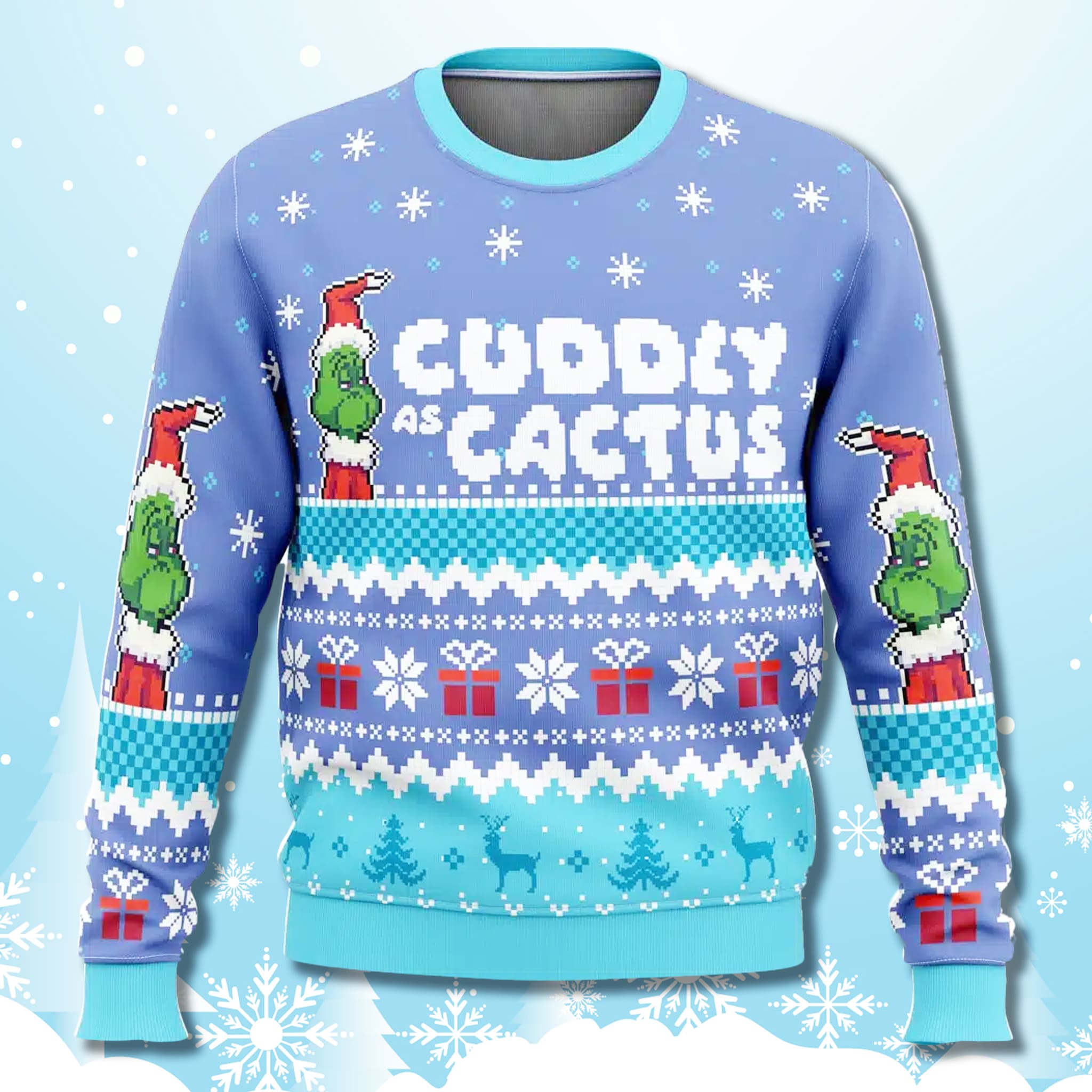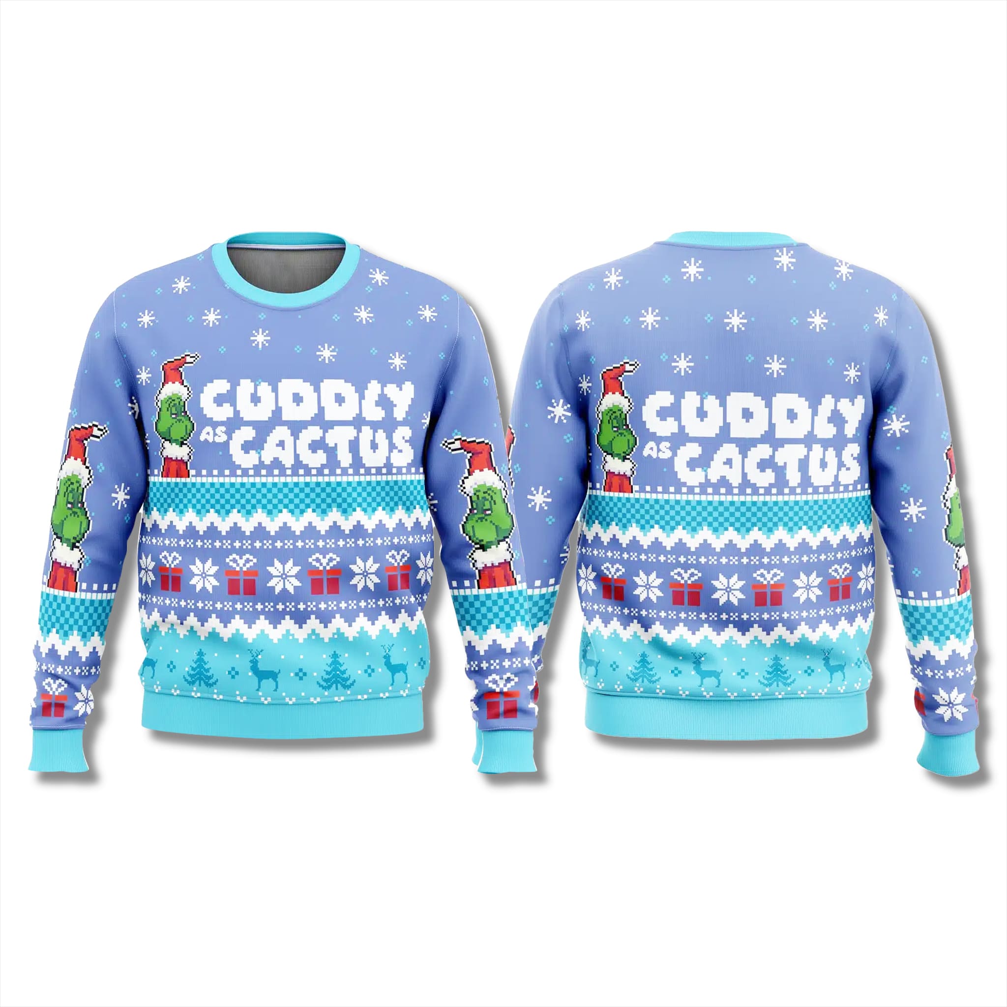 This sweater features Grnch-inspired pastel green and purple tones, with traditional jacquard knit patterns. The front and back showcase a pixelated Grnch wearing a Santa hat, surrounded by snowflakes, gift boxes, and the bold statement “CUDDLY AS A CACTUS” – capturing the perfect mix of humor and holiday spirit.