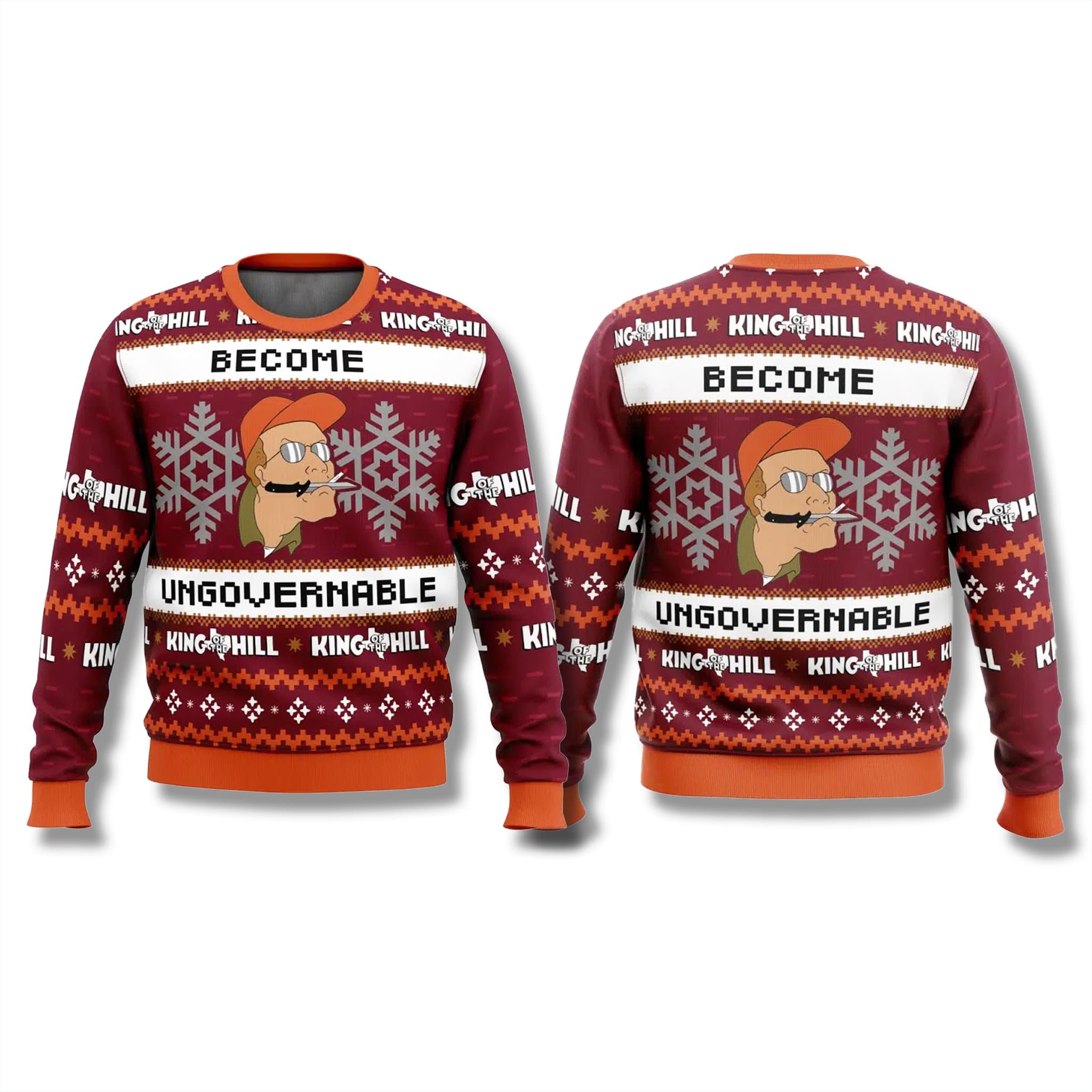 This unique Dale Gribble King of The Hill Become Ungovernable Ugly Sweater immediately catches the eye with its rich maroon and white festive palette. The design centers on a bold portrait of Dale Gribble—cigar in mouth, sporting his signature sunglasses—above the clear and provocative call to action: “BECOME UNGOVERNABLE.” The overall pattern is a quirky, incorporating geometric snowflakes, stylized King of the Hill logos, and a contrasting border of white and orange.