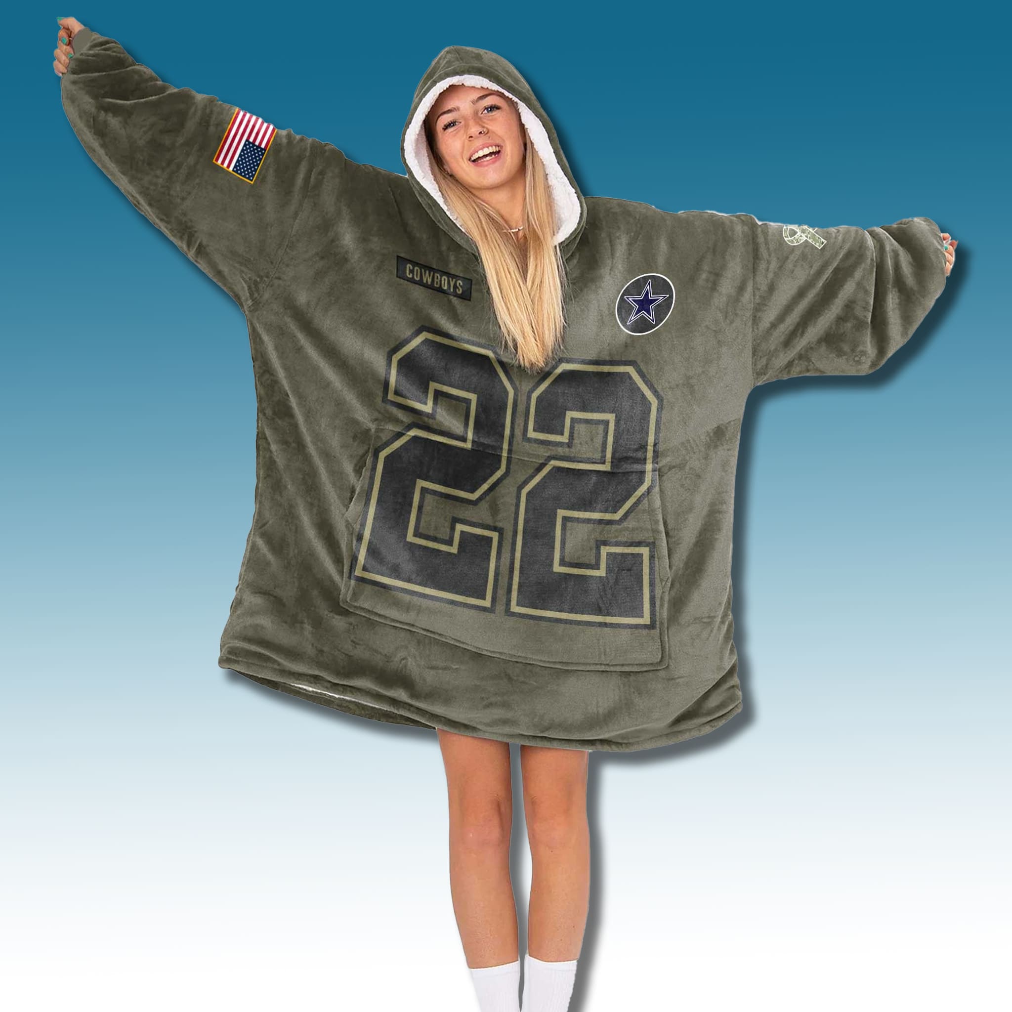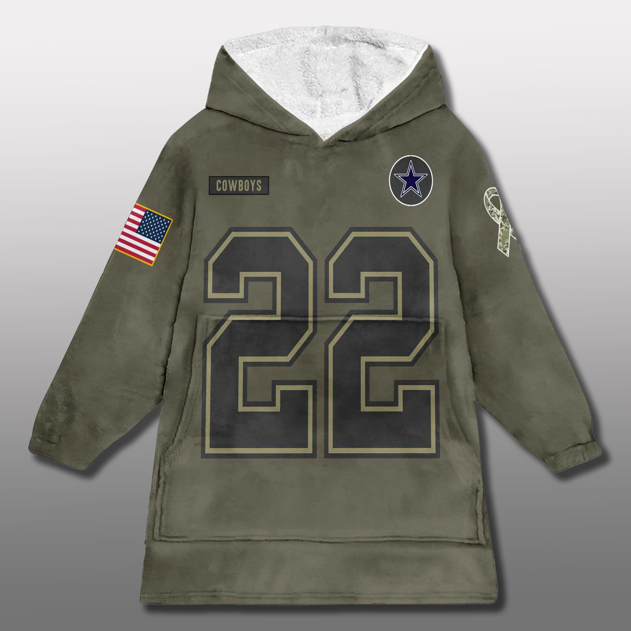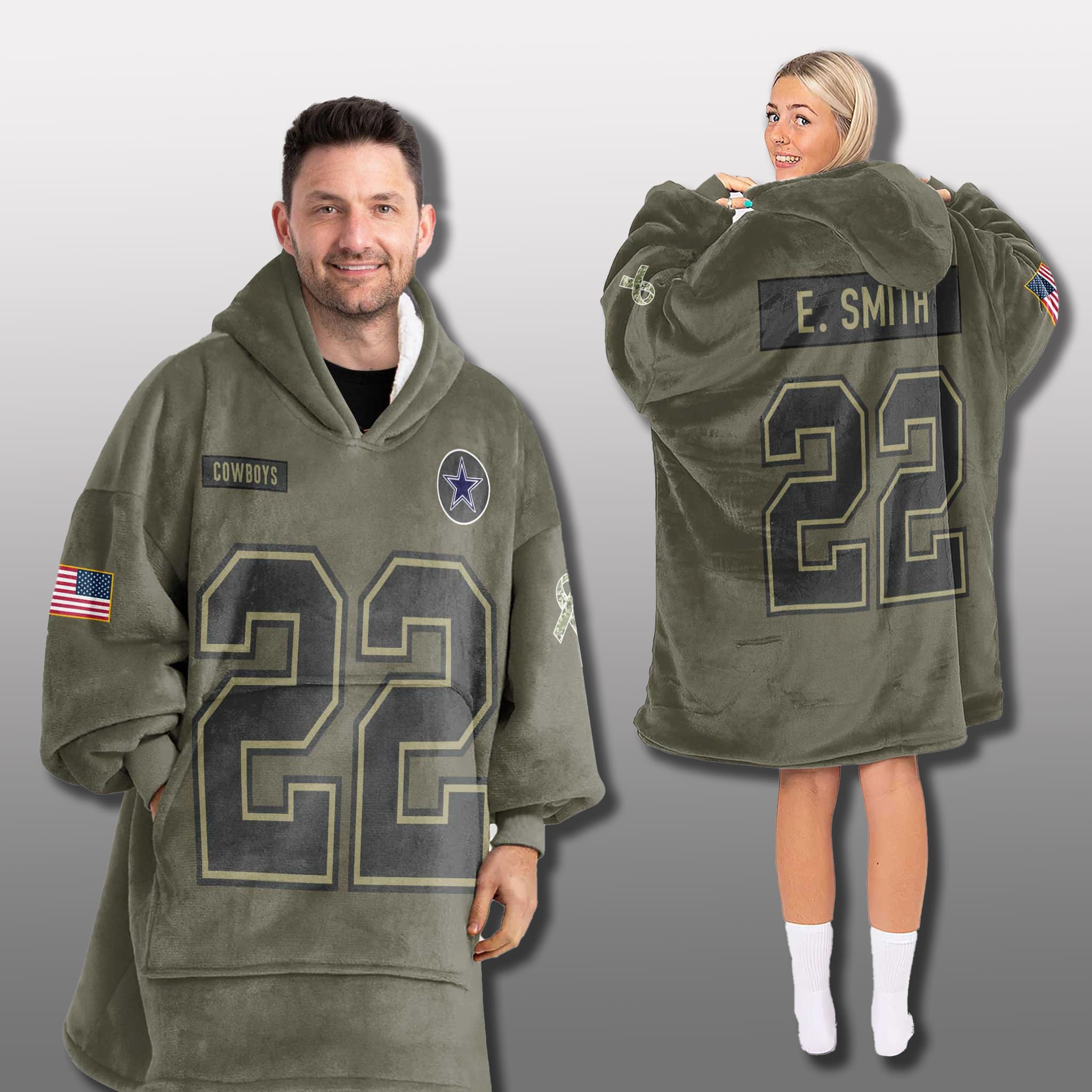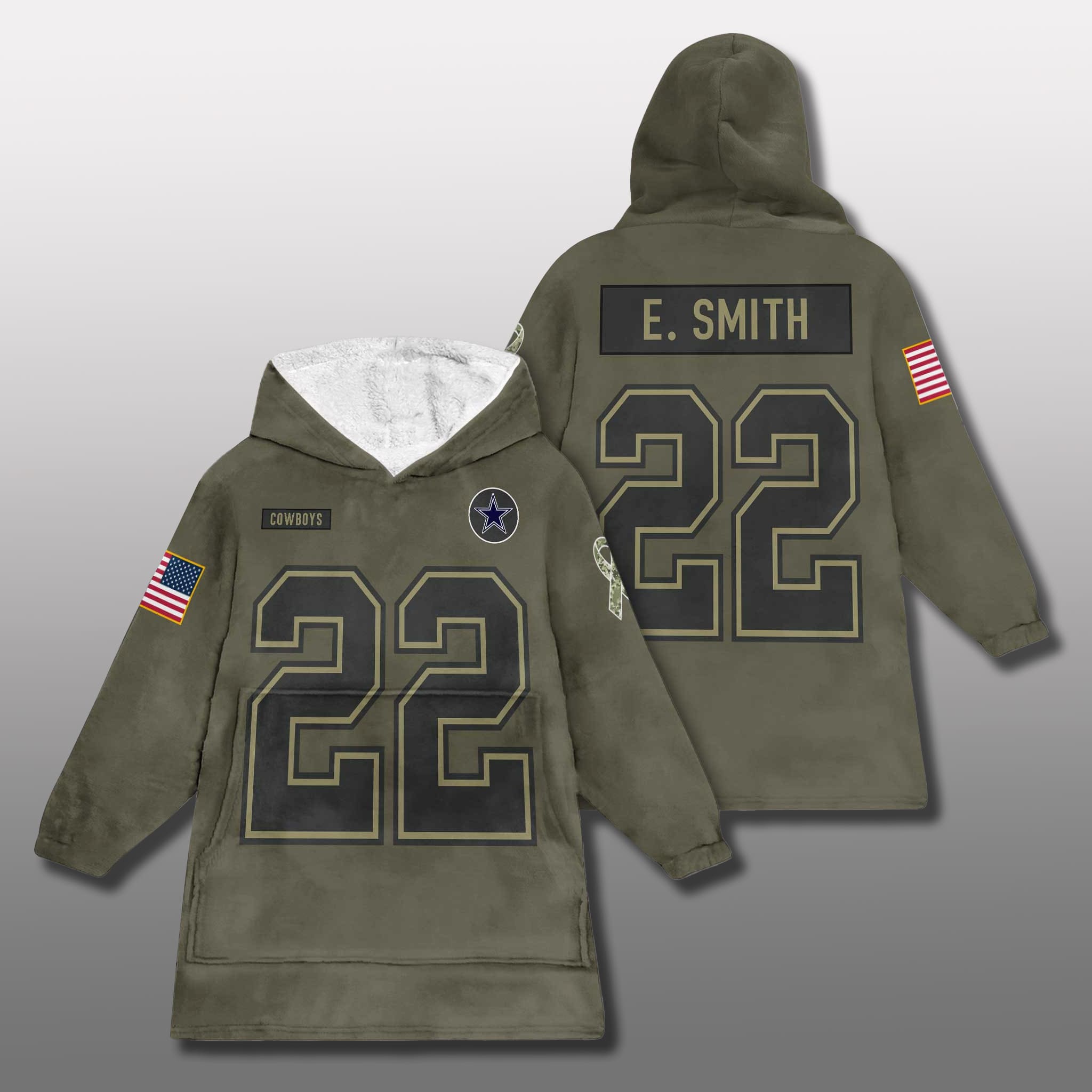 This blanket hoodie stands out in Olive Green, a military-inspired tone that sets it apart from the team’s traditional blue. Black and tan accents add contrast for a strong, bold look. The design features the American flag and the iconic Lone Star logo. The back is personalized with “E. SMITH” and the large number “22”, adding a legendary touch while maintaining maximum comfort and warmth.