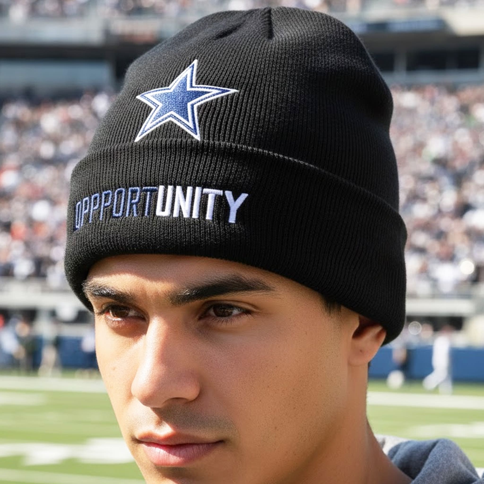 The Cowboys Opportunity Beanie Hat was created not only to honor “America’s Team” with its iconic silver star, but also to serve as a powerful thermal shield for winter. The standout feature is the meticulously embroidered word “OPPORTUNITY” on the cuff, symbolizing new chances that arise when we commit, persevere, and share.
