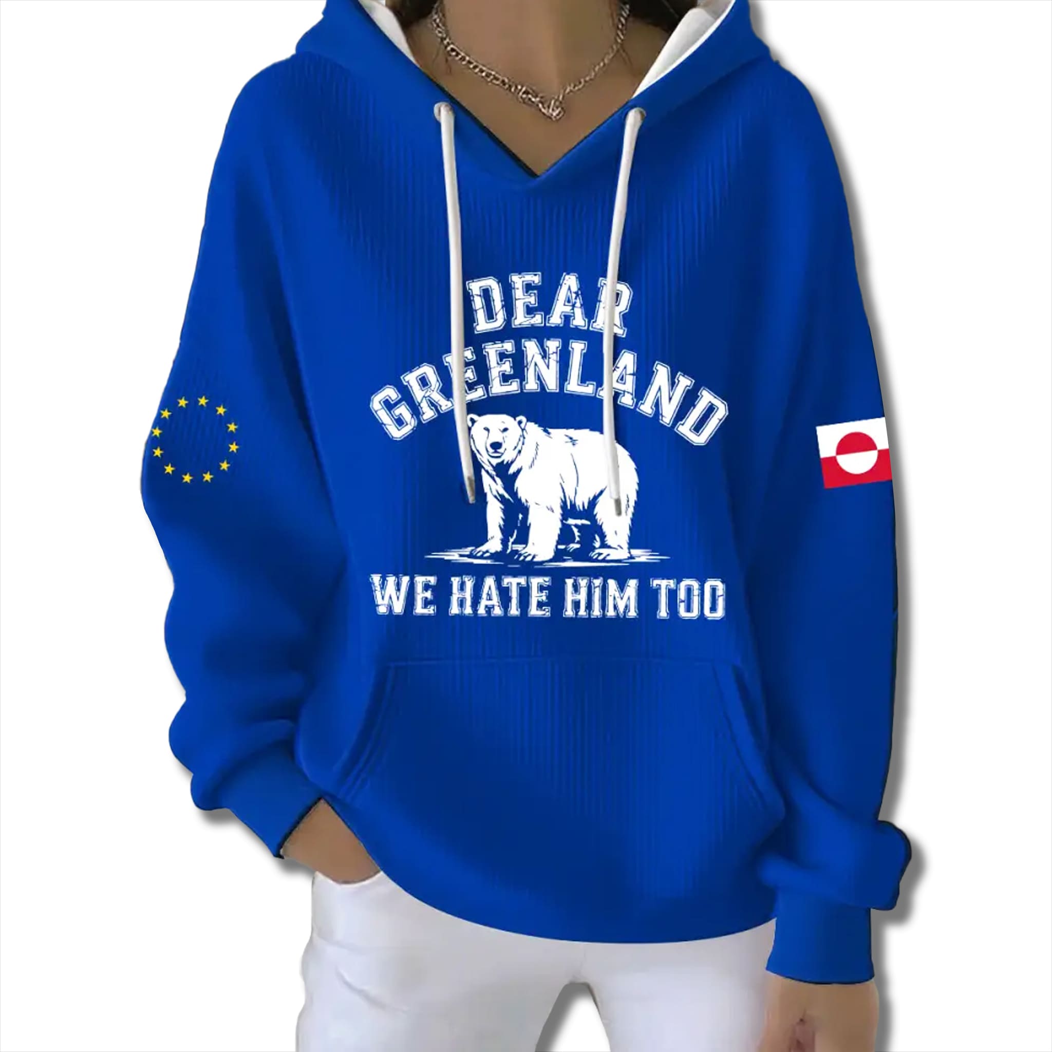 This design expresses American solidarity with Greenland through the message “Dear Greenland, We Hate Him Too” – implying shared dislike of Trump due to his authoritarian behavior. The hoodie features a humorous vintage style on a standout blue background, with a central polar bear graphic and EU and Greenland flags on the sleeves, aligning with the spirit of playful activism.