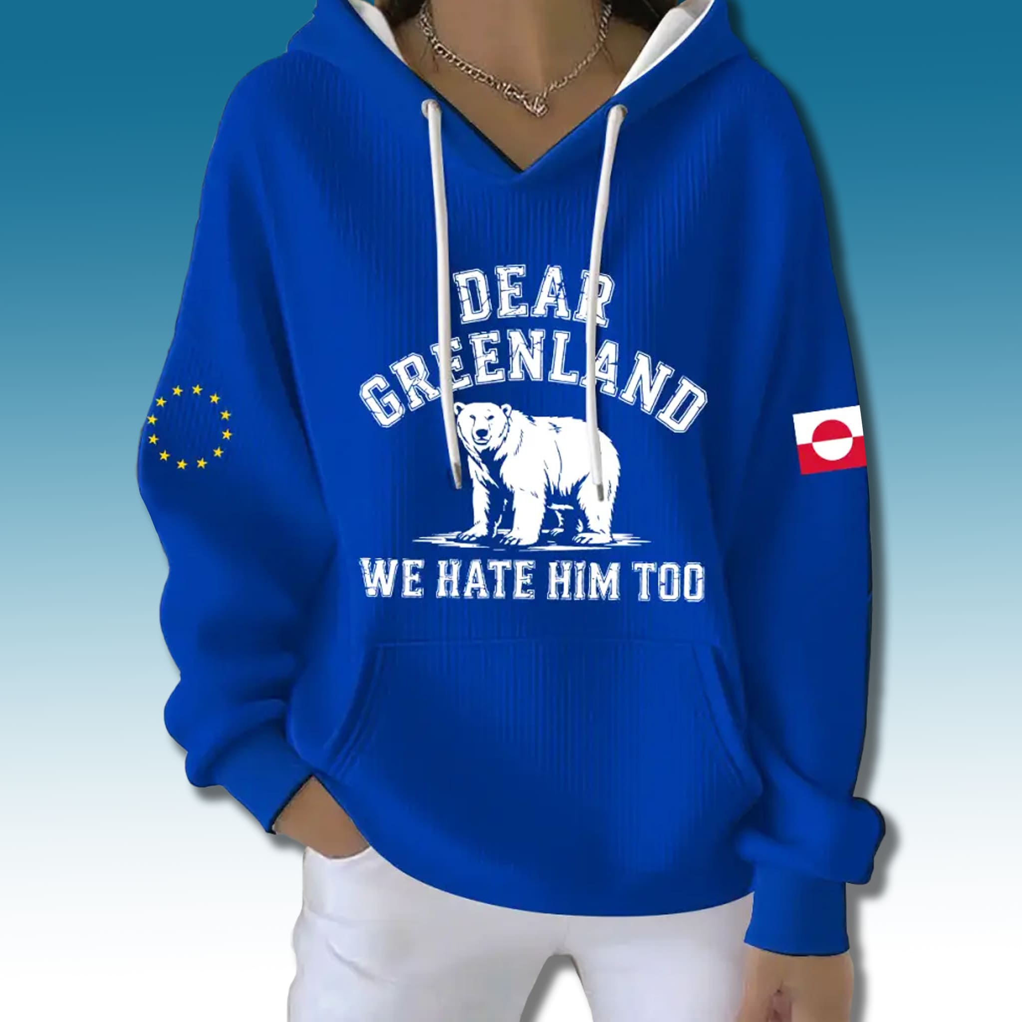 Dear Greenland We Hate Him Too Waffle Hoodie – A Humorous Political Satire Message From the U.S. to Greenland