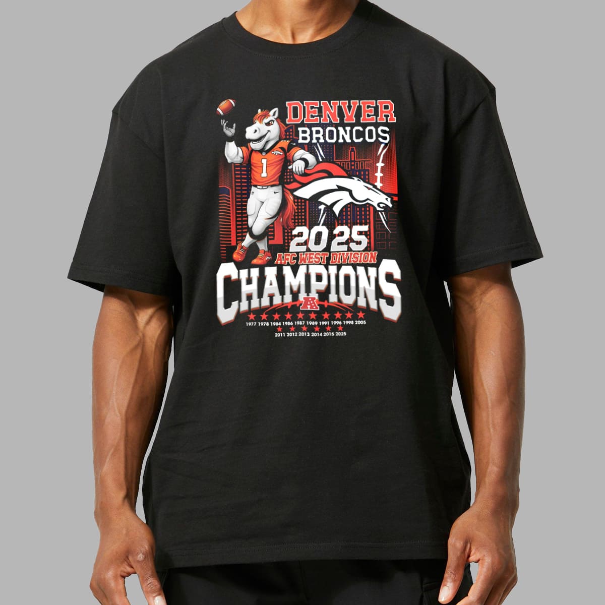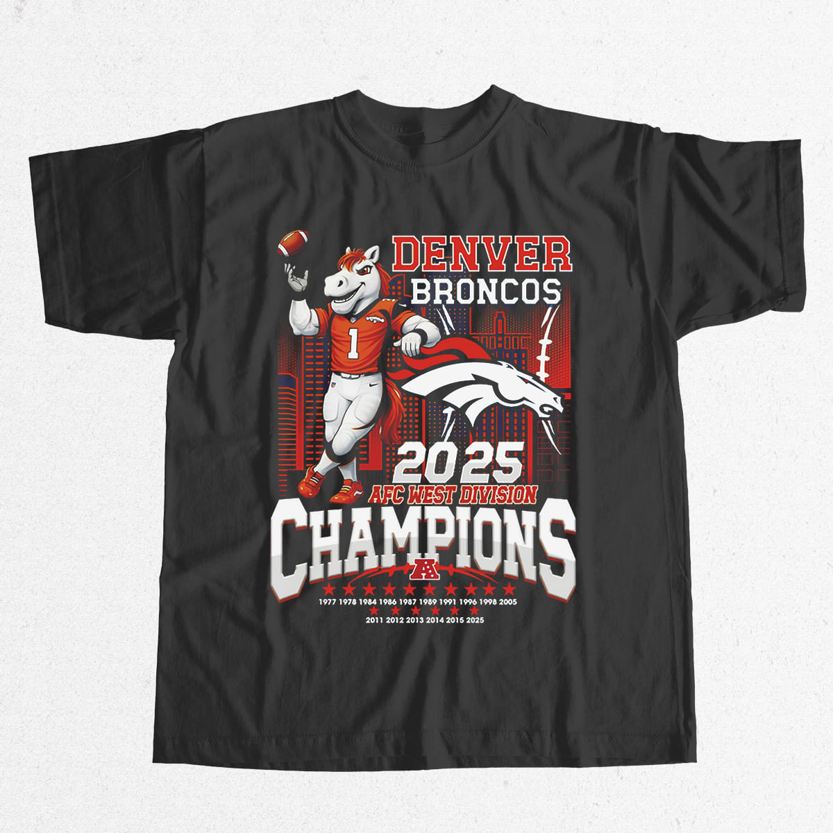 The standout feature of this shirt is the chronological list of Broncos’ AFC West championship years, stretching from the early dominance of 1977, 1978, through the modern era, and culminating in the newest milestone: 2025. This design transforms the shirt into a living timeline of Broncos history—an irreplaceable piece for fans who have stayed loyal through every era, rebuild, and comeback.