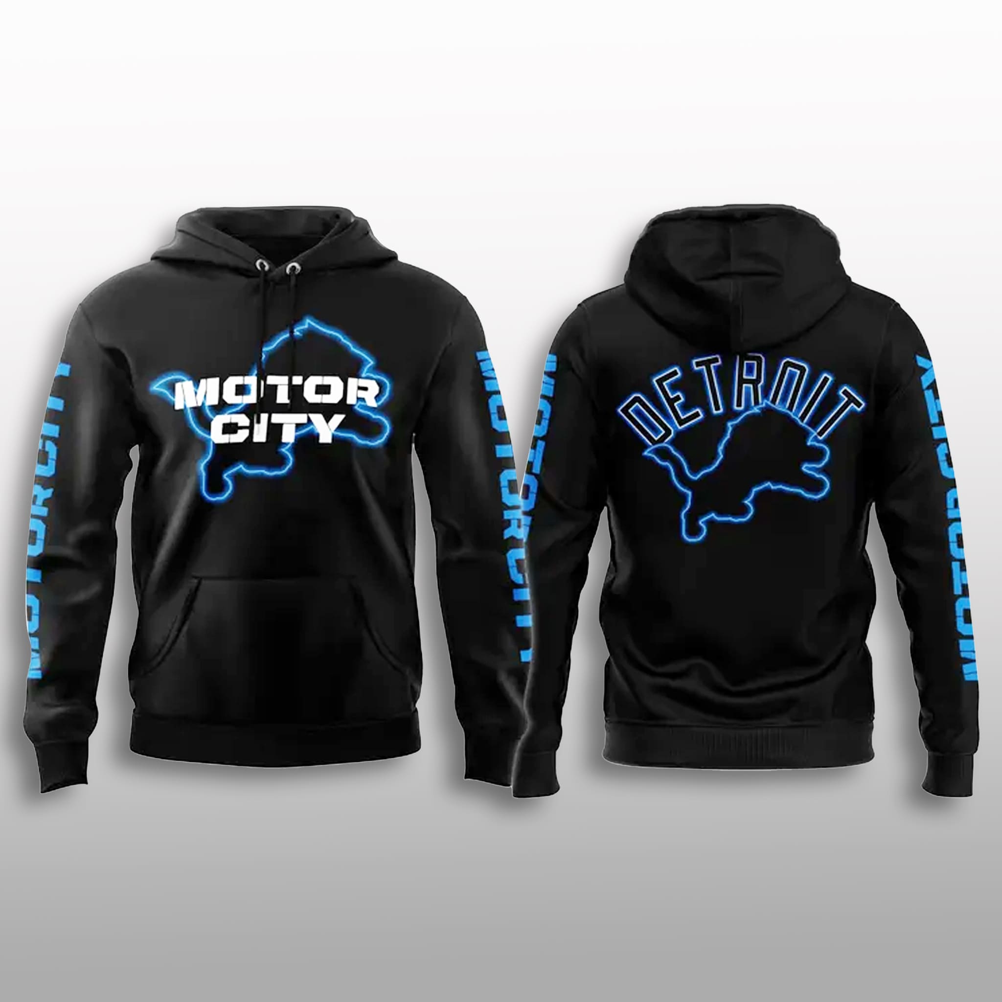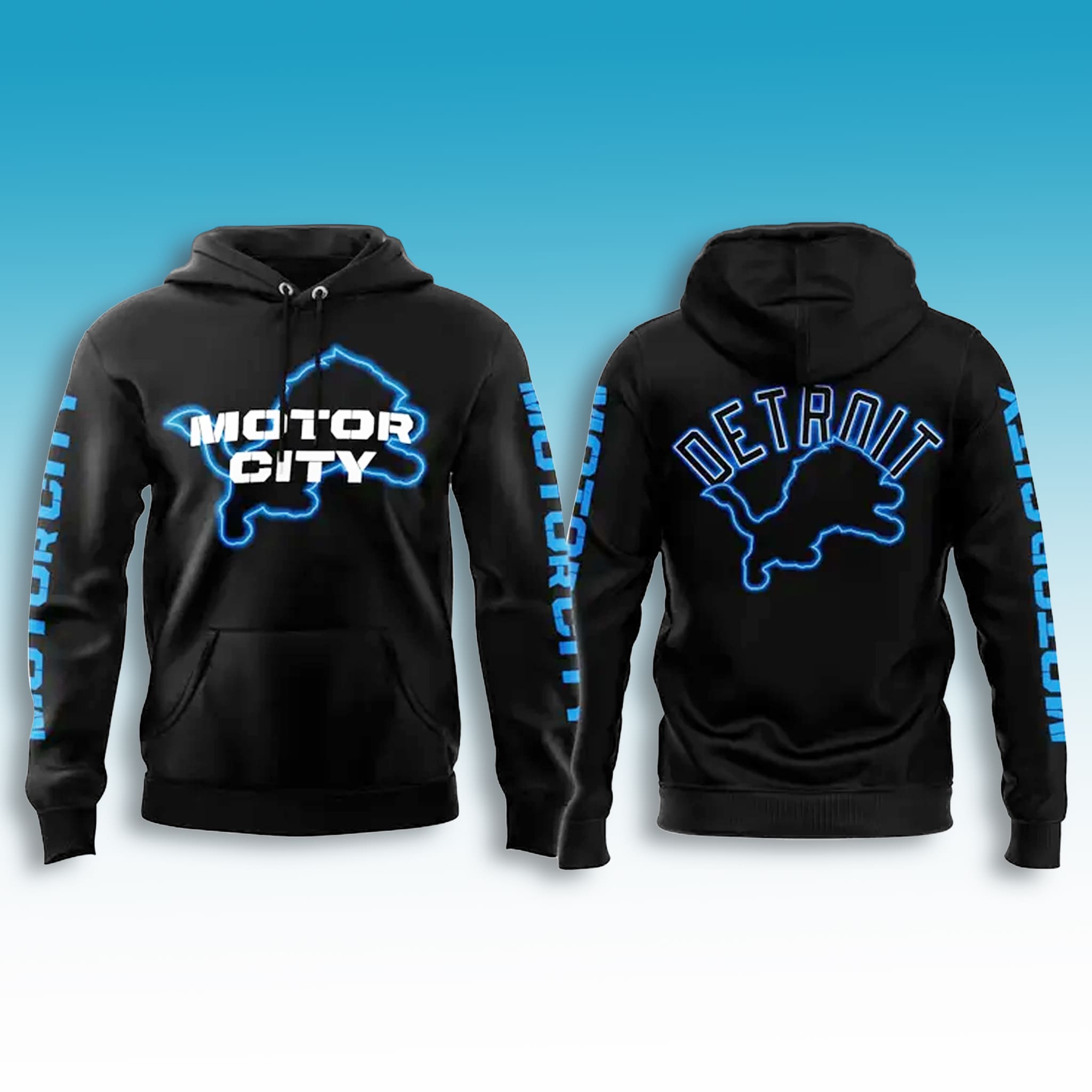 This unisex hoodie uses a classic black base with glowing blue neon outlines of the lion silhouette and “MOTOR CITY” text for a dynamic, electrified look. The back features an arched “DETROIT” script above the lion graphic, enhanced by sleeve prints for full-circle team branding in a modern, street-ready style.