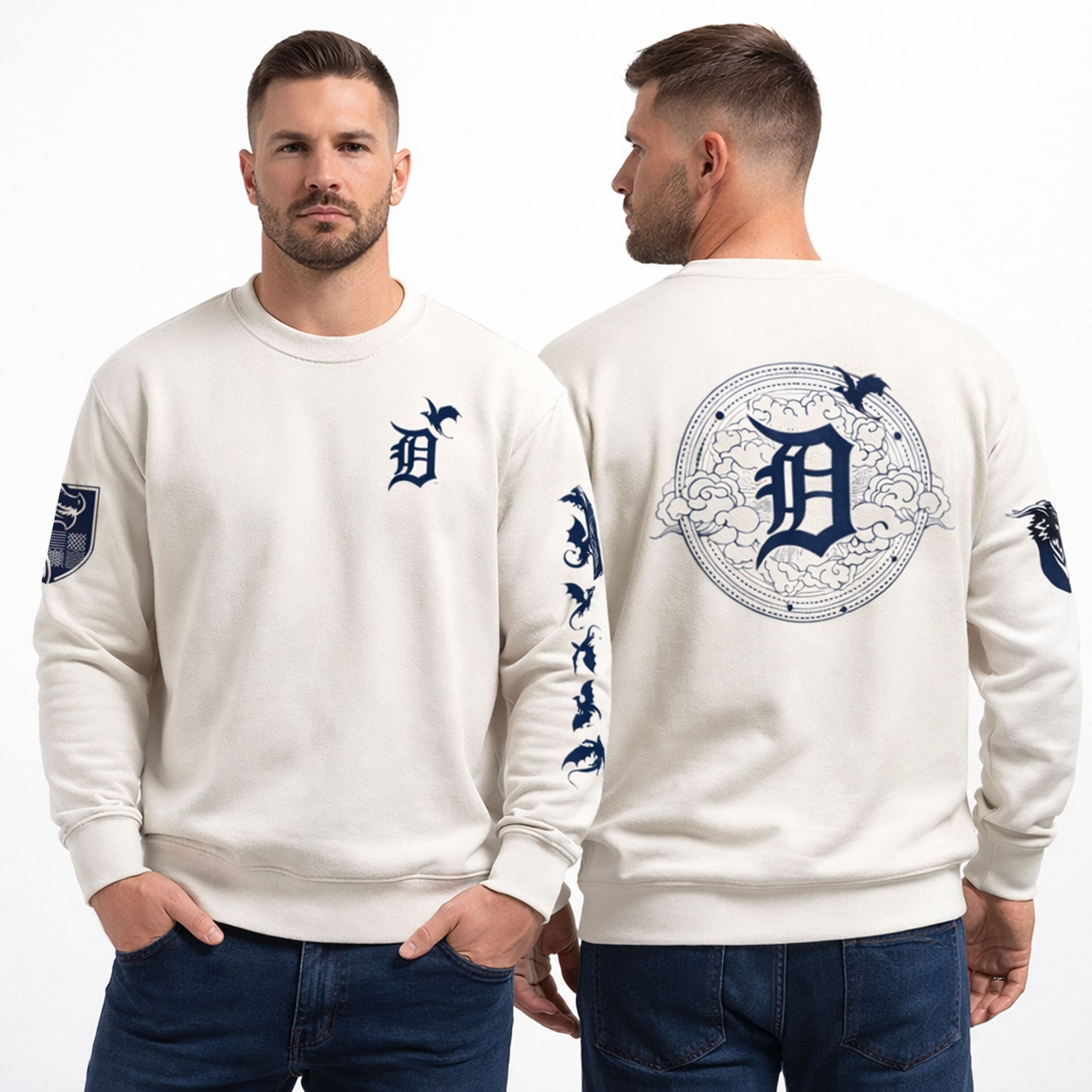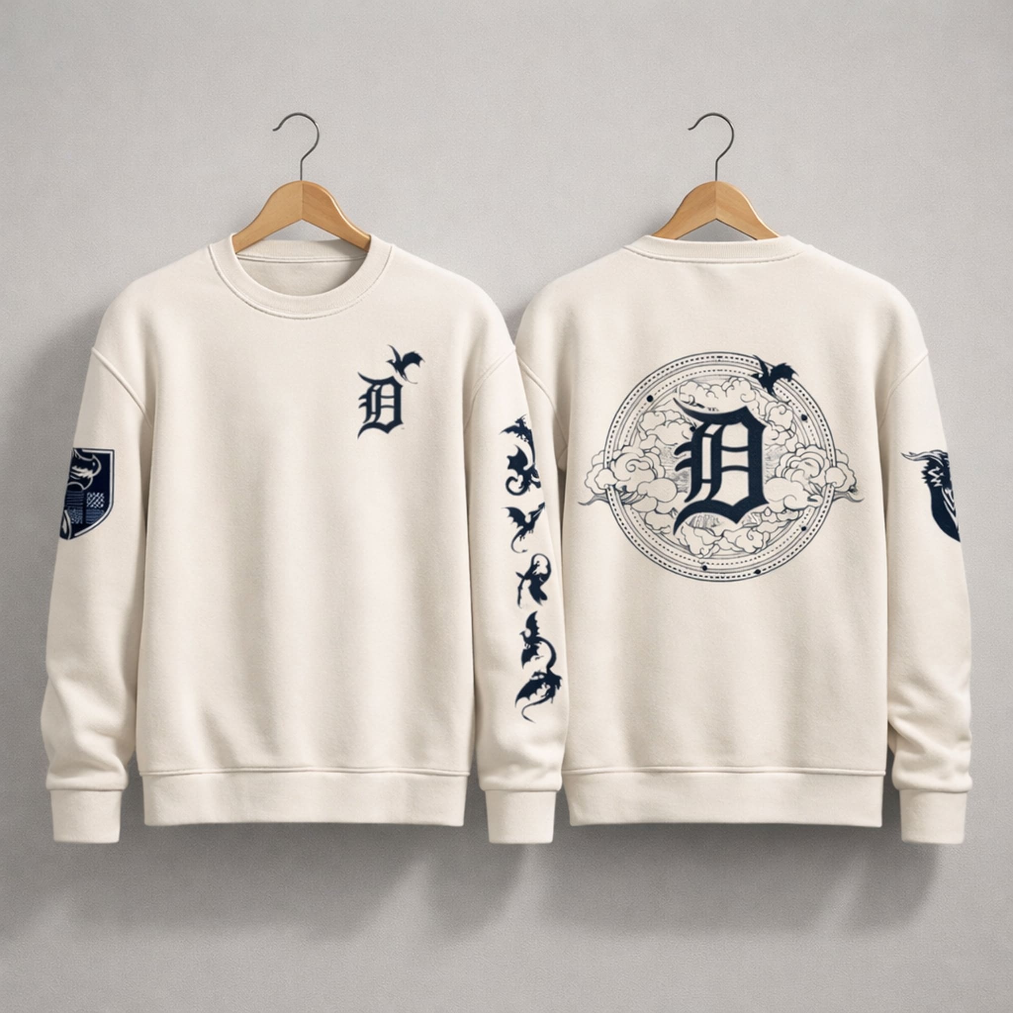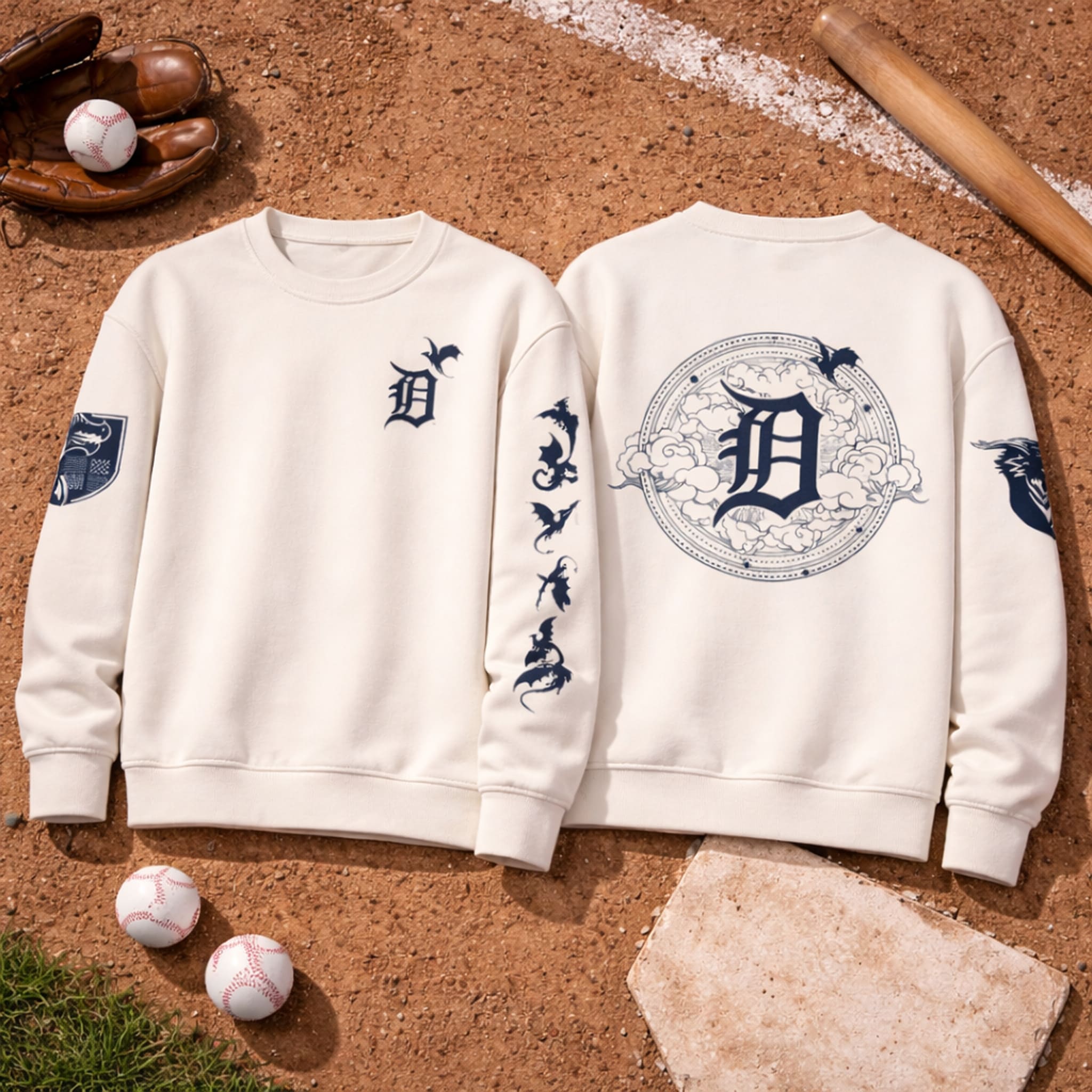 The sweatshirt features a design that is both sporty and epic – A perfect blend of baseball and the legend of Fourth Wing. It comes in an elegant cream tone that allows the black graphics to stand out subtly. A majestic dragon image runs along the sleeves, while the Tigers emblem is surrounded by ancient symbols, creating a bold and distinctive look unlike typical sweatshirts. Made from premium cotton blend material, it provides excellent warmth and a soft feel, allowing you to confidently express your love for fantasy right at the ballpark.
