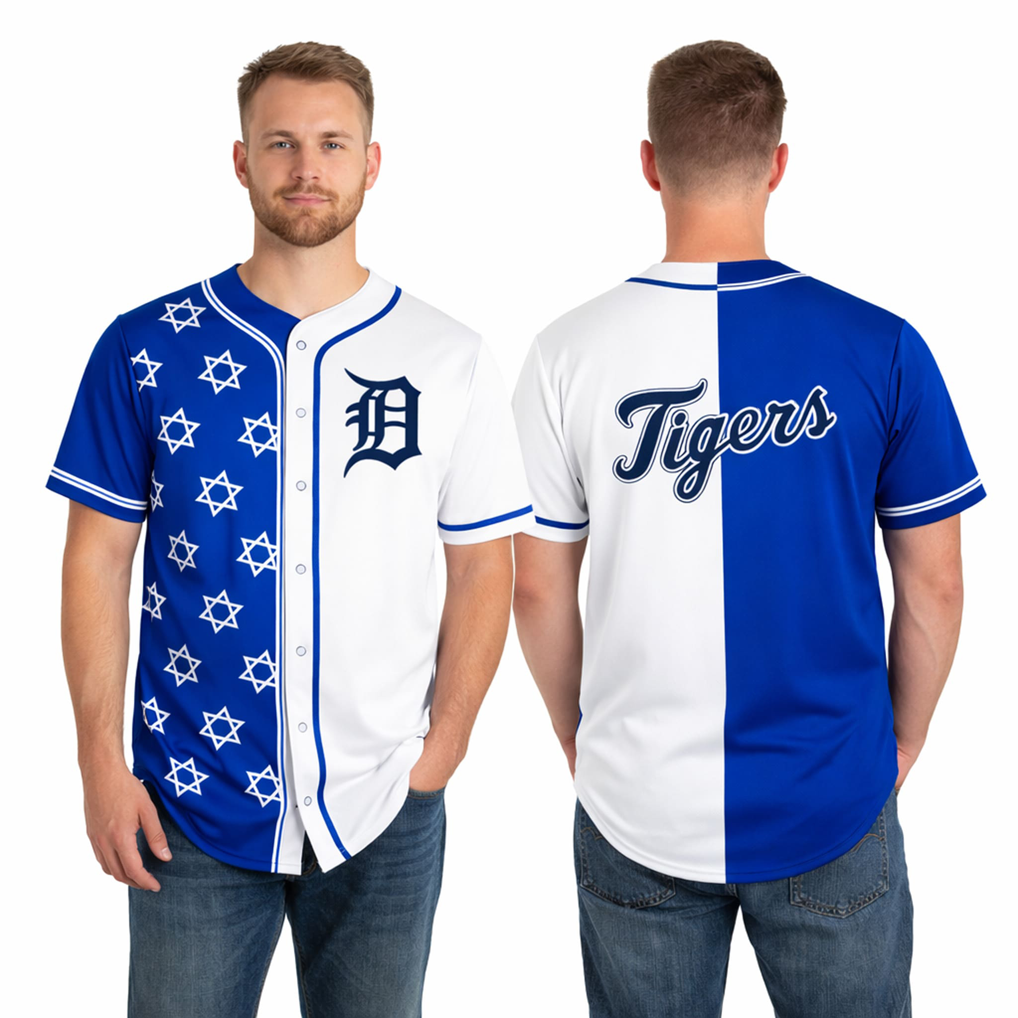 This jersey is thoughtfully and respectfully designed: a pure white base symbolizes purity and peace, with one side featuring a repeating navy Star of David pattern, combined with the Tigers’ classic logo to create a perfect balance between Jewish symbolism and team identity. If you cannot attend Comerica Park, you can still own this meaningful item by purchasing it directly at iFrogtees – bringing the spirit of Jewish Heritage, the Star of David symbol, and Tigers pride everywhere you go.