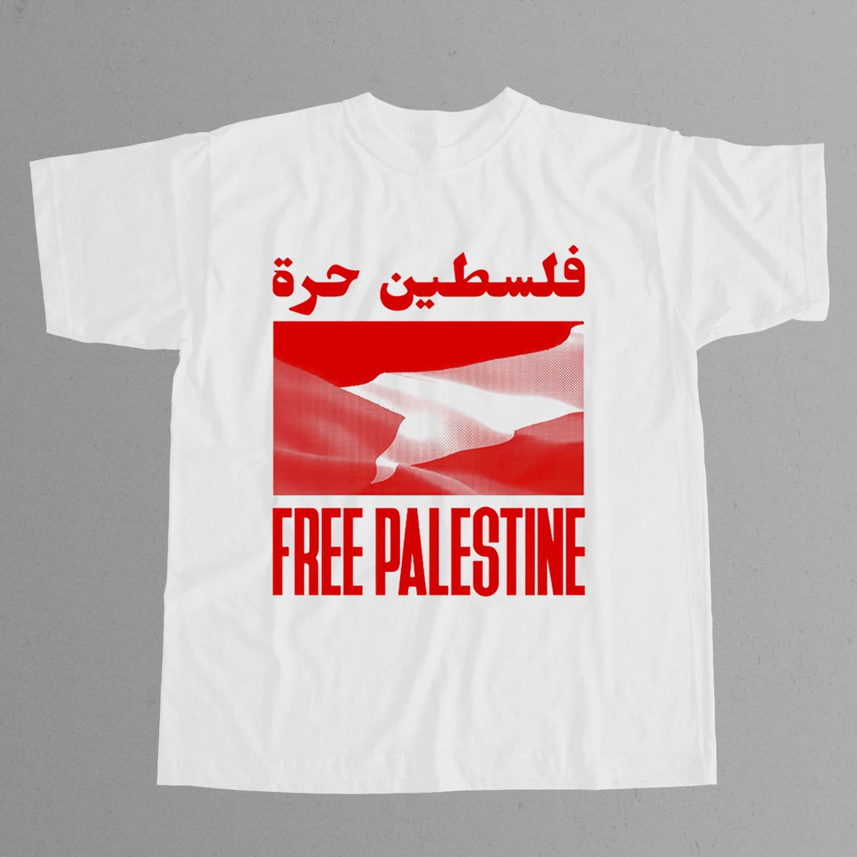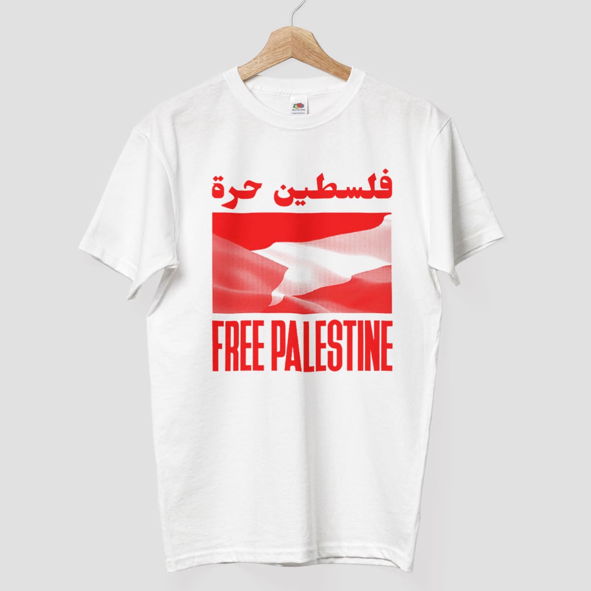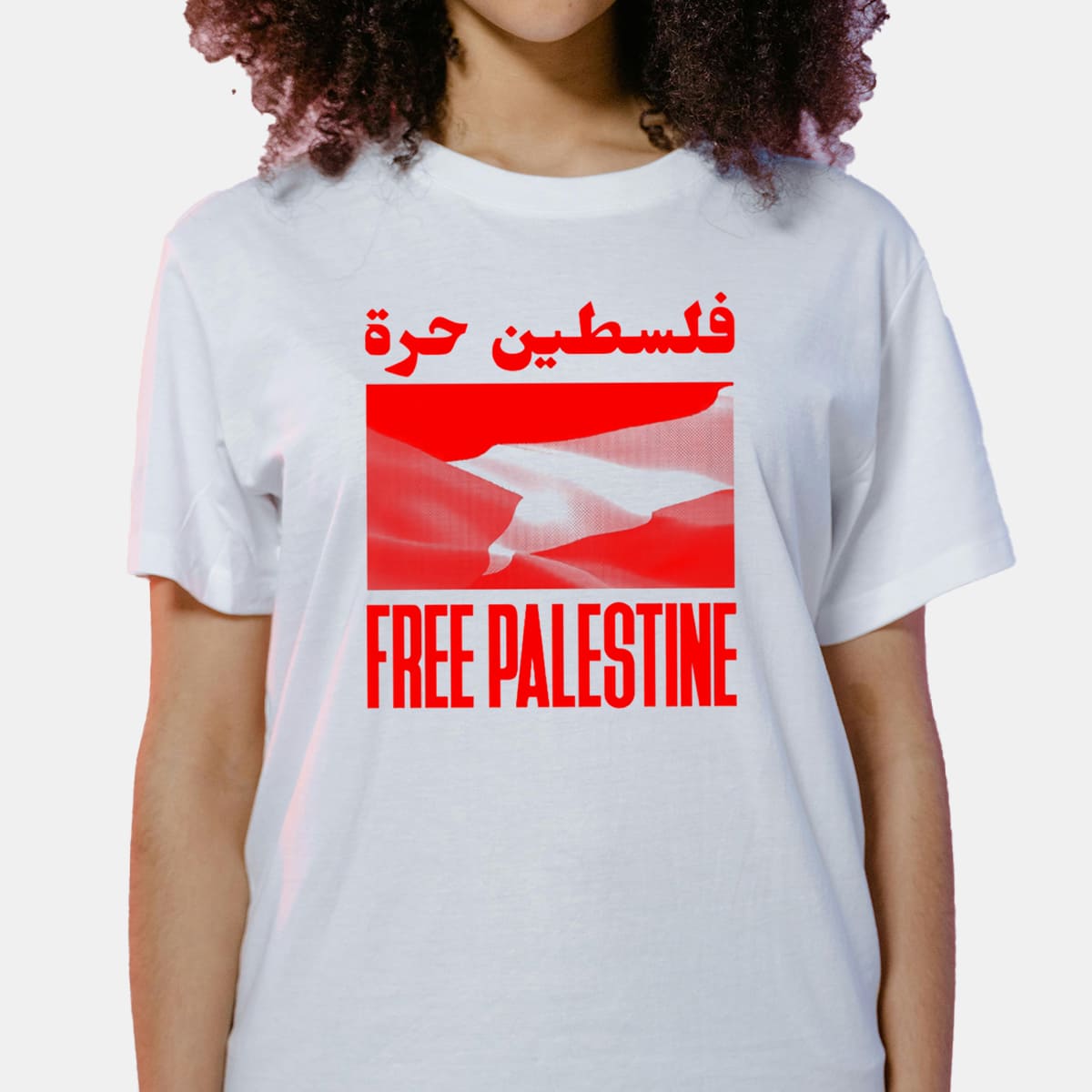 This crisp white tee features bold red Arabic and English lettering for an iconic graphic element, offering a minimal yet striking look. The bold, clean style is inspired by protest aesthetics, blending cultural iconography with contemporary style, bringing versatility to everyday wear.