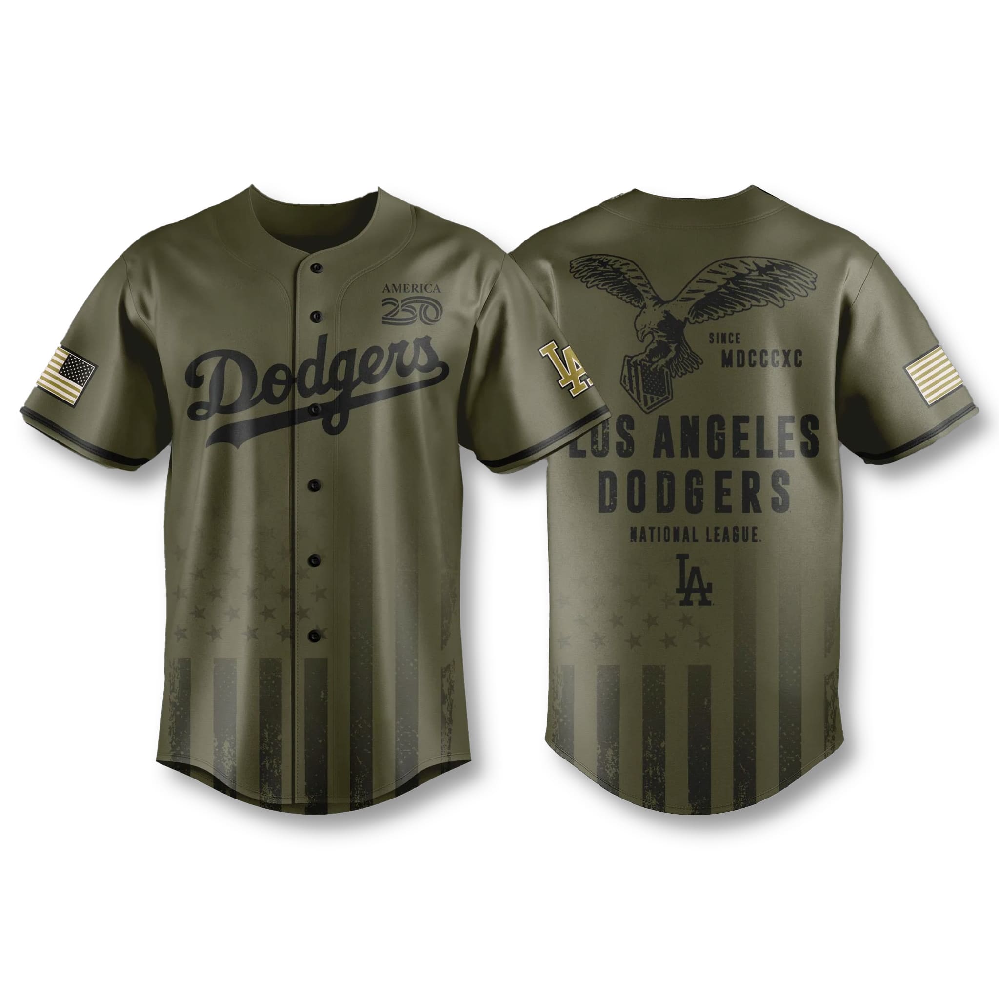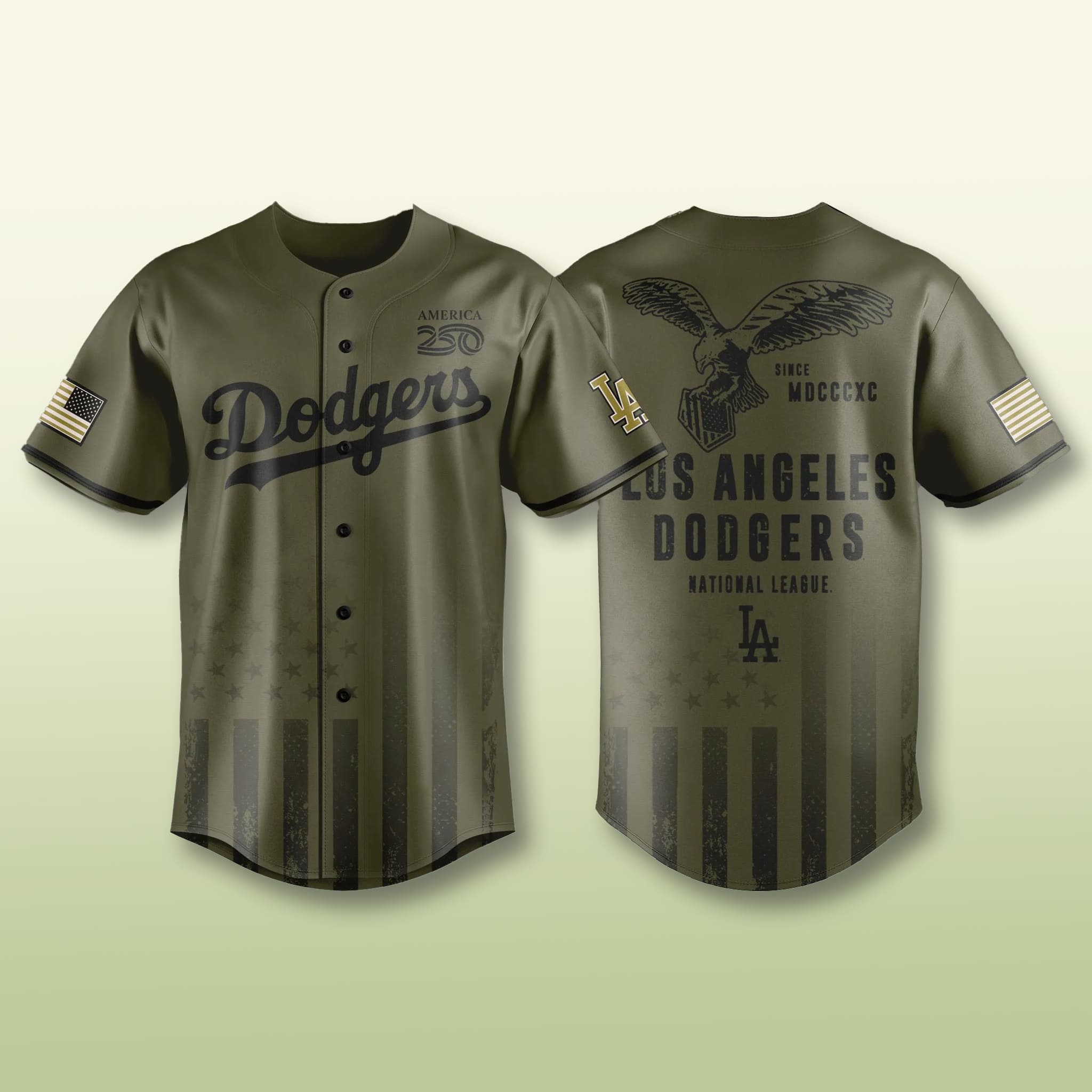 The Dodgers Armed Forces Jersey 2026 is a masterpiece honoring courage, a perfect combination of the identity of the “City of Angels” team and the eternal symbol of American strength. For the 250th anniversary of Independence Day (America 250), this design uses the majestic eagle as the main image, symbolizing freedom and far-reaching vision. With the Roman numerals MDCCCXC (1890) marking the year the team joined the National League, the jersey not only tells the story of a heritage journey of more than a century but also serves as a deep tribute to the soldiers who guard peace day and night.