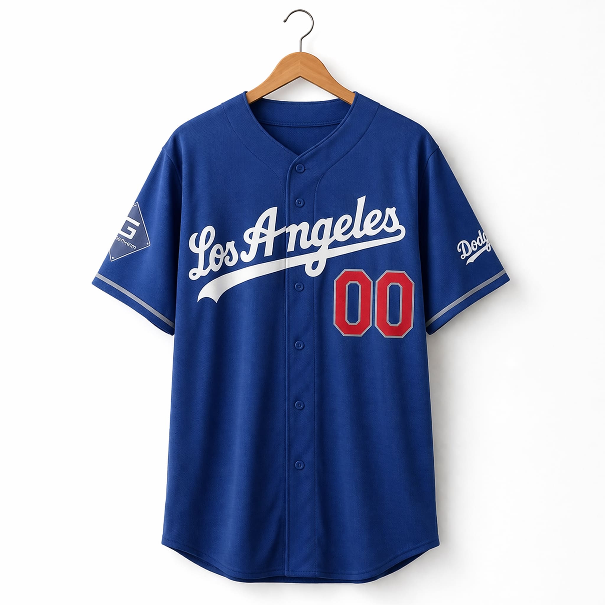 The design draws inspiration from spring training styles and 1990s road uniforms, delivering a clean, powerful, and pride-filled look. It features the classic “Los Angeles” script in white with red trim across the chest, bold red numbers outlined in gray, and sleeve details including the Dodgers script patch and a Guggenheim Partners patch. Fans can also purchase customizable versions with personalized name and number at iFrogtees, available in full size ranges.