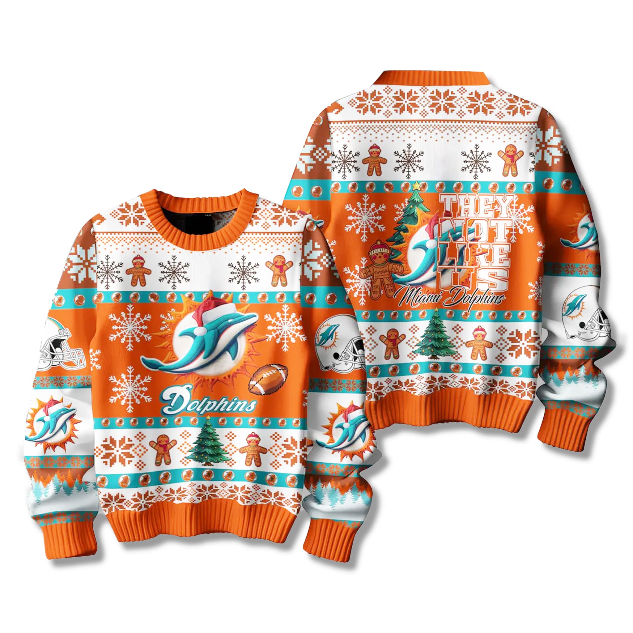 The sweater explodes with the Dolphins’ signature orange and aqua, creating a cheerful yet bold holiday pattern. The design features the iconic leaping dolphin logo wearing a Santa hat, surrounded by festive motifs like gingerbread men, Christmas trees, and snowflakes. The back proudly features the defiant slogan “THEY NOT LIKE US” in bold lettering, ensuring your team’s swagger is on full display.
