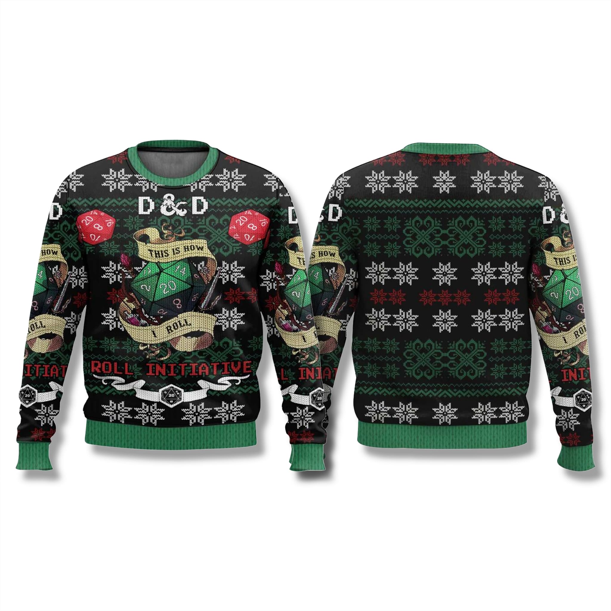 This nerdy Christmas sweater is a visual feast for any tabletop gamer. Flanking this central motif are two additional red D20s, driving home the theme of chance and fate. The vibrant red and green color scheme is immediately festive, beautifully accented by white snowflakes and patterned borders featuring crossed swords and the iconic Dungeons & Dragons ampersand