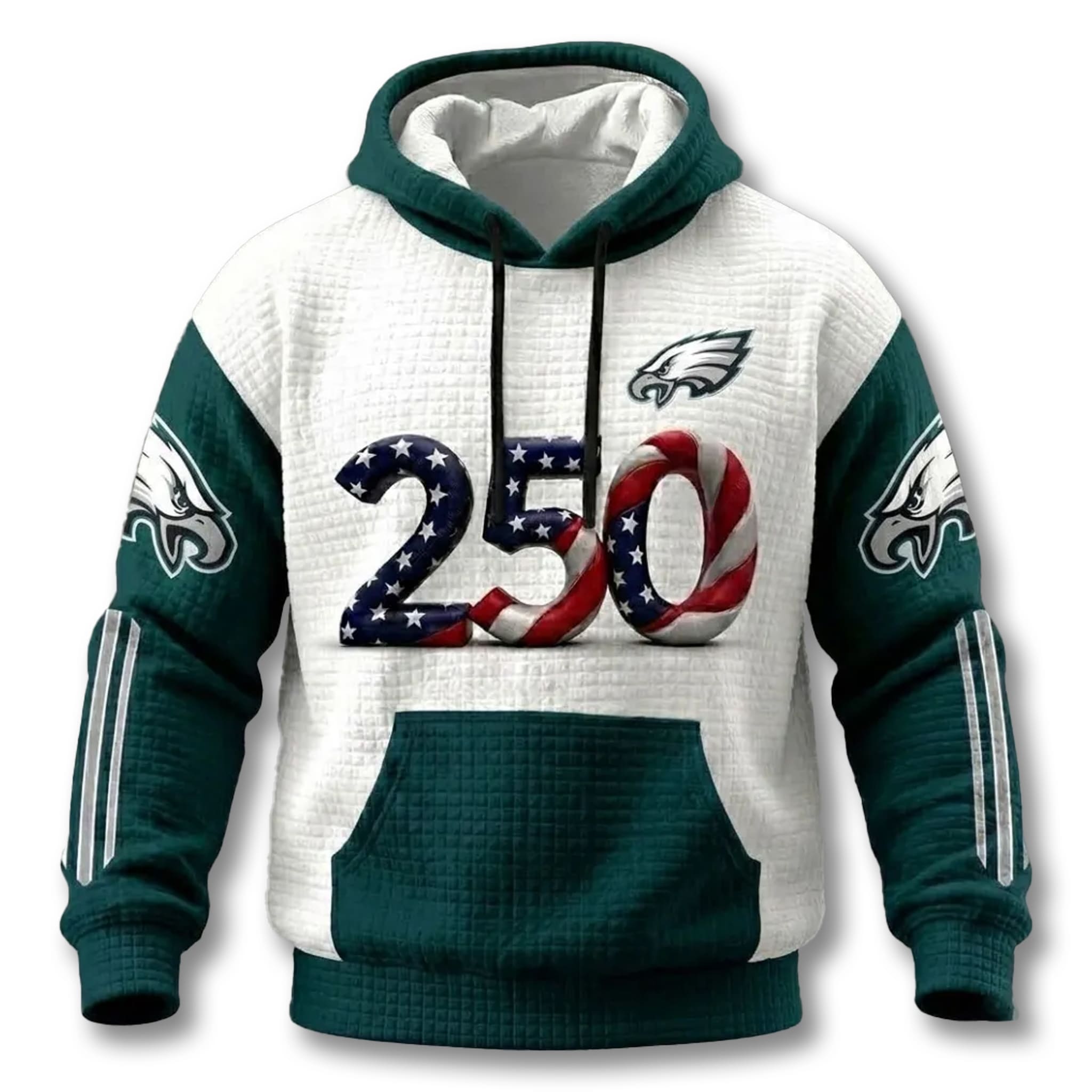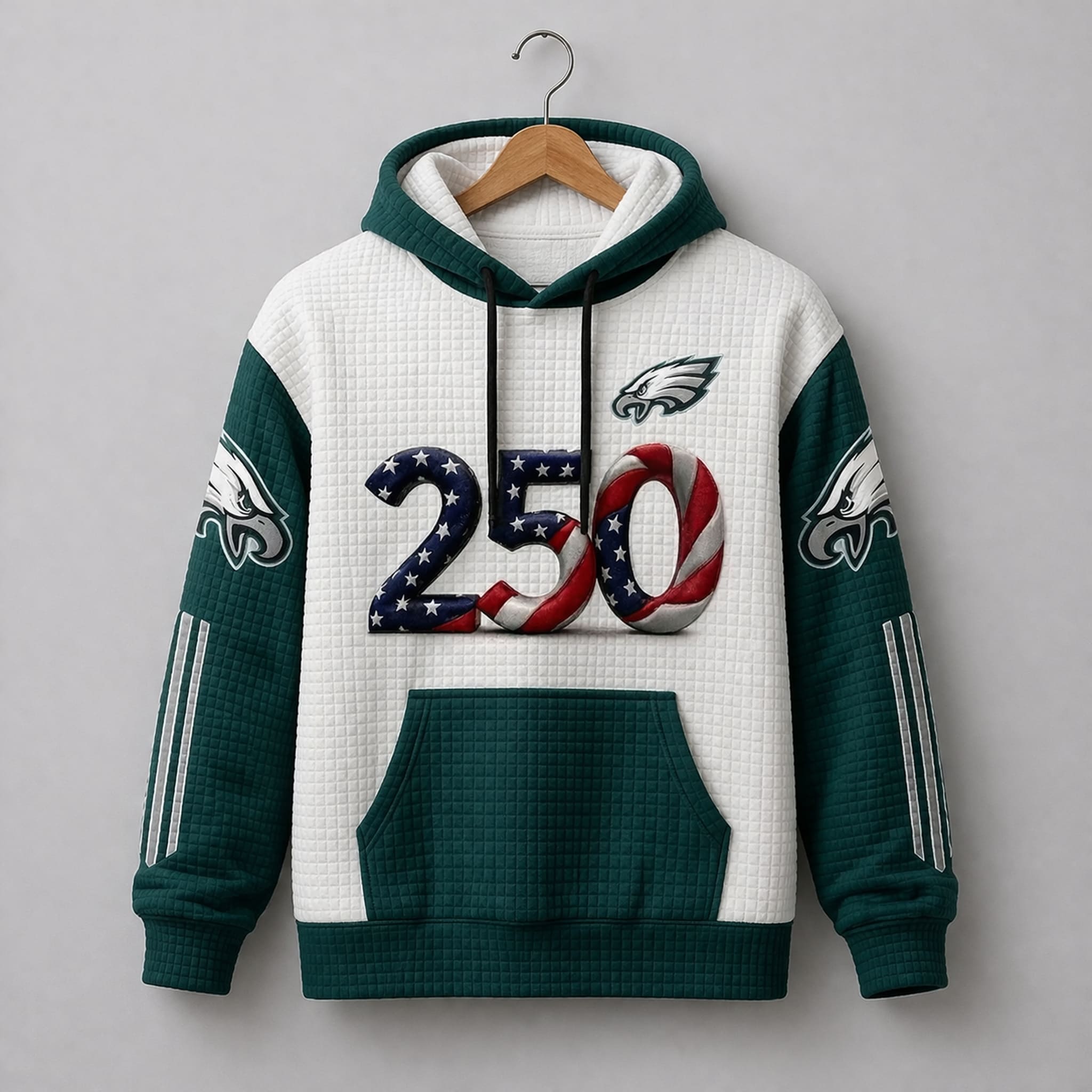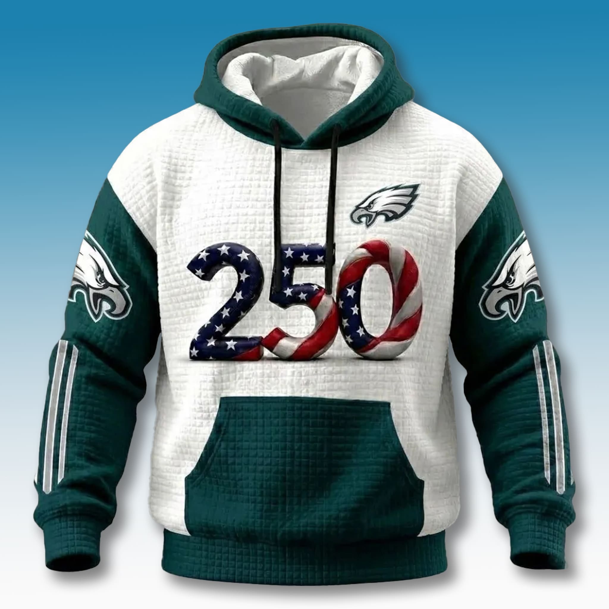 The year 2026 marks the 250-year milestone of the United States’ great history, and there is no place more fitting to honor this event than Philadelphia – the birthplace of the Declaration of Independence. The Eagles USA 250th Anniversary Waffle Hoodie was created as a dual symbol. With the number 250 stylized in vibrant national flag patterns, this product is a refined combination of deep patriotism and the passionate sports spirit of the fan community in Philly.