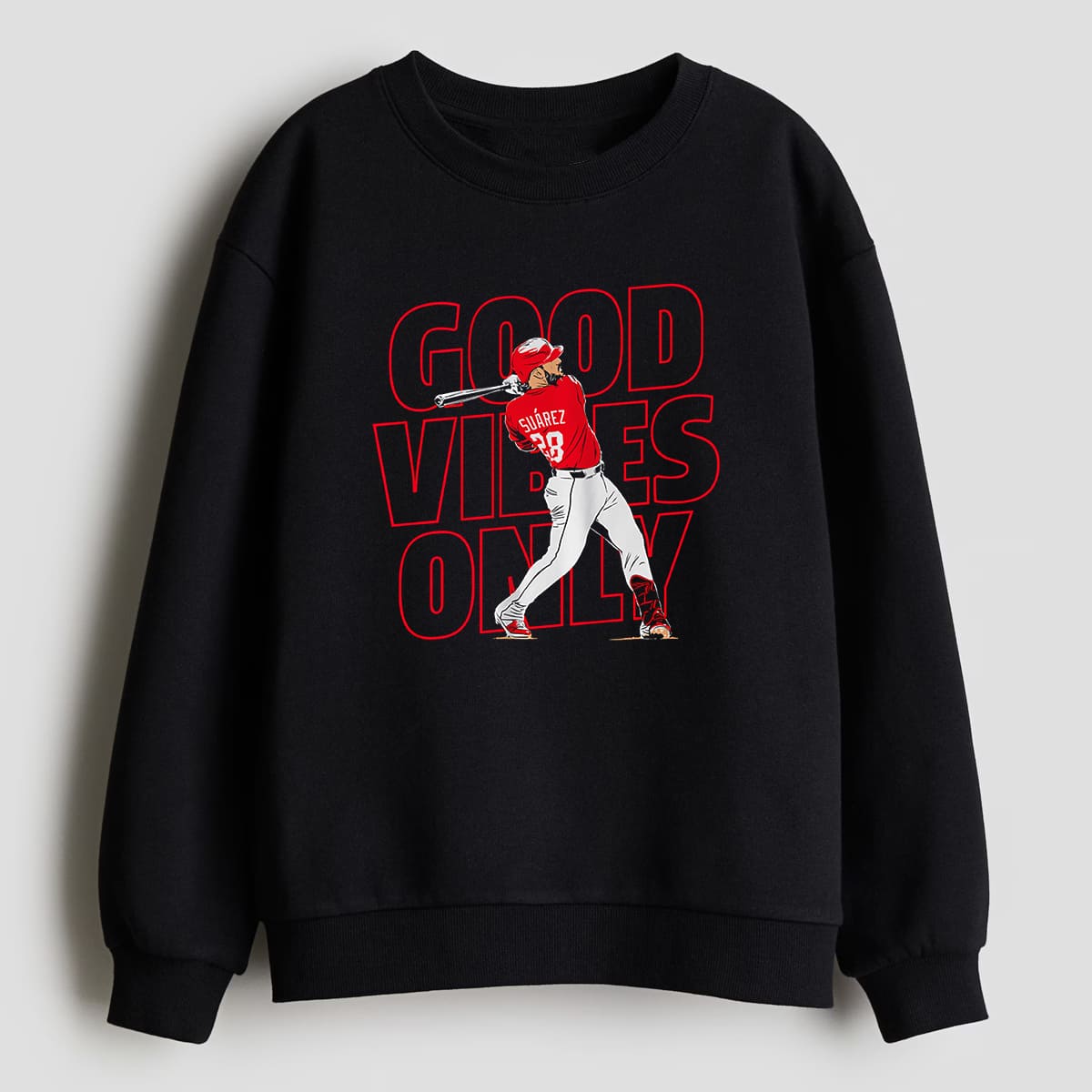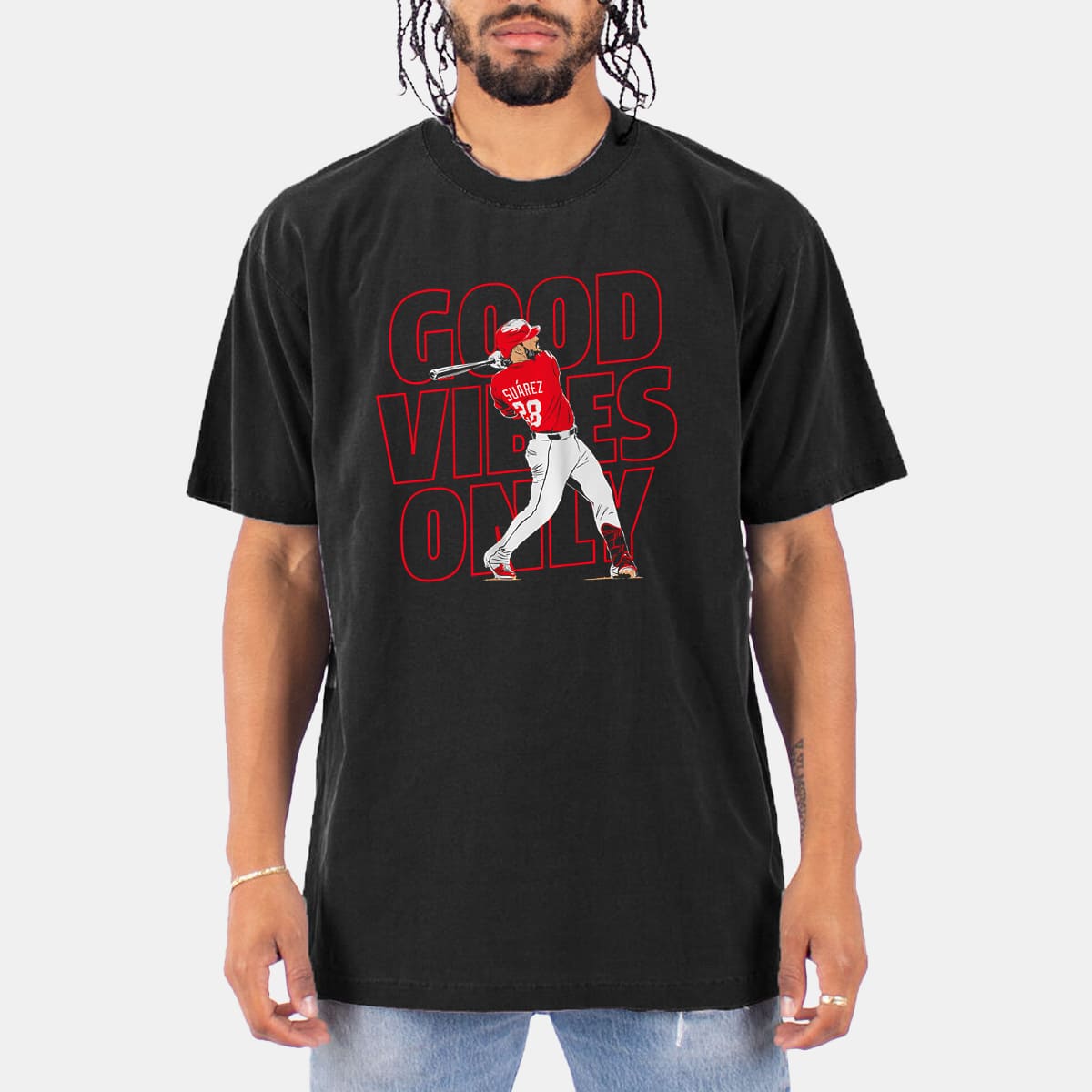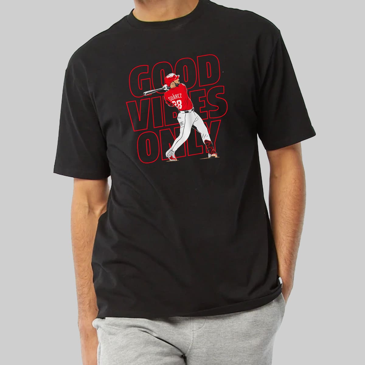 This shirt features a bold black base with an illustration of Eugenio Suárez in a powerful swing pose (wearing the Reds red No. 28 jersey), surrounded by the bright red text “GOOD VIBES ONLY.” With a modern streetwear vibe and a comfortable oversized fit, it’s easy to style casually or wear to games.