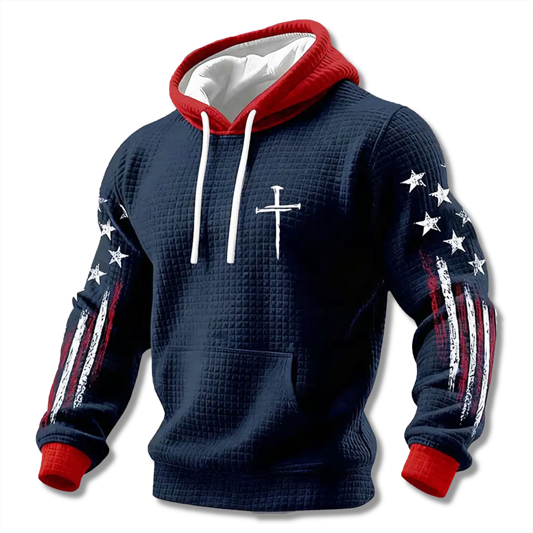 The hoodie is crafted from a unique textured waffle-knit fabric in a classic deep navy tone, offering impressive structure and excellent warmth. It features an elegant white cross symbol at the center, paired with distressed American flag graphics boldly running down both sleeves – representing national spirit and the enduring strength of faith.