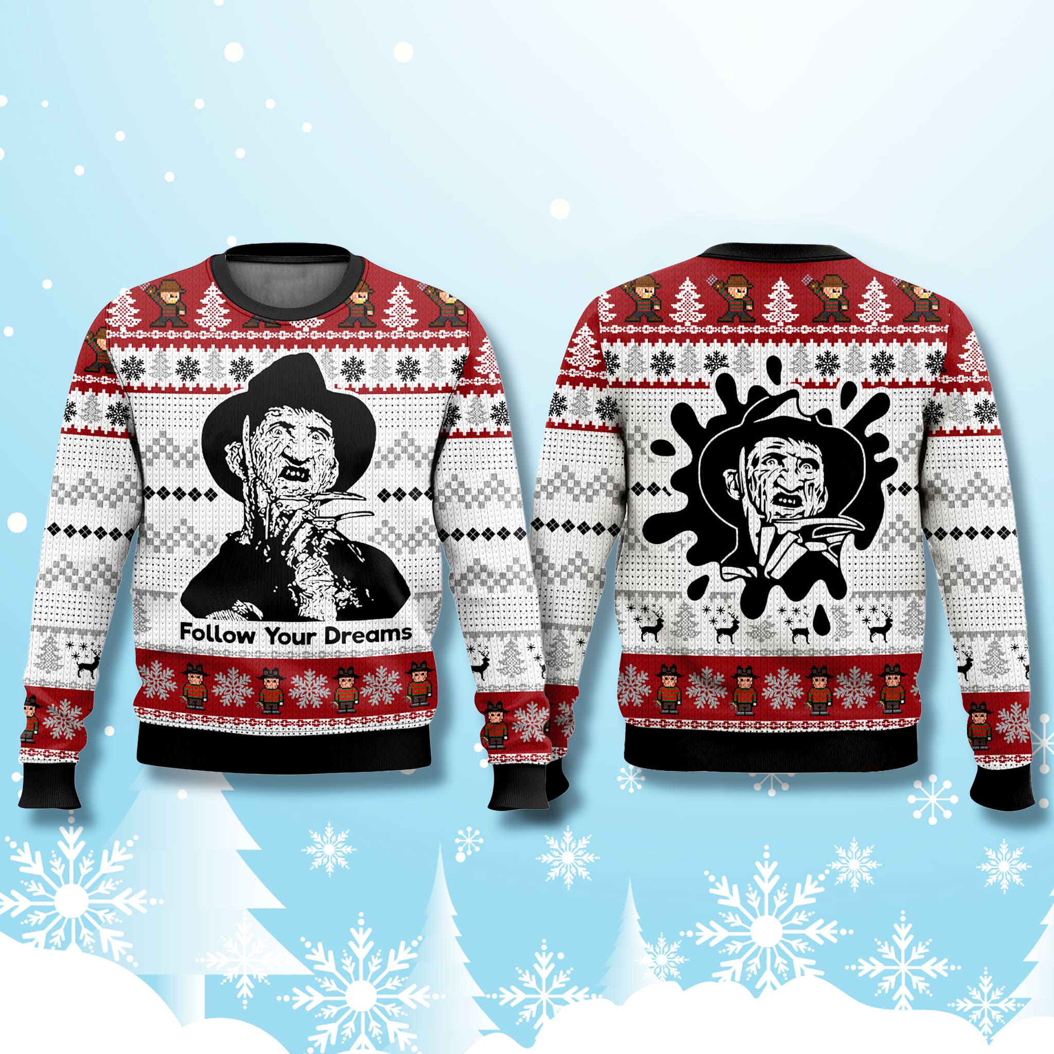 A Nightmare on Elm Street Christmas: Embrace the Dark Side of the Holidays. Are you tired of saccharine sweetness and predictable holiday cheer? Then the Freddy Krueger Follow Your Dreams Ugly Christmas Sweater is your perfect anti-holiday statement! This sweater masterfully blends the spooky terror of A Nightmare on Elm Street with the cozy absurdity of a classic Ugly Christmas Sweater.