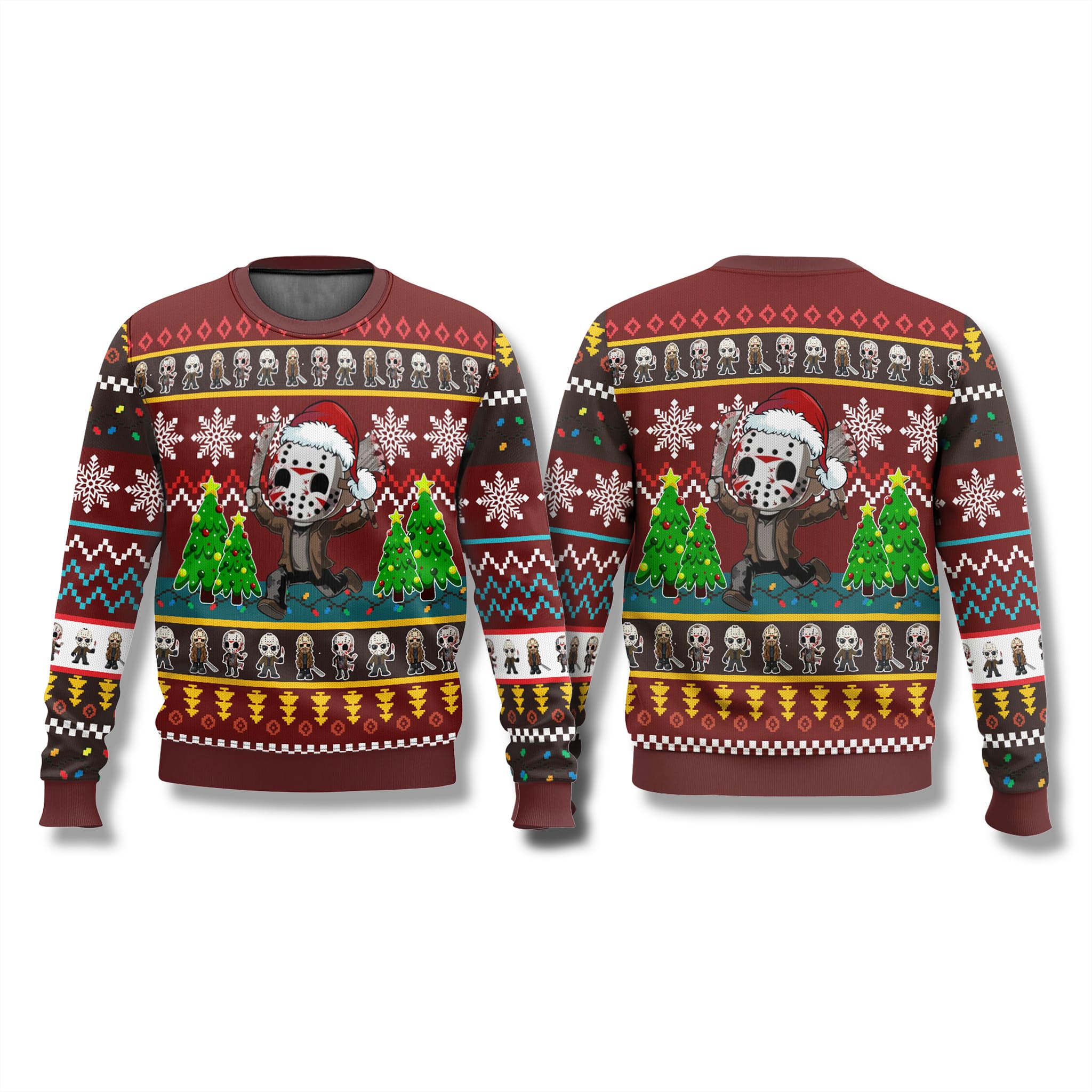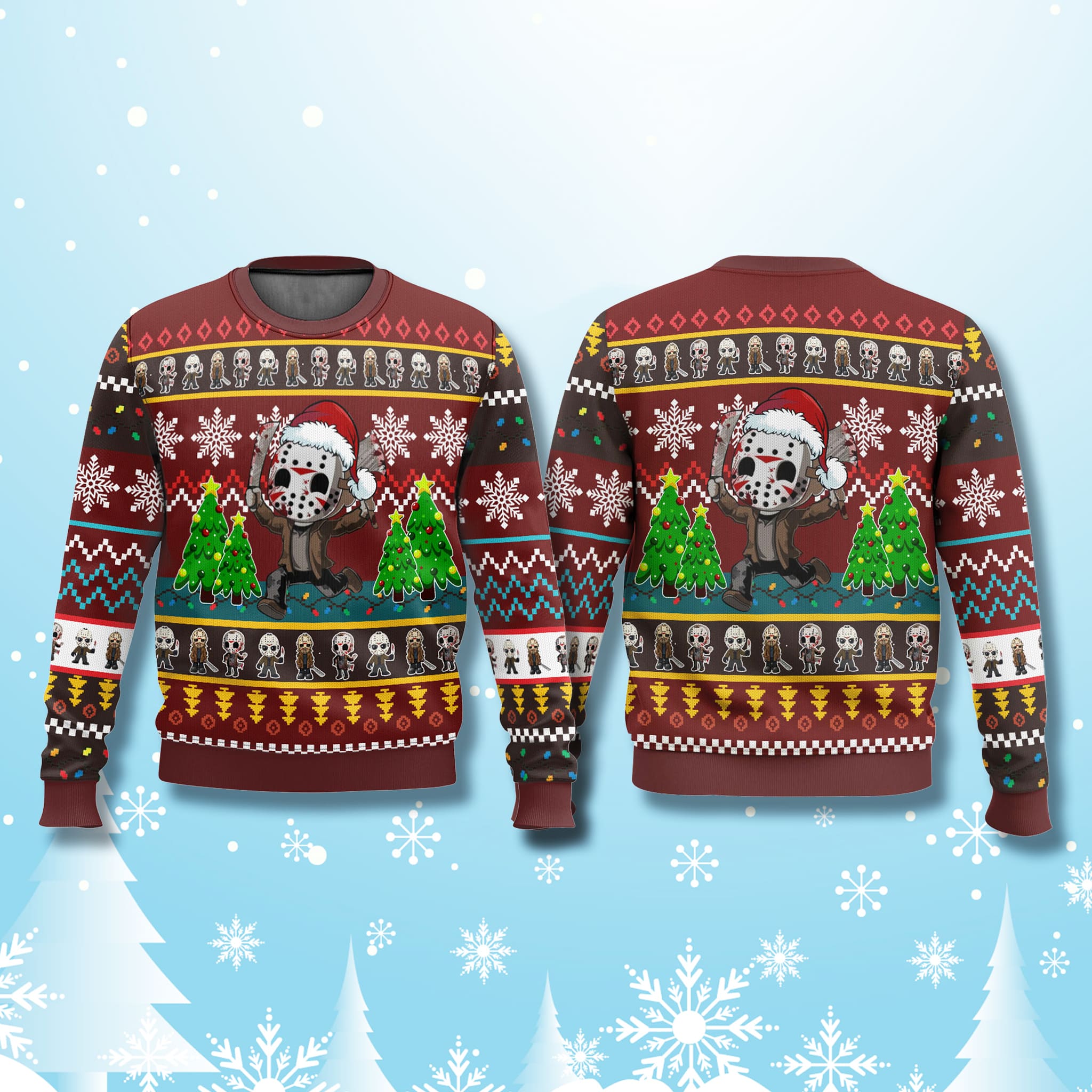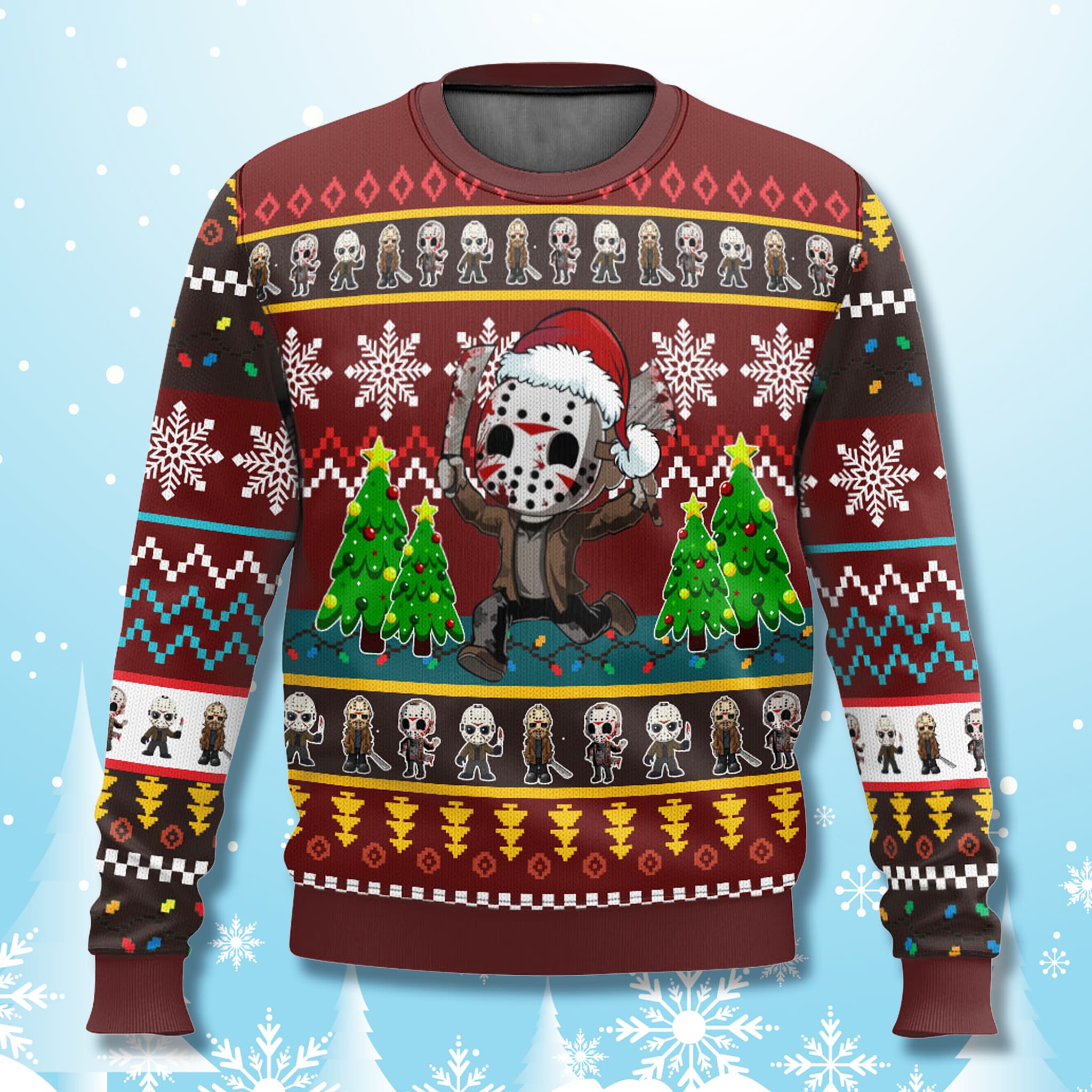 This eye-catching 2025 Jason Voorhees Ugly Sweater a pattern in deep reds and maroons, ensuring you’ll stand out at any holiday gathering. The central focus is a delightful, yet menacing, Chibi Jason Voorhees character, complete with his signature hockey mask and a festive Santa hat. He’s flanked by classic Christmas trees and surrounded by a festive array of snowflakes, skulls, and other horror-inspired motifs.