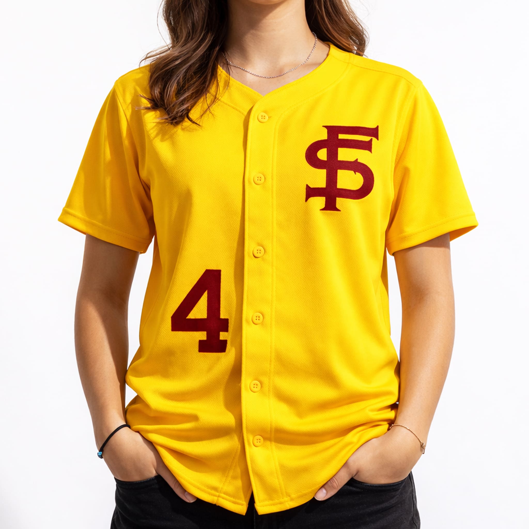 The return of the “Mustard” colorway in 2026 is a statement of enduring tradition. The jersey features a traditional baseball cut with a full button-down front and a dominant mustard yellow tone, accented by sharp Garnet red “FS” lettering and numbers. The perfect blend of iconic colors and modern tailoring creates an FSU uniform that is both vintage-inspired and stylish.