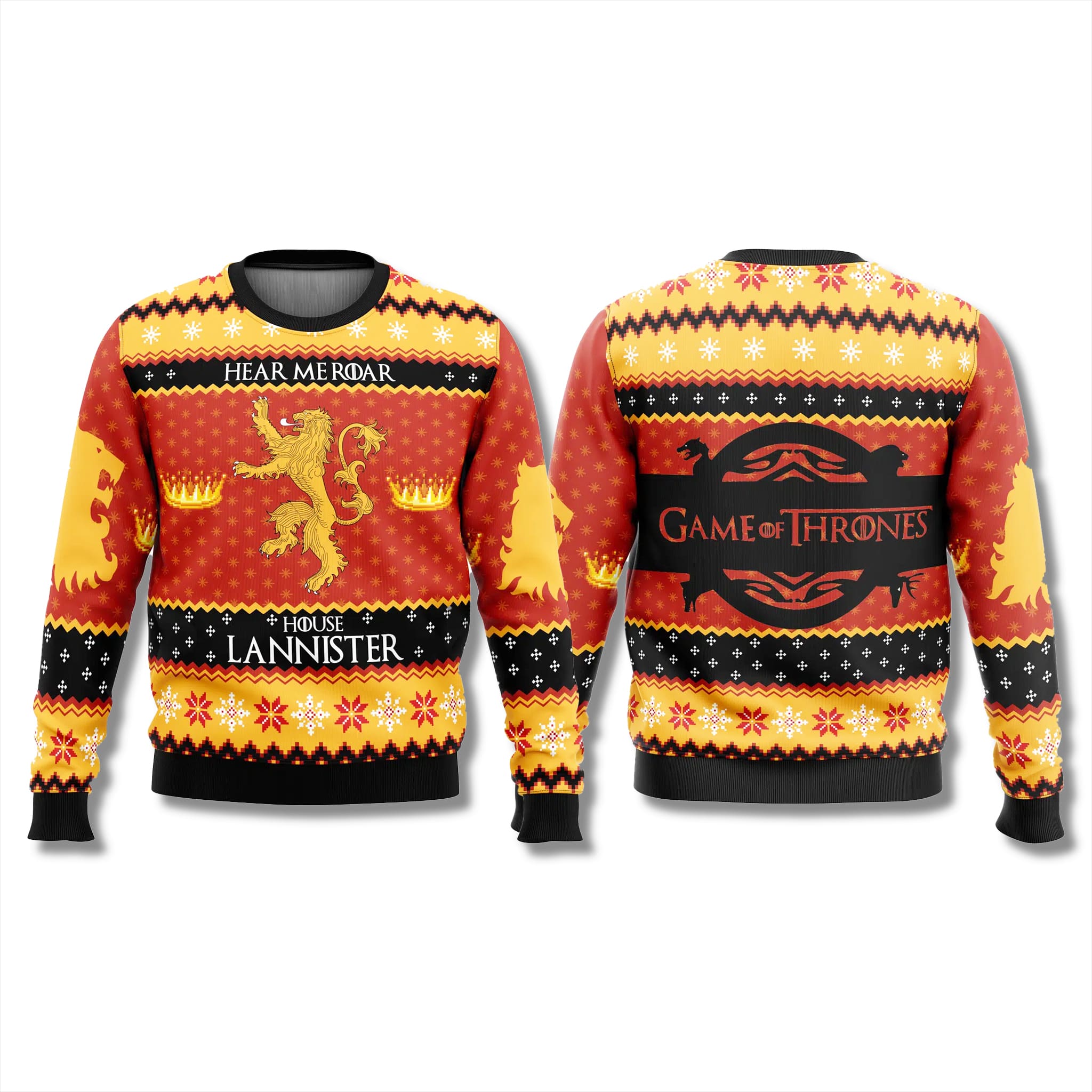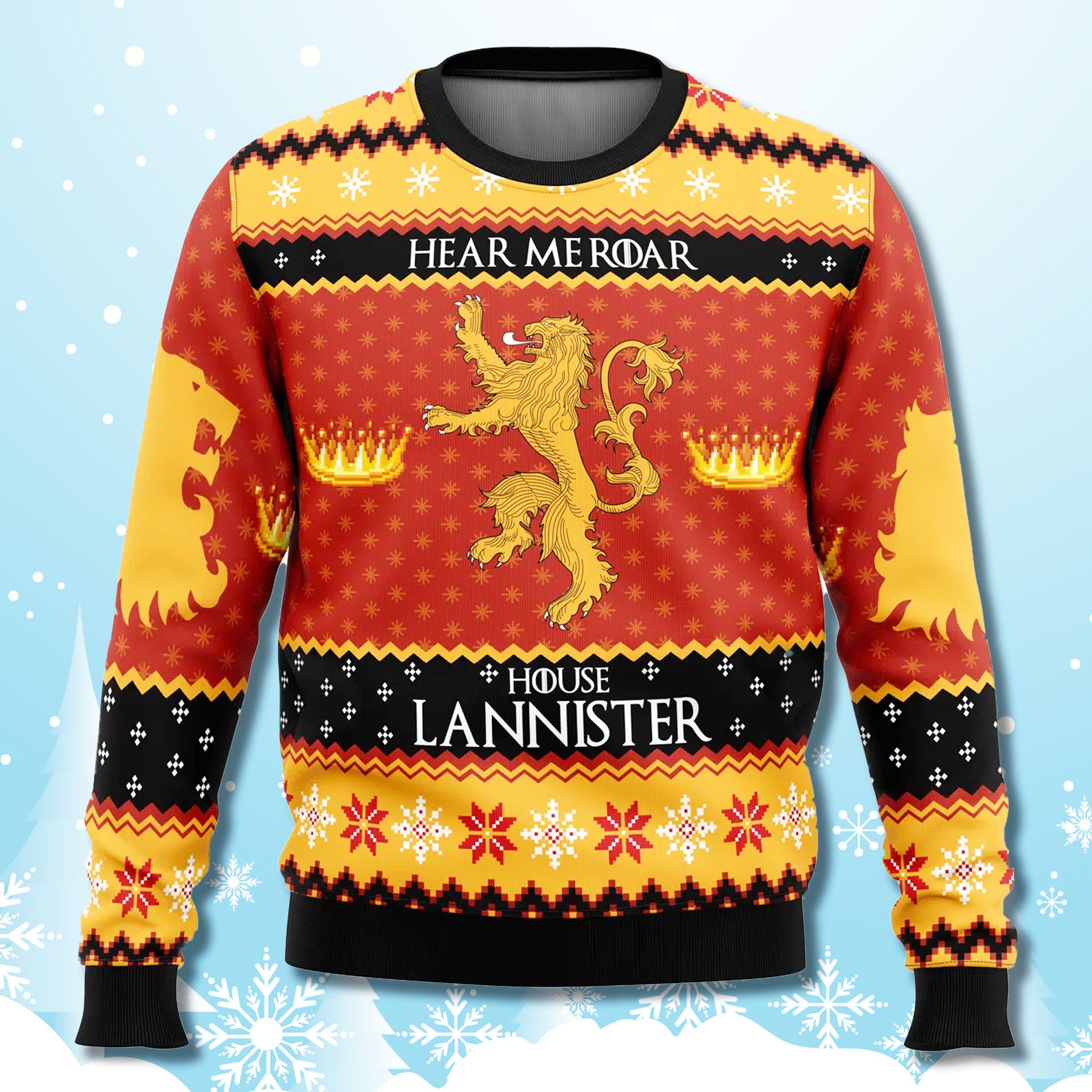 This sweater stands out instantly with its brilliant red-and-gold palette, symbolizing fire, gold, and the grandeur of House Lannister. The front showcases the iconic Golden Lion roaring proudly against a crimson background, paired with the words “HEAR ME ROAR” and “HOUSE LANNISTER.”