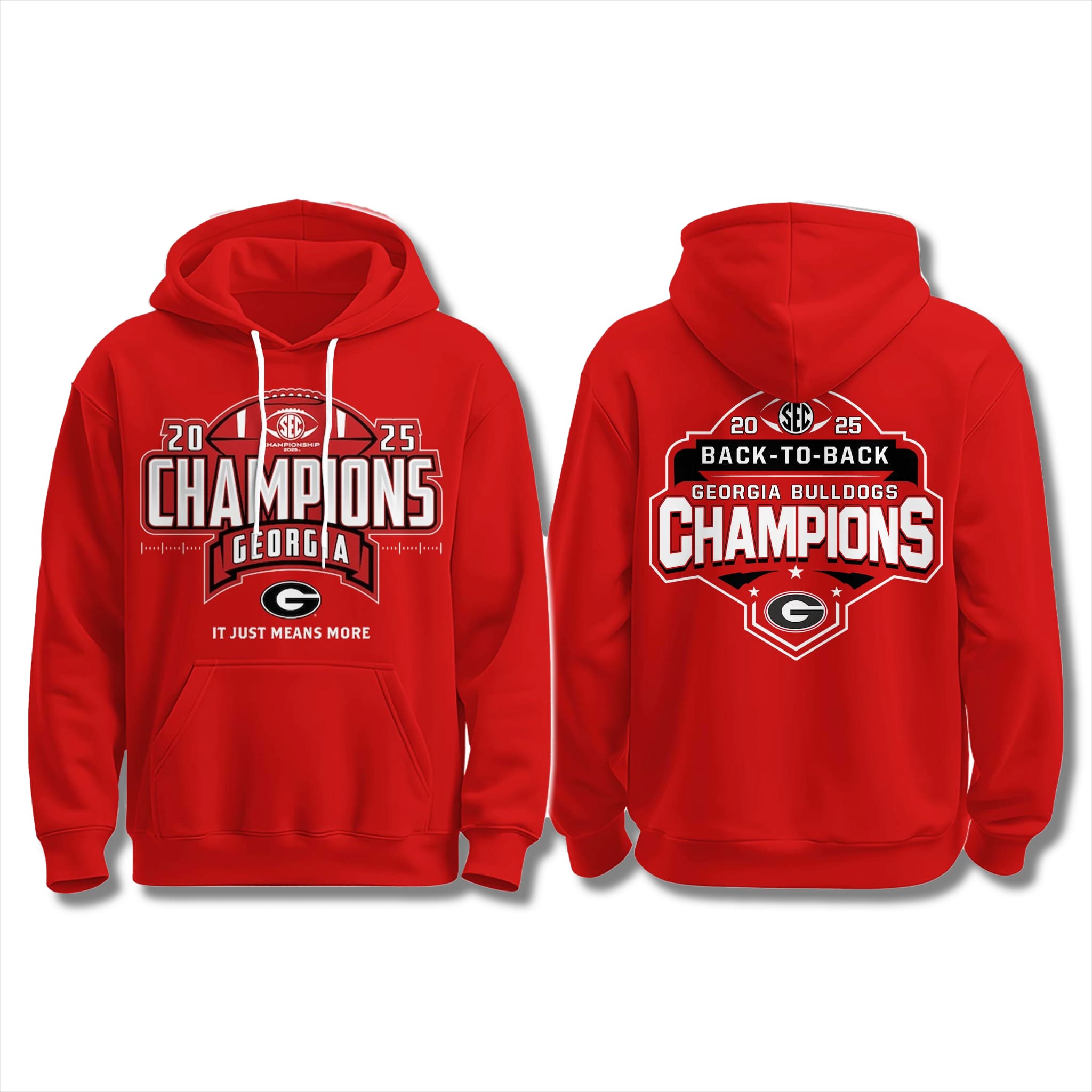This UGA SEC Back To Back Champions Sweatshirt/Hoodie features a classic design with Georgia’s signature fiery red base, a front print of the “2025 SEC CHAMPIONS” banner, and a back print with the “BACK-TO-BACK GEORGIA BULLDOGS CHAMPIONS” badge. Available in multiple sizes and colorways, this two-sided design captures the full meaning of the historic achievement.