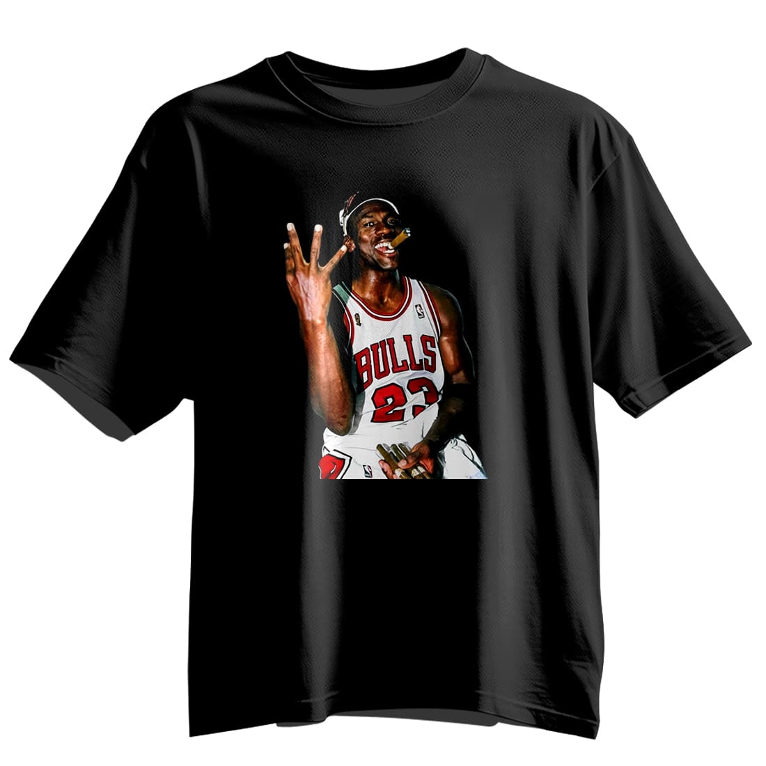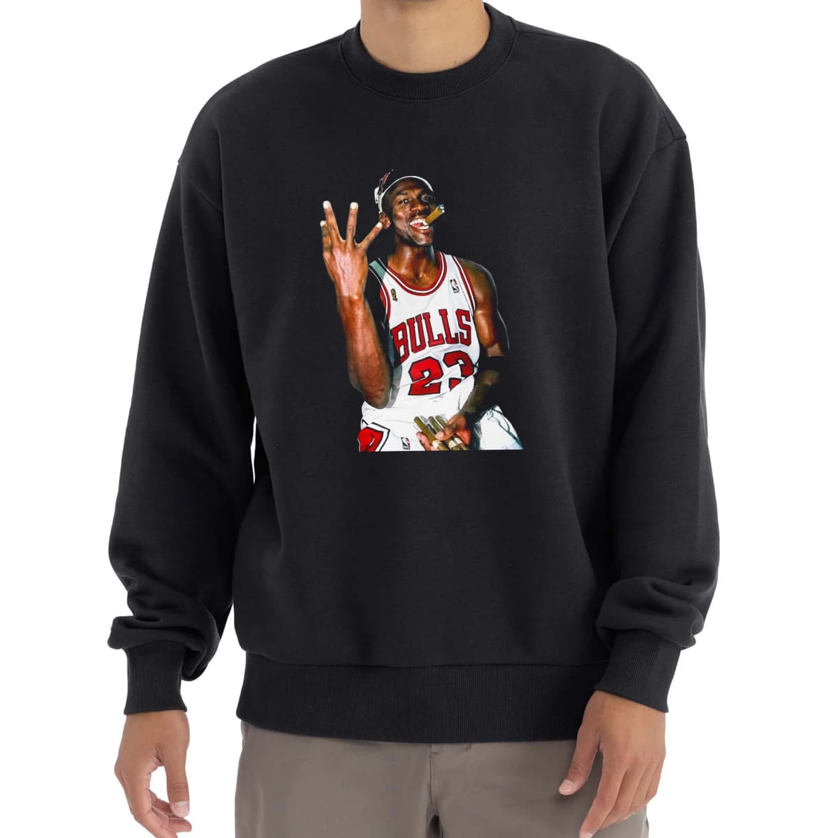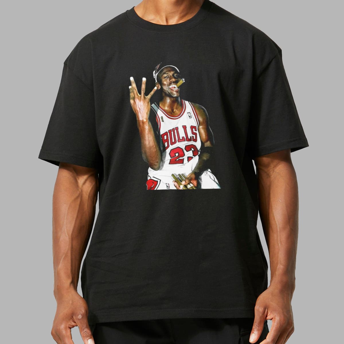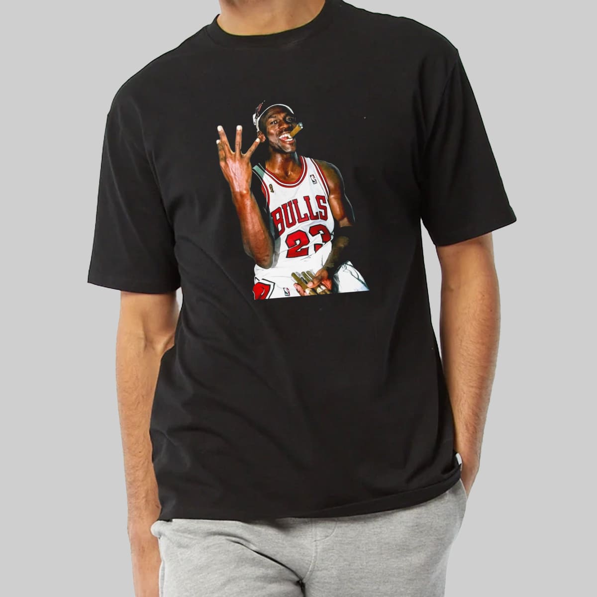 The design features the iconic MJ image – cigar in mouth, three fingers raised to represent three championships—creating a nostalgic yet powerful vibe. You can grab this shirt now at iFrogtees, available in multiple sizes and styles so you can wear the look and flex on fellow basketball fans.