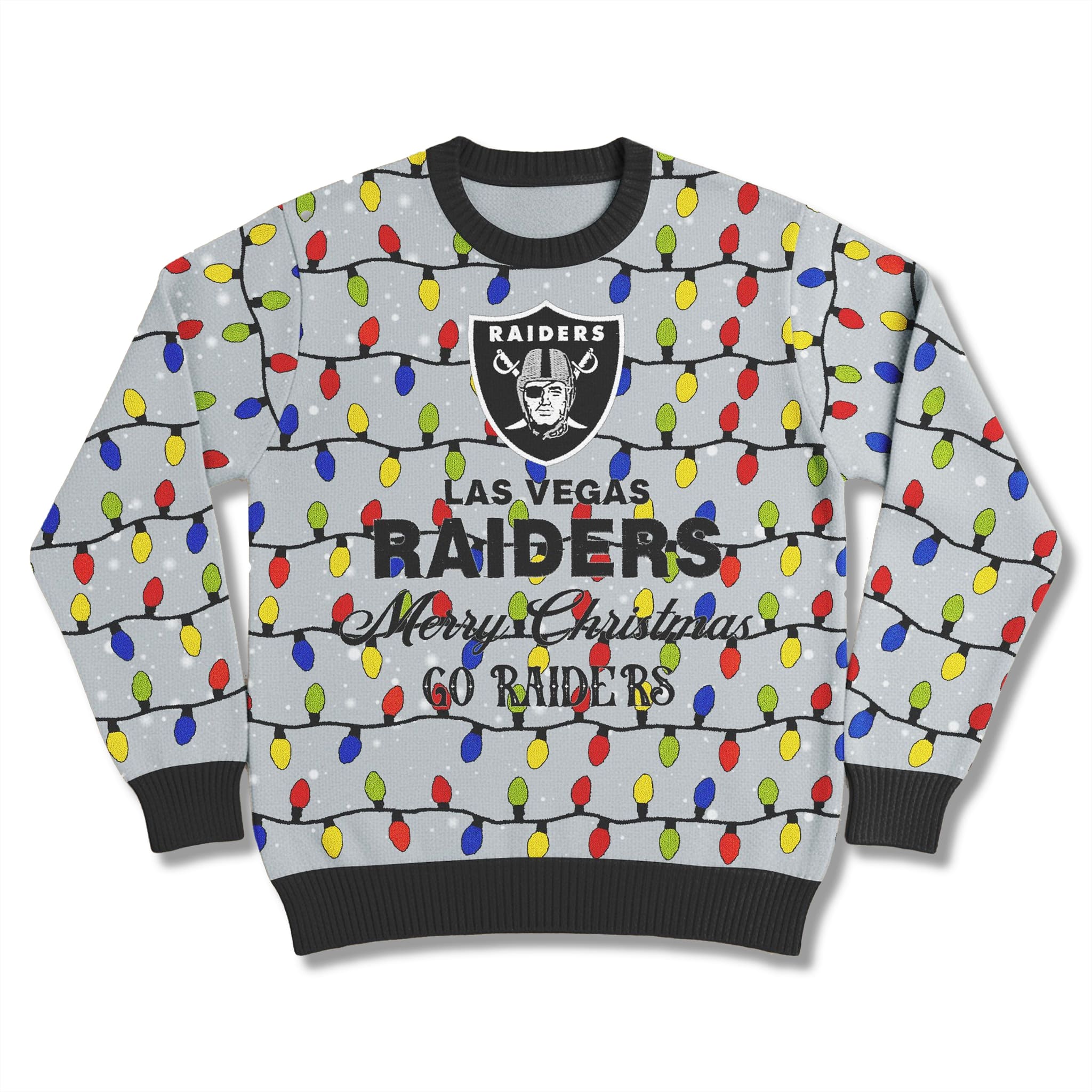 The overall design is an oversized ugly sweater style, featuring a silver-gray base with multicolored fairy lights. Raiders logos and hand-lettered slogans create a vibrant festive style that pairs easily with winter outfits.