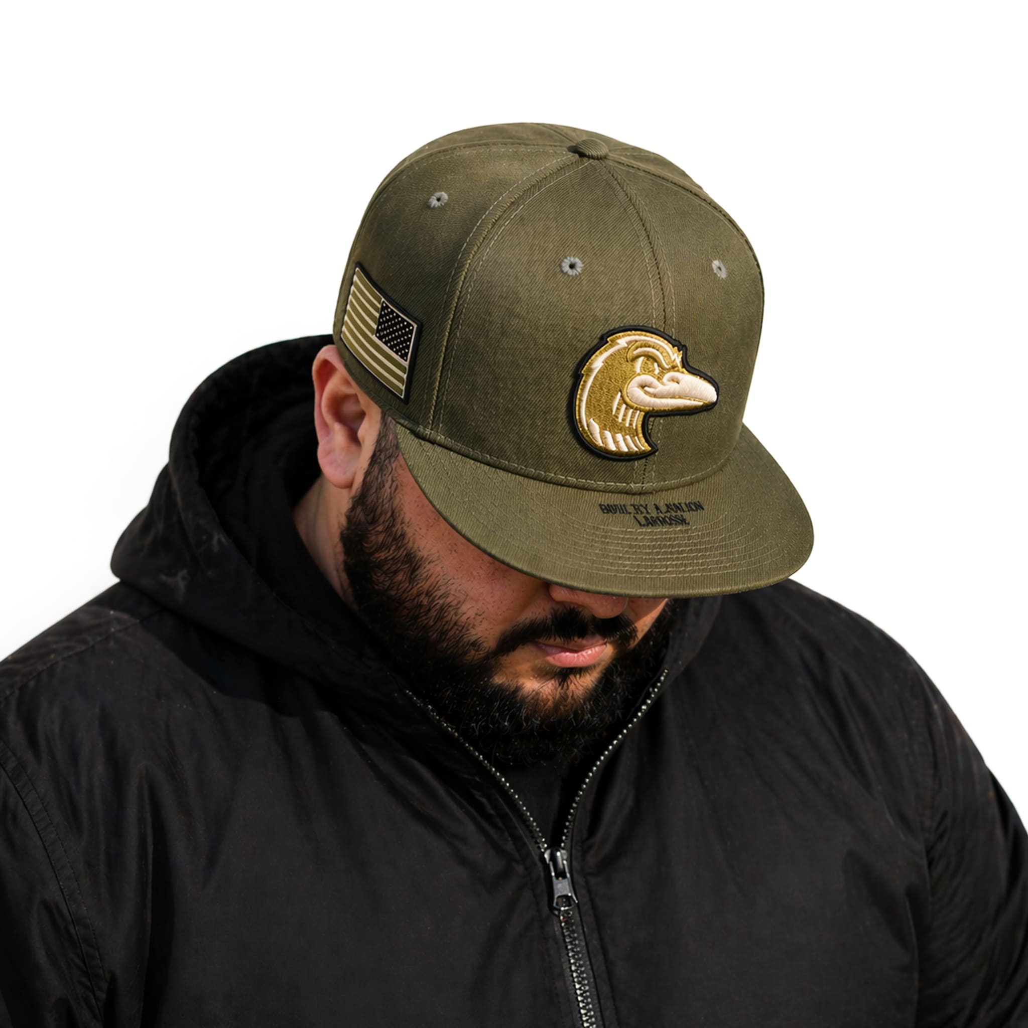 This hat features a modern flat-brim cap structure, dressed in a strong military green color. The loon logo is artistically stylized in a luxurious gold tone on a black background, combined with an honorary flag patch on the side, creating an overall look that is both professional and military-inspired.