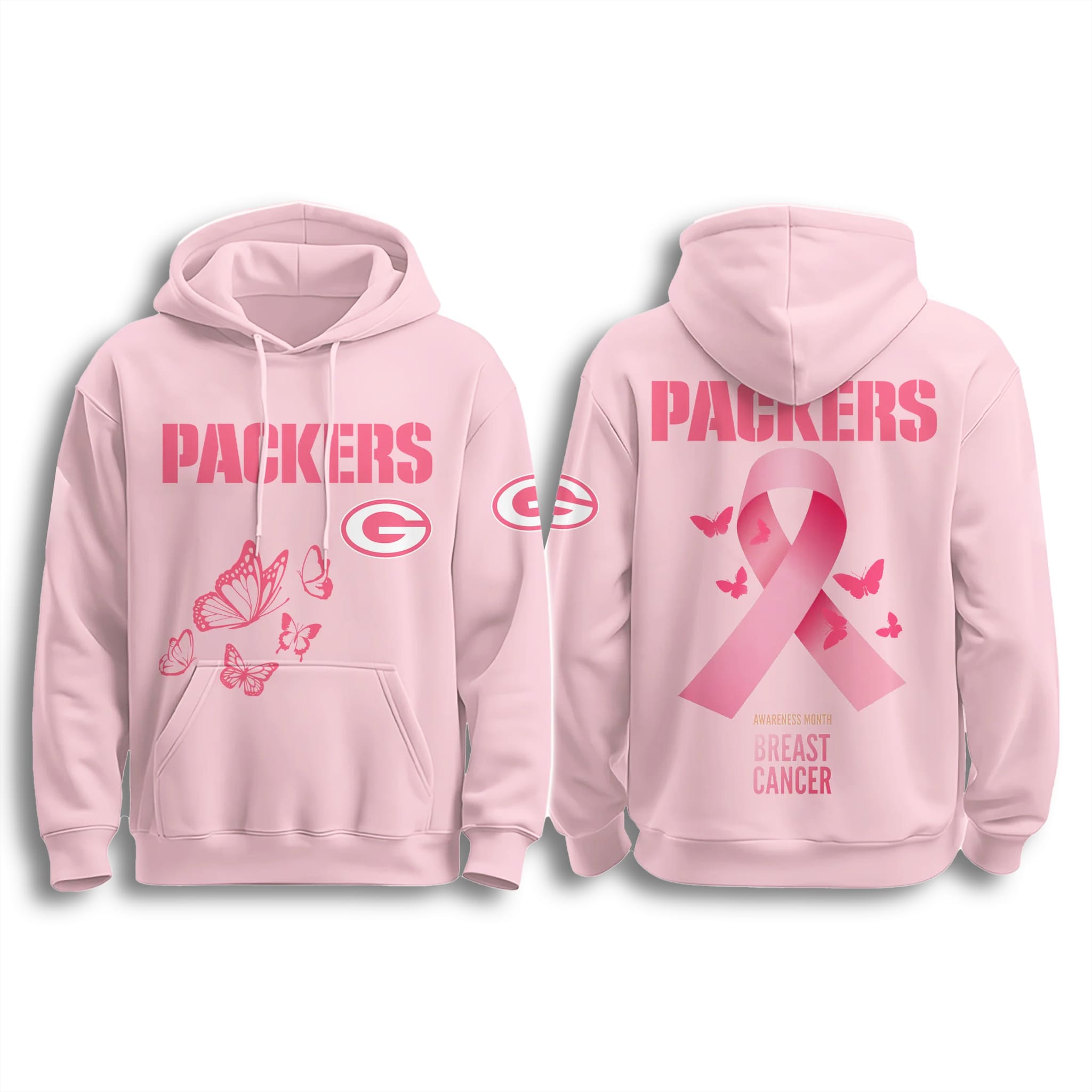 Crafted in soft pink hues, this hoodie features bold Packers lettering and the iconic “G” logo accented with fluttering butterfly motifs and a central pink ribbon. Its unisex streetwear style offers a relaxed fit, blending athletic comfort with subtle awareness symbolism for everyday versatility.