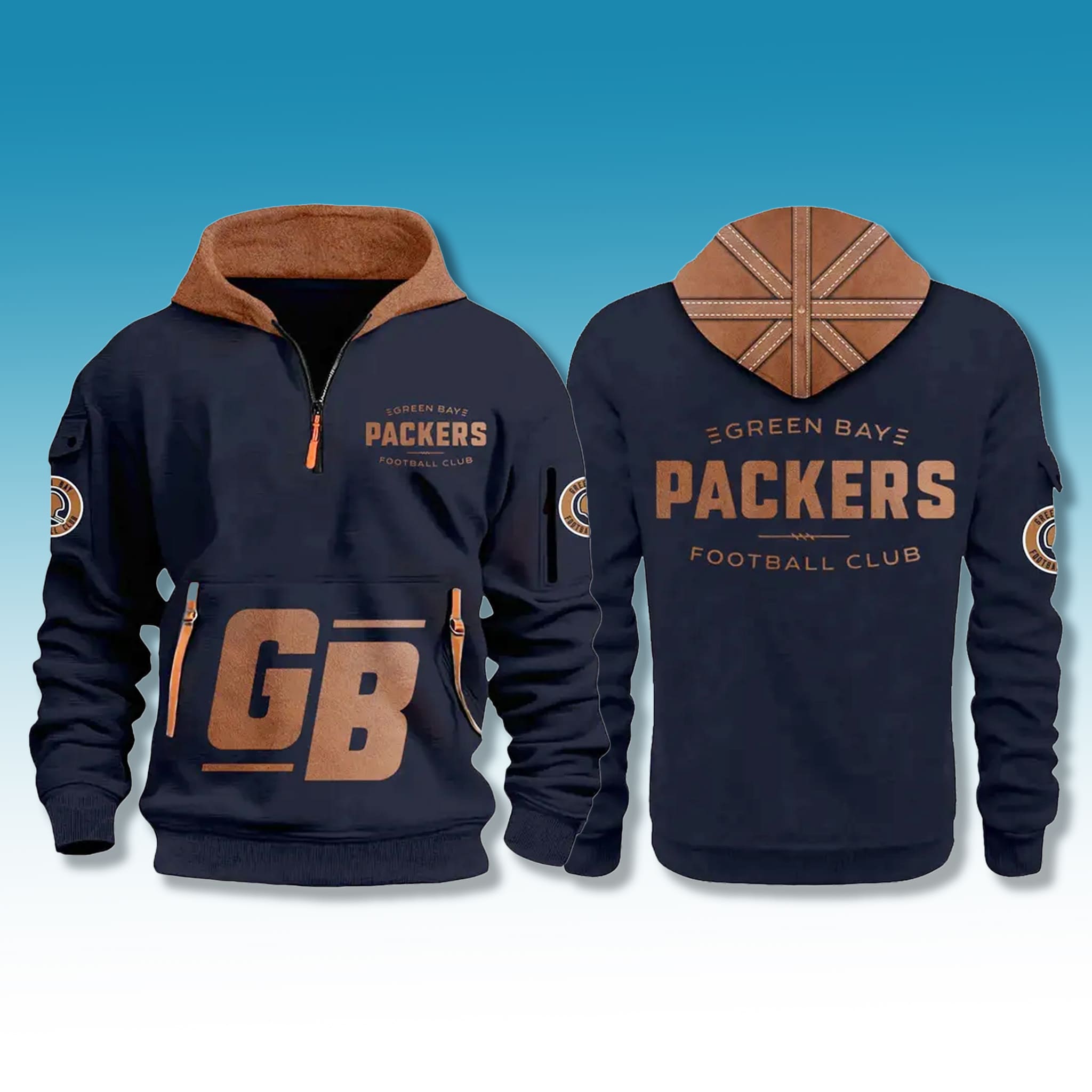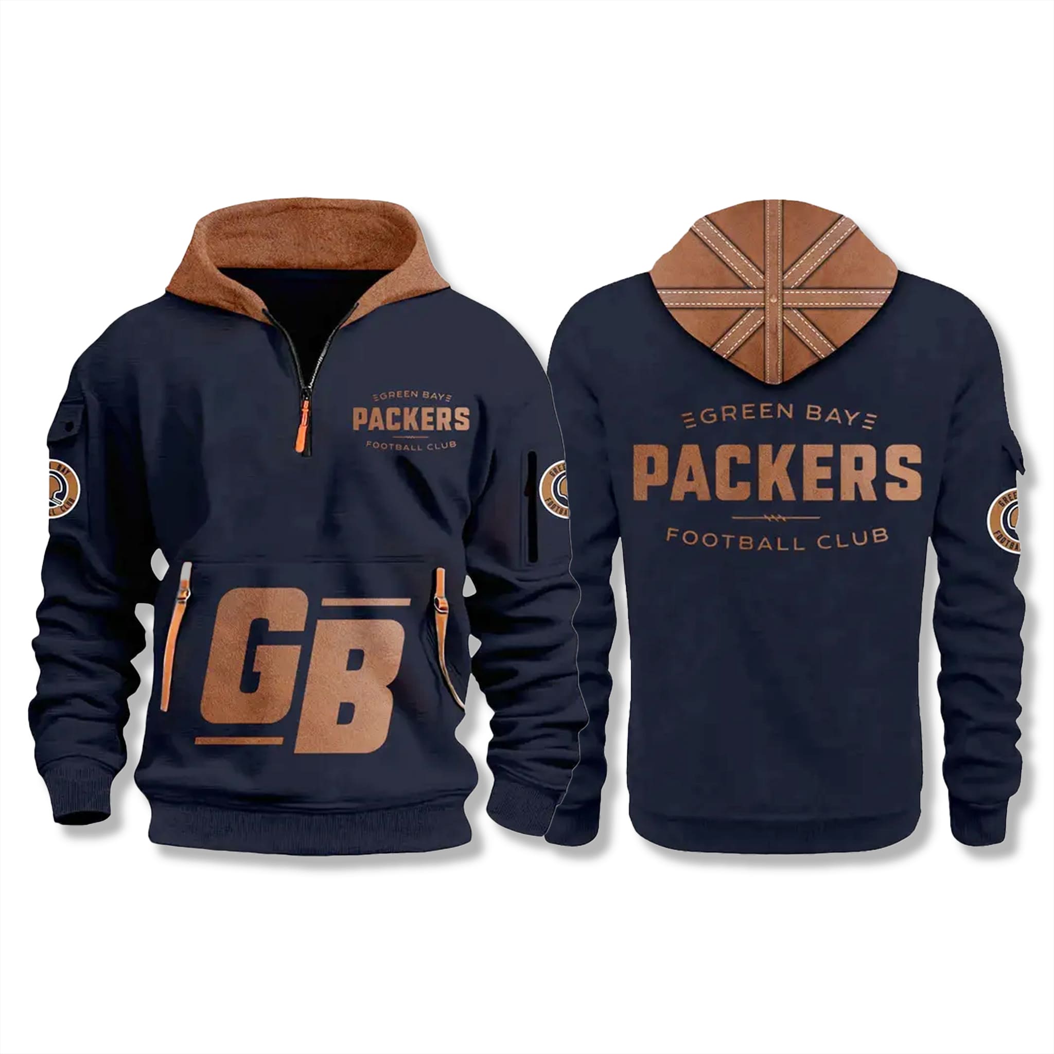 This hoodie captures the resilient spirit of the early Packers through vintage-inspired details while delivering modern comfort and warmth. Perfect for cheering at Lambeau Field or braving chilly days, it unites generations of fans through timeless design. This iFrogtees version features a quarter-zip hoodie design that combines practicality and retro style, highlighted by a navy base accented with bronze-brown and orange tones.