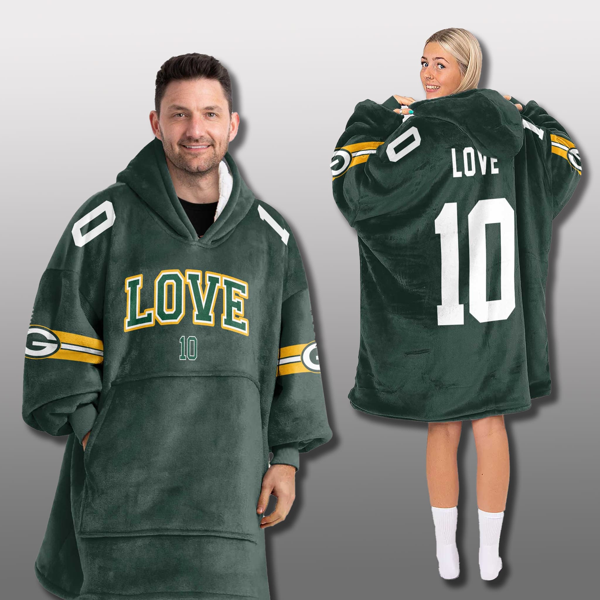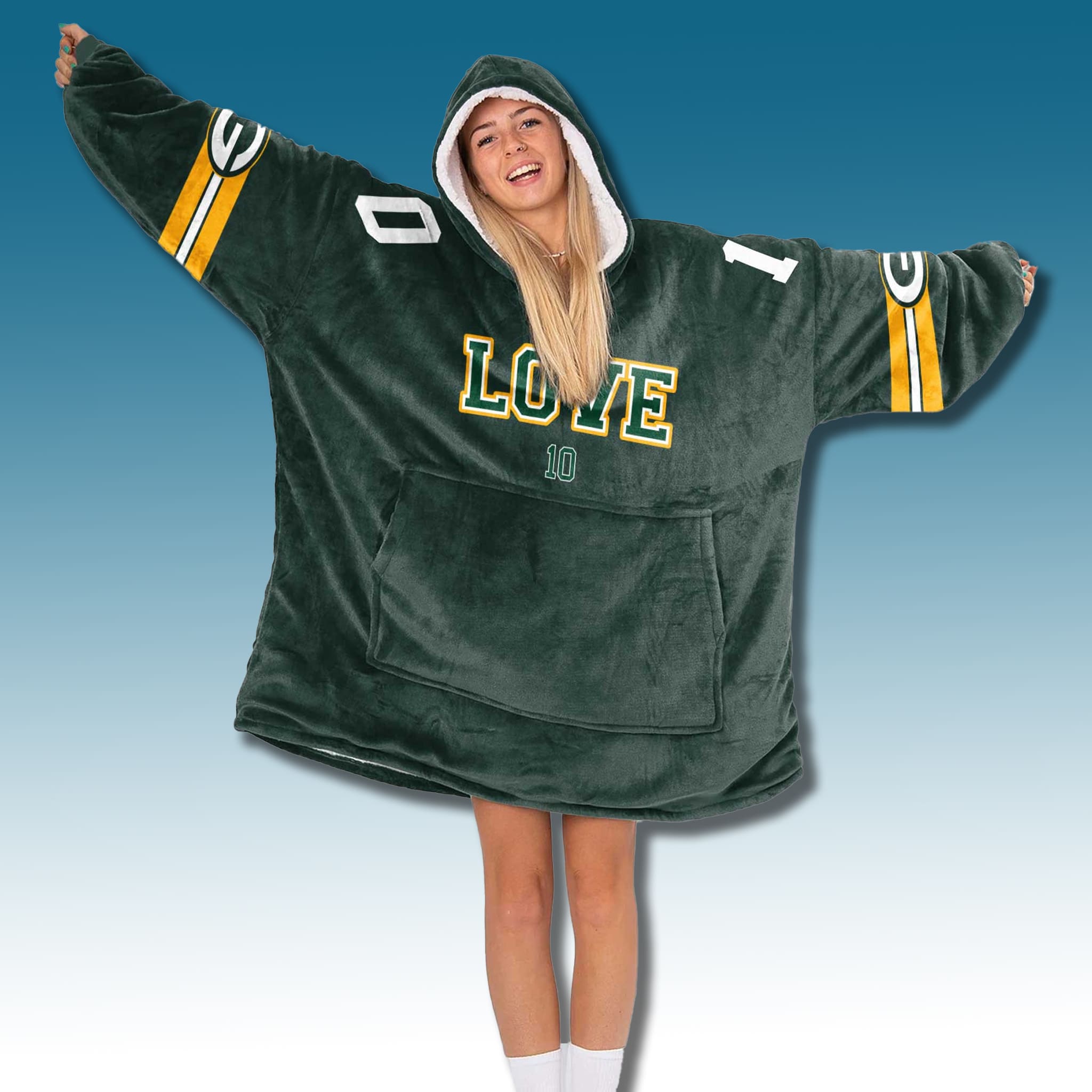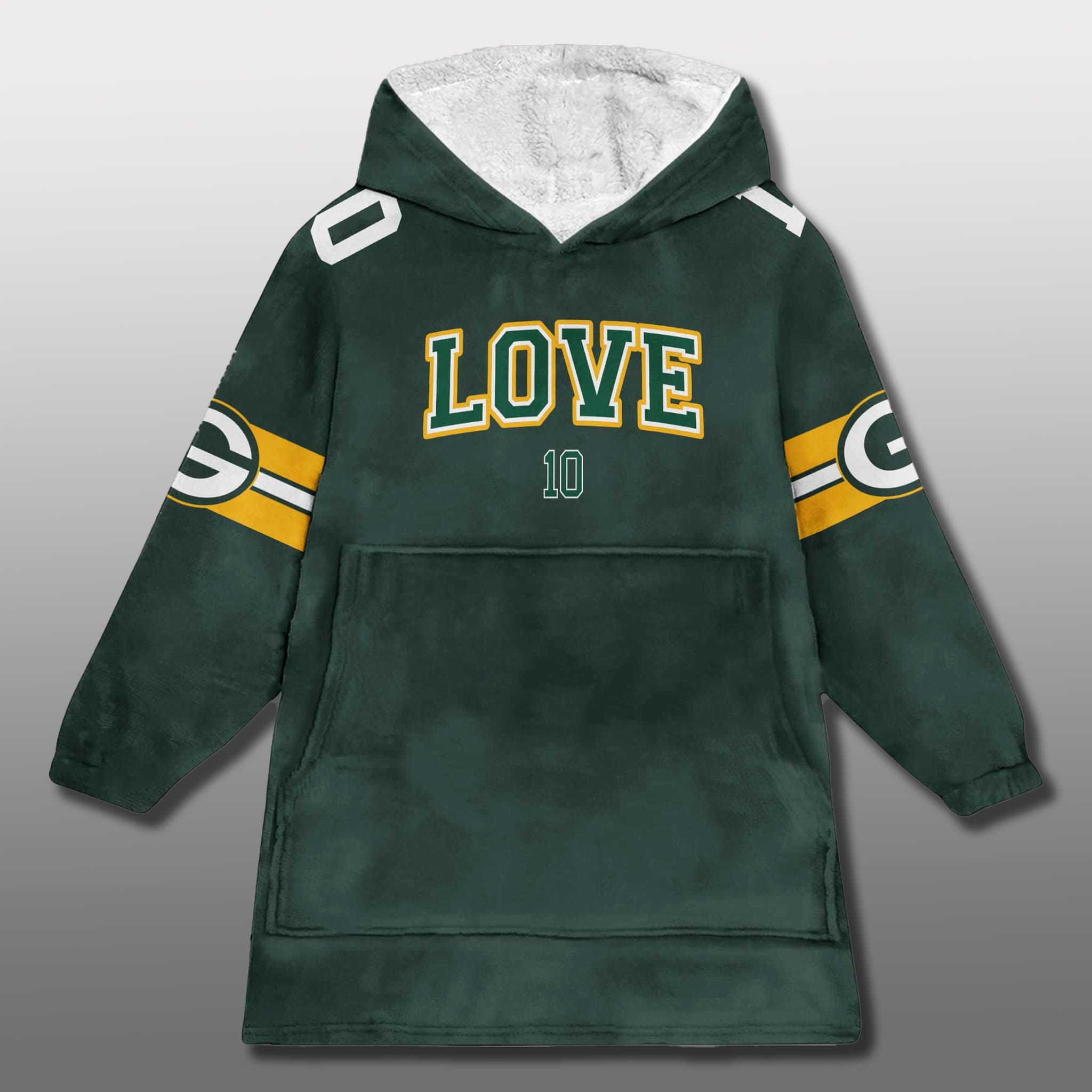 This Packers blanket hoodie stands out with a classic deep green color base, accented by signature gold and white stripes along the sleeves. Inspired by athletic uniform design, it features the bold LOVE lettering and the number 10 on the front and back – delivering a sporty, dynamic, and fan-inspired look.