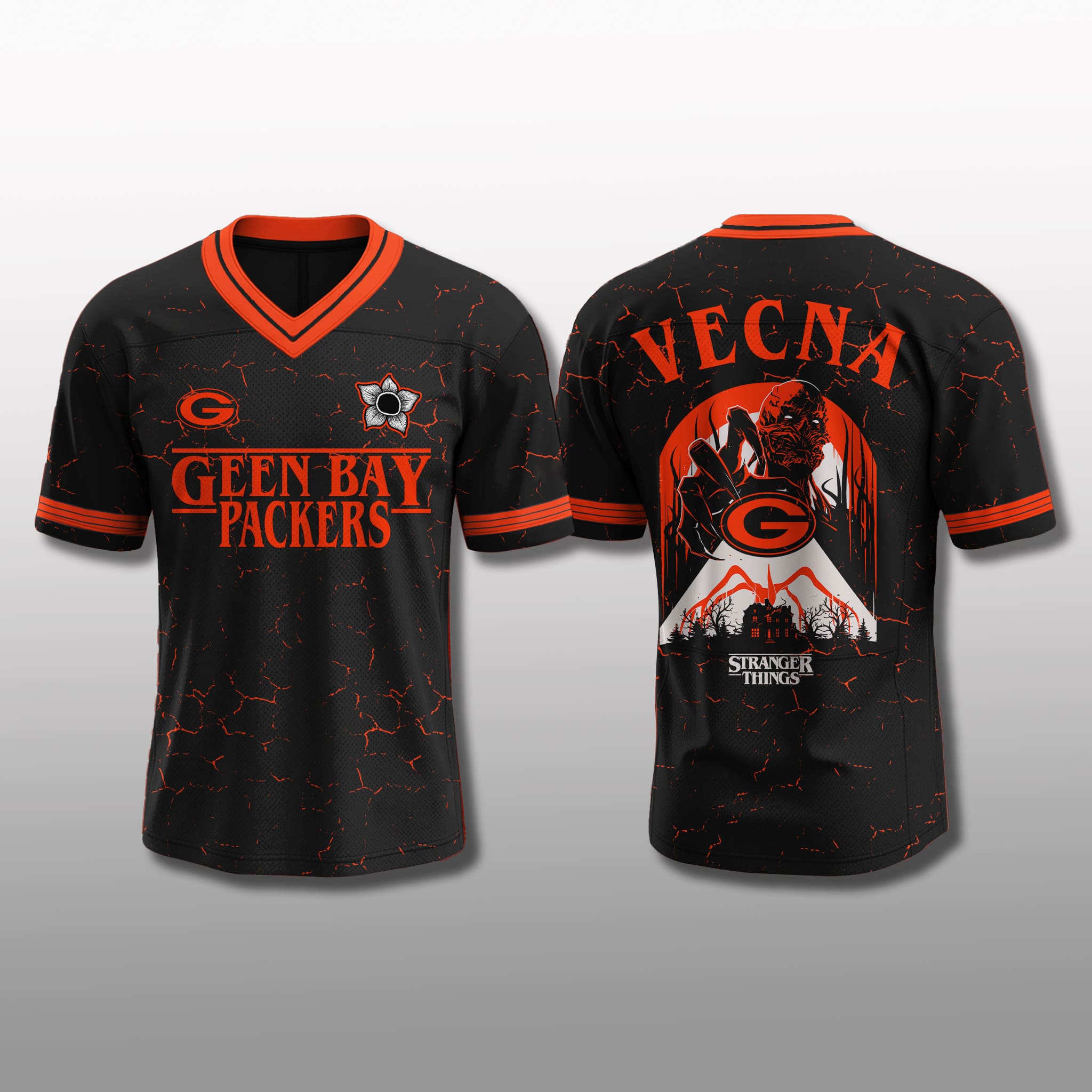 This jersey features a bold black-and-ember palette – a fiery twist inspired by Halloween energy and the eerie world of Vecna. The iconic logo of Packers appears front and center, combined with a stylized team name crafted in a font reminiscent of Stranger Things. On the back, an imposing illustration of Vecna steals the spotlight, surrounded by crack-like energy effects that symbolize the spreading influence of the Upside Down.