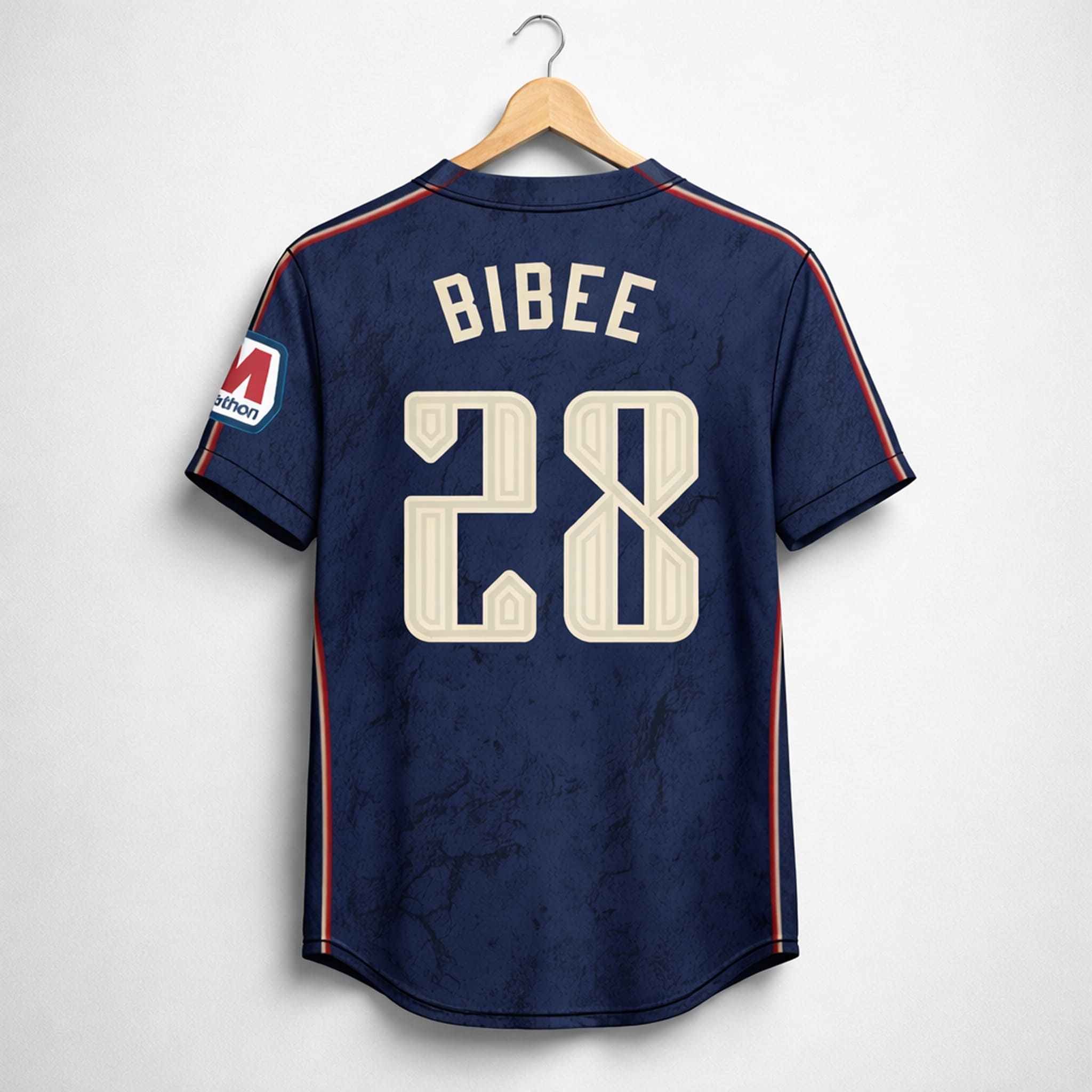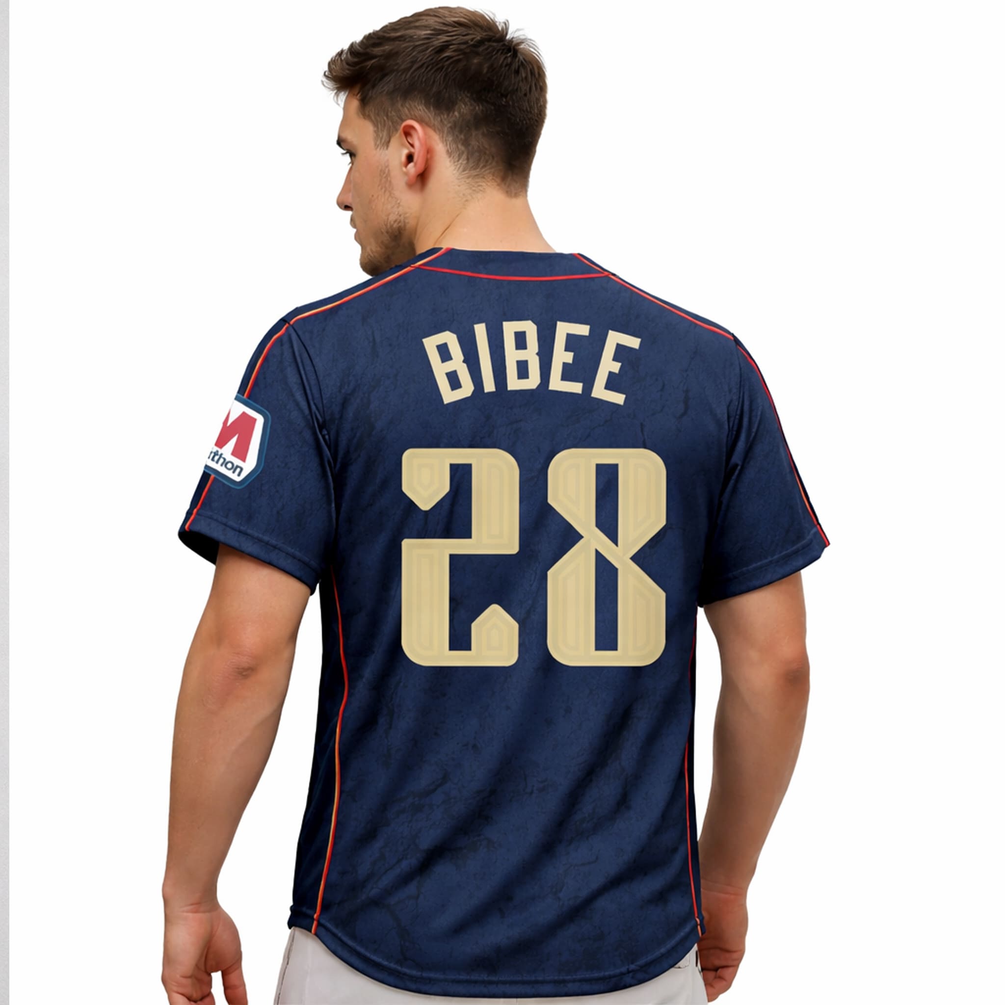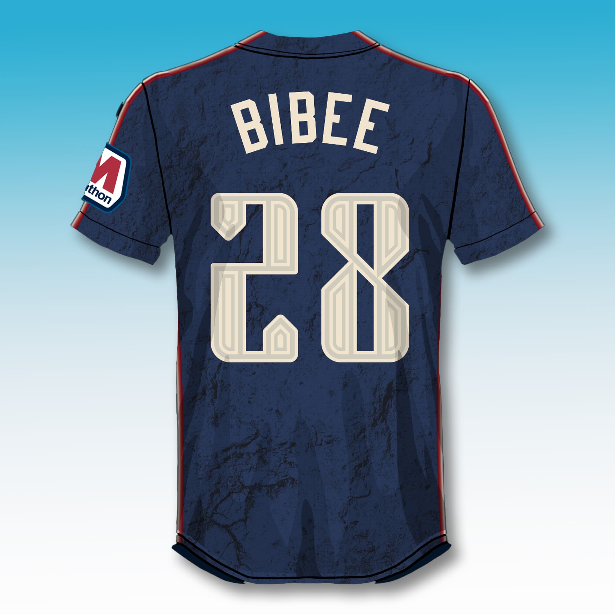 This jersey stands out with its signature City Connect design: a deep midnight navy base reflecting urban strength, a marble/cracked stone texture across the body symbolizing Cleveland’s resilience, sharp red-maroon trim, contrasting sleeve and collar accents, a stylized Guardians logo, and the name “BIBEE” with the large number 28 on the back in an exclusive font.