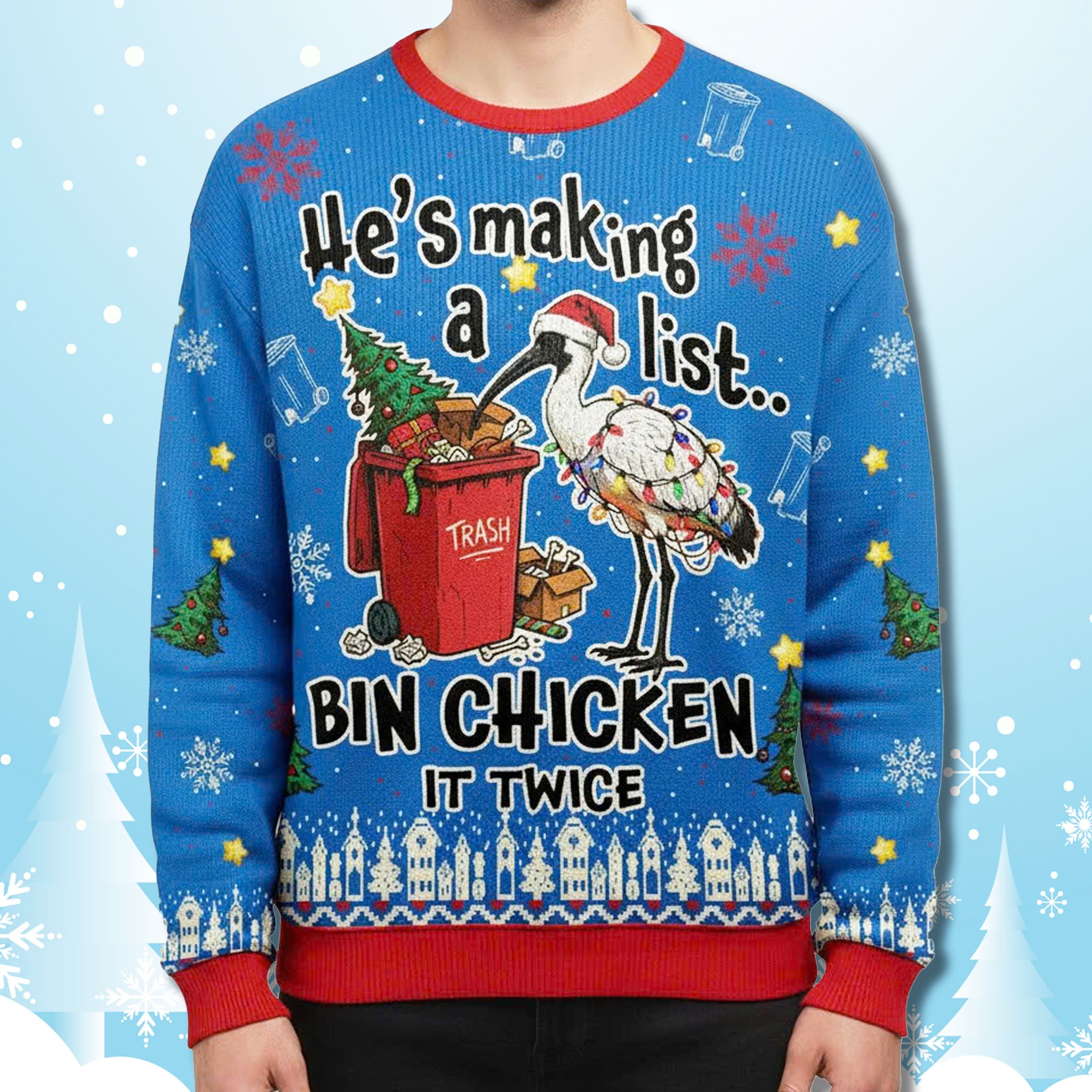 He’s Making A List Bin Chicken It Twice Ugly Christmas Sweater – Funny Australian Ibis Holiday Parody