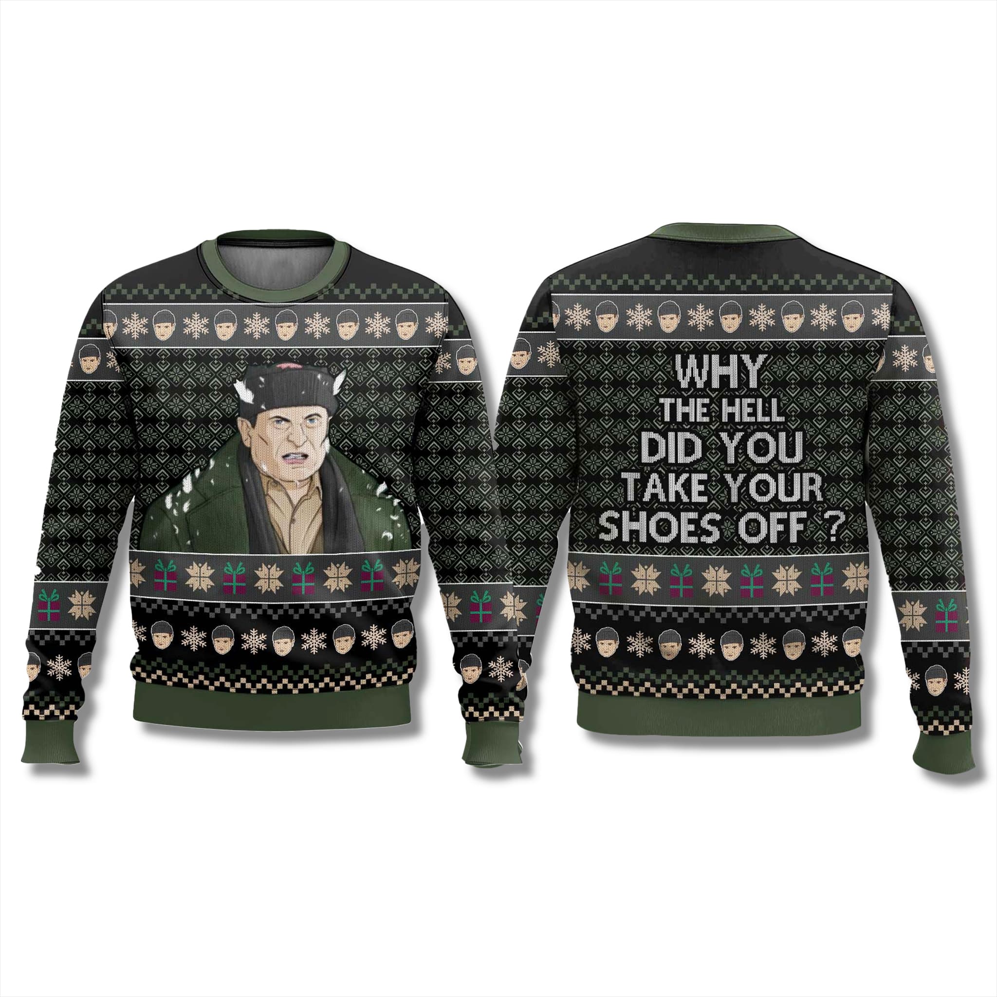 More than just an ugly sweater, this is a conversation starter and a badge of honor for true Home Alone fans. This Home Alone Harry Lyme Sweater, set against a dark green and black knit-style background, is a tribute to Harry’s worst night ever. The front features the unforgettable image of Harry post-blowtorch trap, while the back displays his iconic, frustrated line to Marv: “Why the hell did you take your shoes off?”