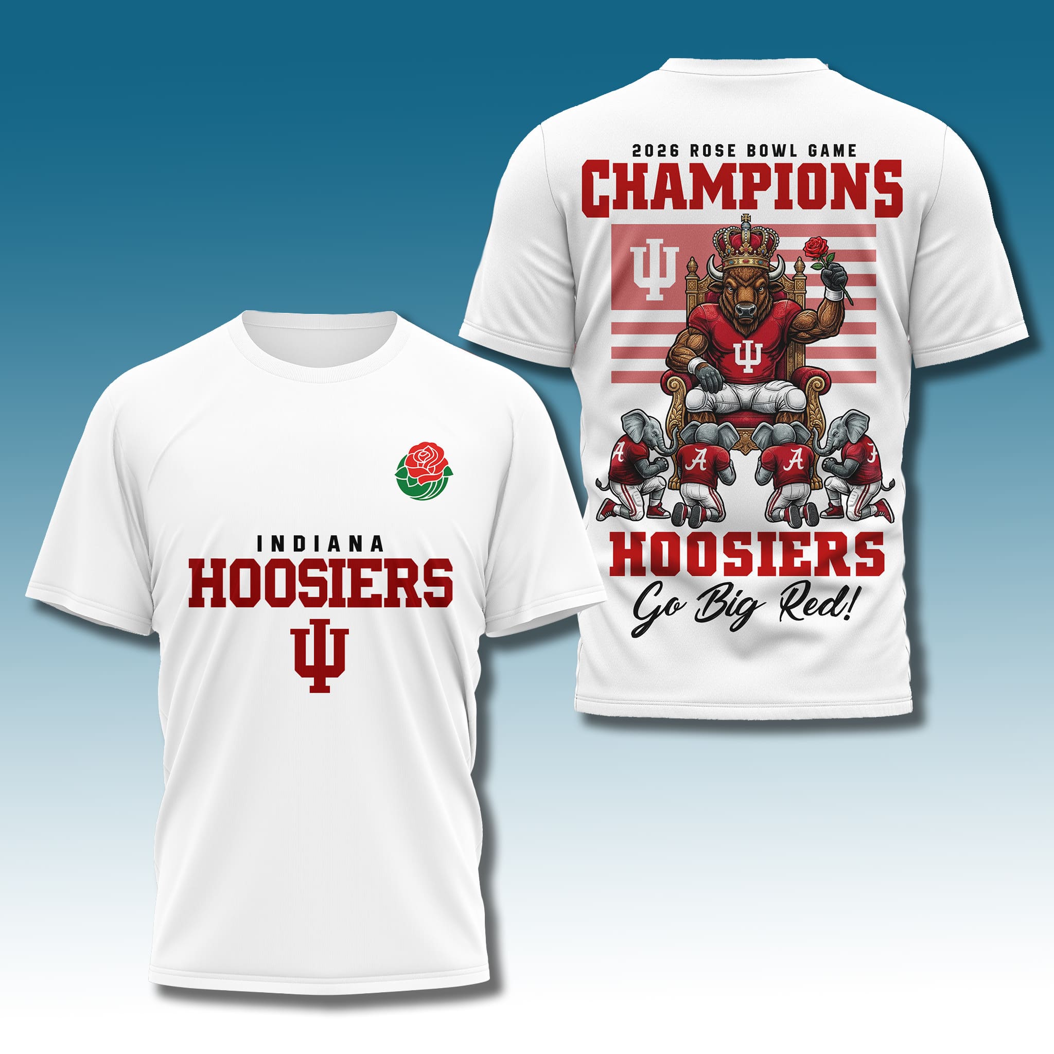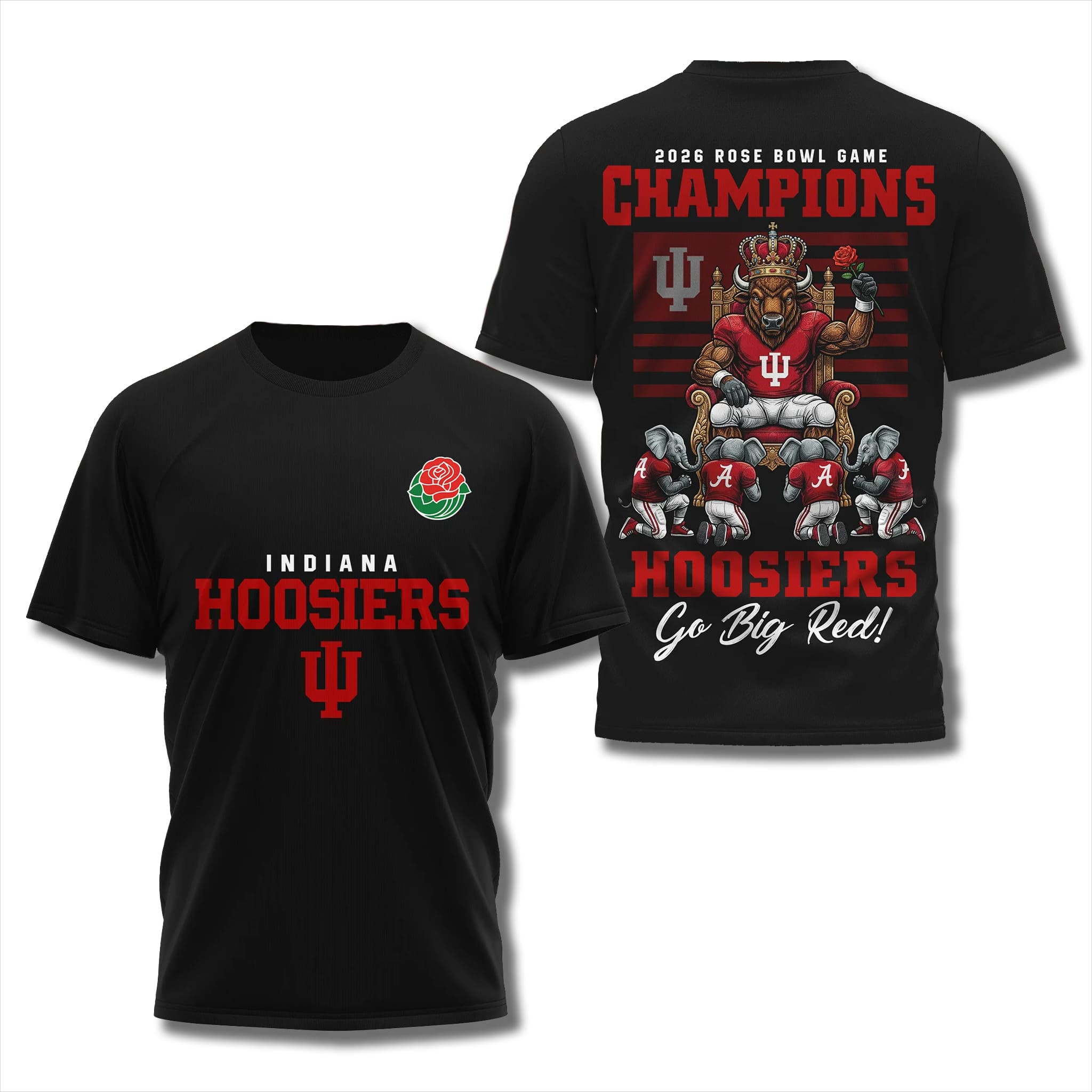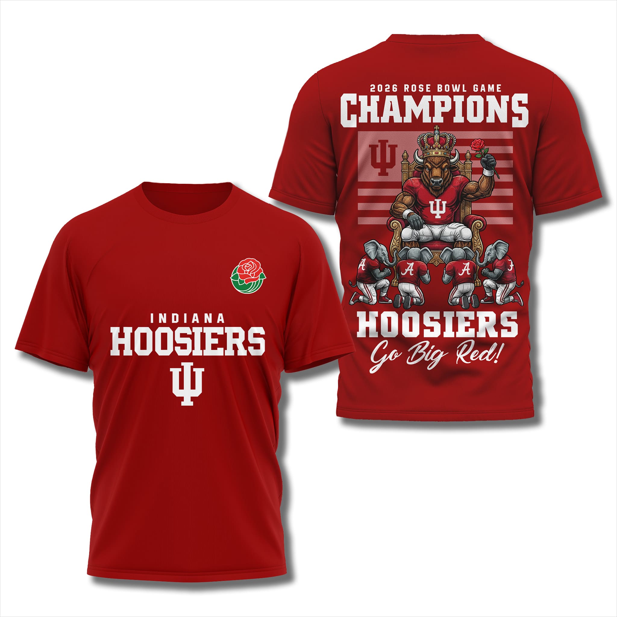 Hoosiers 2025 Rose Bowl Champions Go Big Red Shirt is an T-shirt for Indiana Hoosiers fans, commemorating the dominant 38–3 victory over Alabama in the College Football Playoff Rose Bowl quarterfinal on January 1, 2026. This marks the first time in the history of the Indiana program that it has won the Rose Bowl, as well as a historic blowout that sent the undefeated Hoosiers (14–0) into the CFP semifinals, affirming their overwhelming strength under head coach Curt Cignetti and Heisman winner Fernando Mendoza.