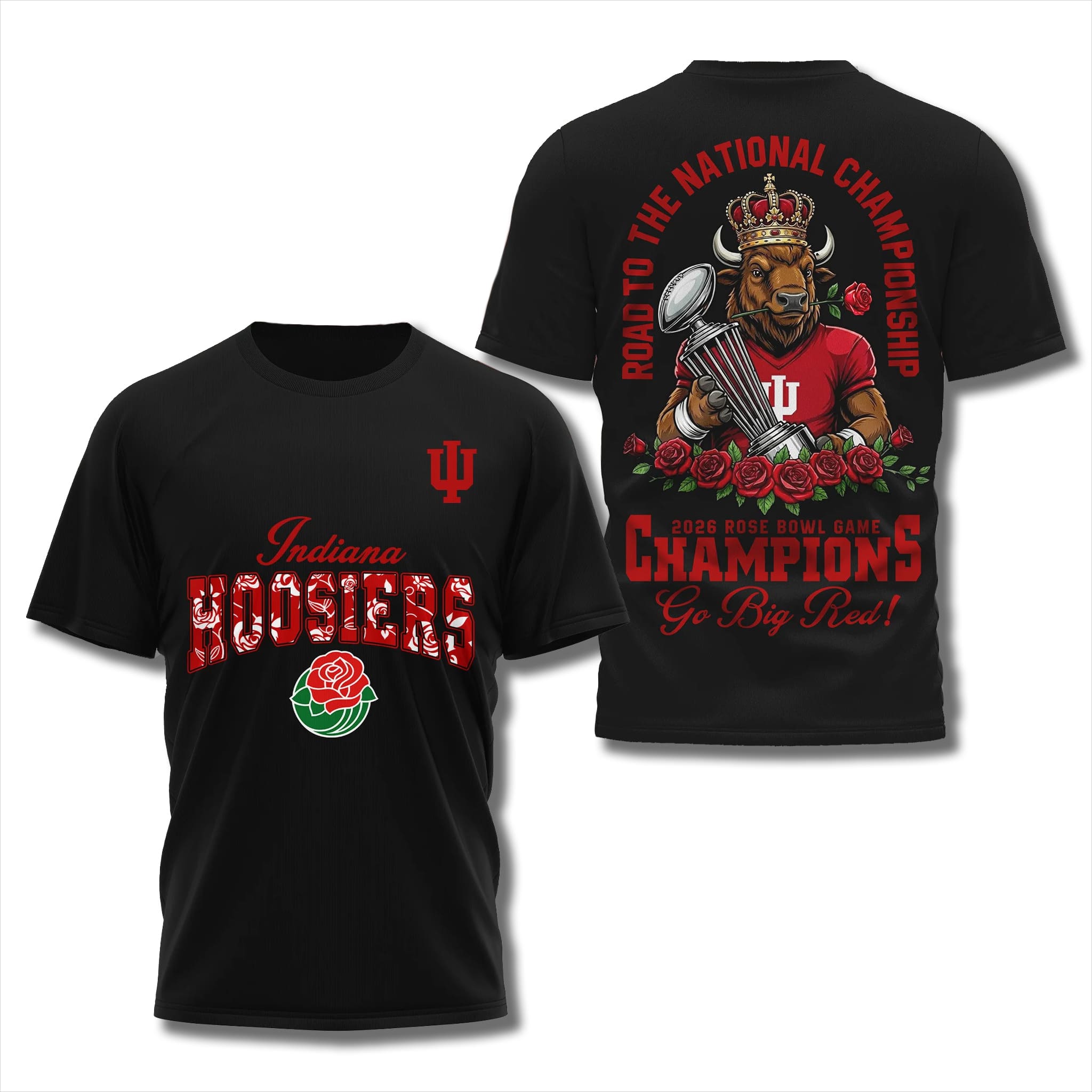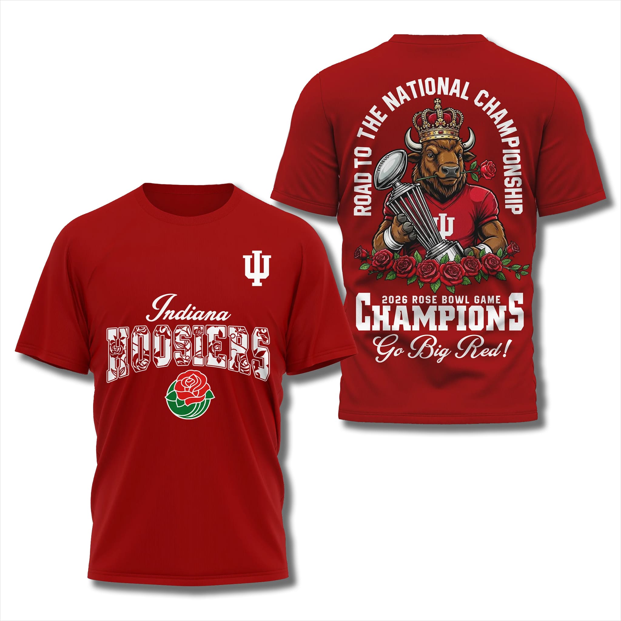 This shirt design uses a strong deep red tone with impressive double-sided graphics. The back prominently features a crowned bison holding the CFP trophy and surrounded by roses, combined with the text Road To The National Championship, creating a majestic and aspiration-filled style.