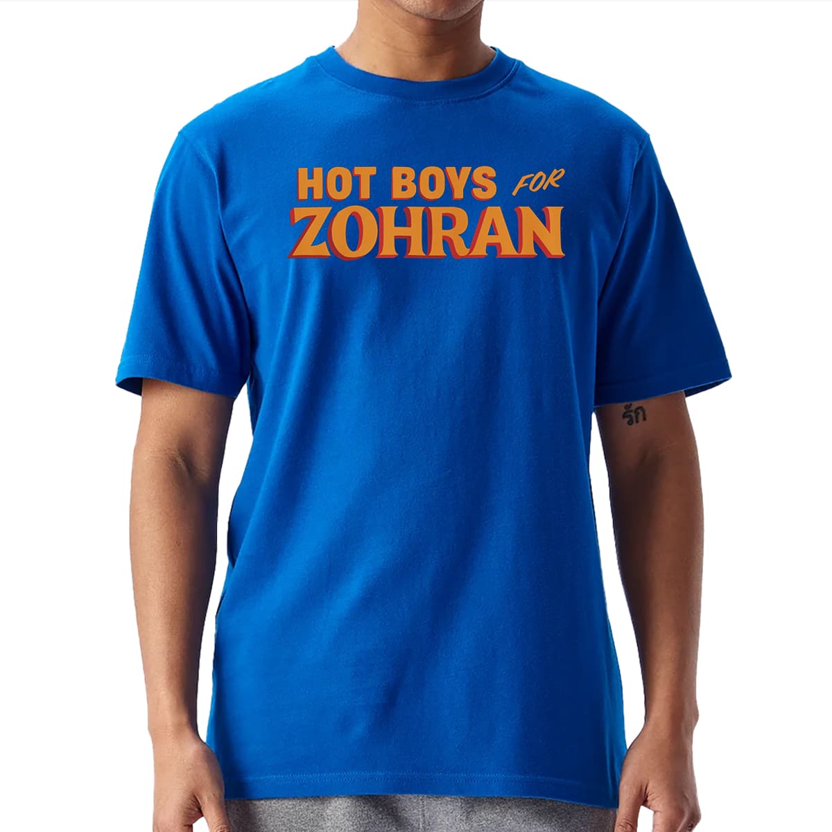 This vibrant royal blue cotton tee pops with “HOT BOYS FOR” in sleek orange above “ZOHHRAN” in glowing, retro-gradient orange letters—evoking ’90s hip-hop vibes while keeping it clean and unisex for everyday wear or protest marches.