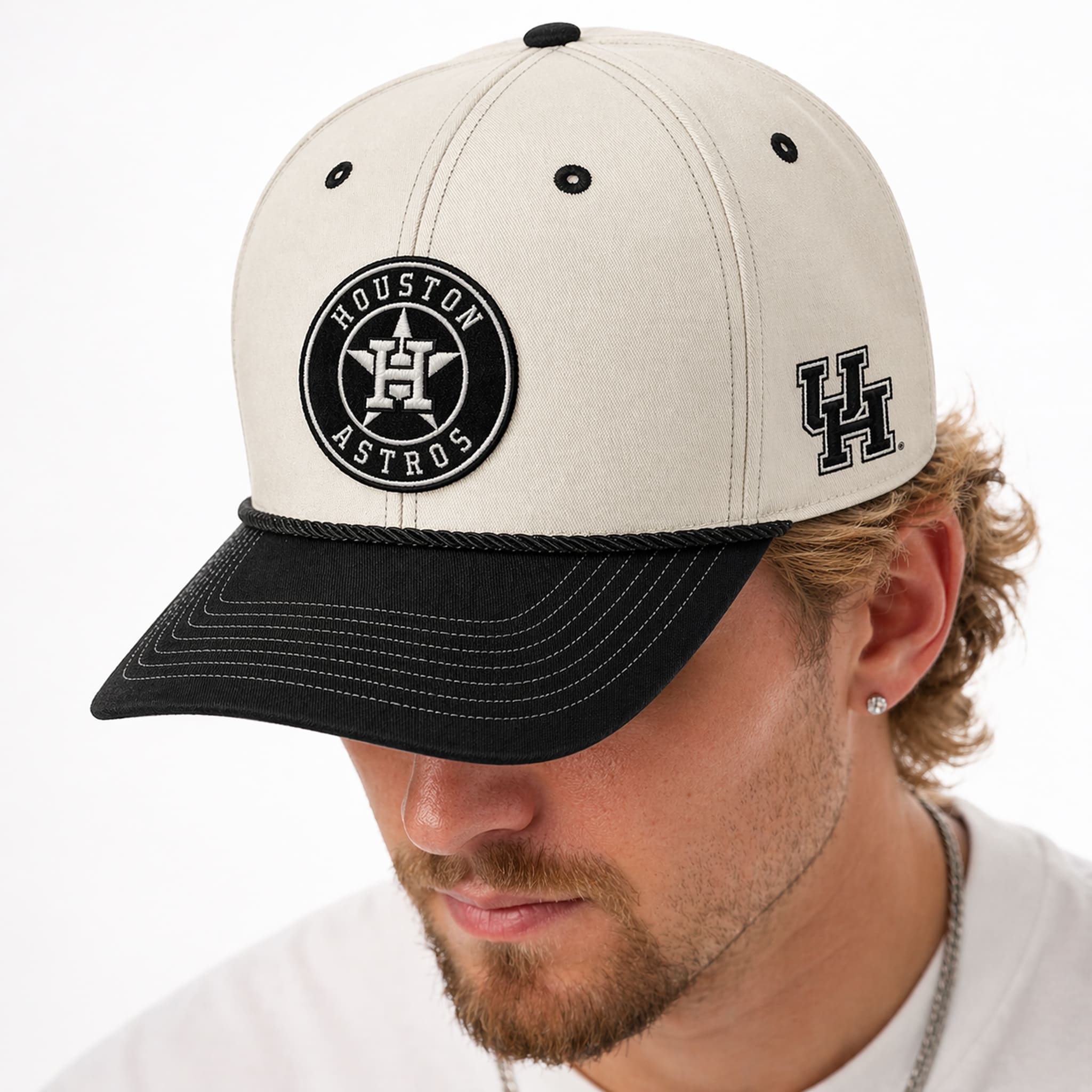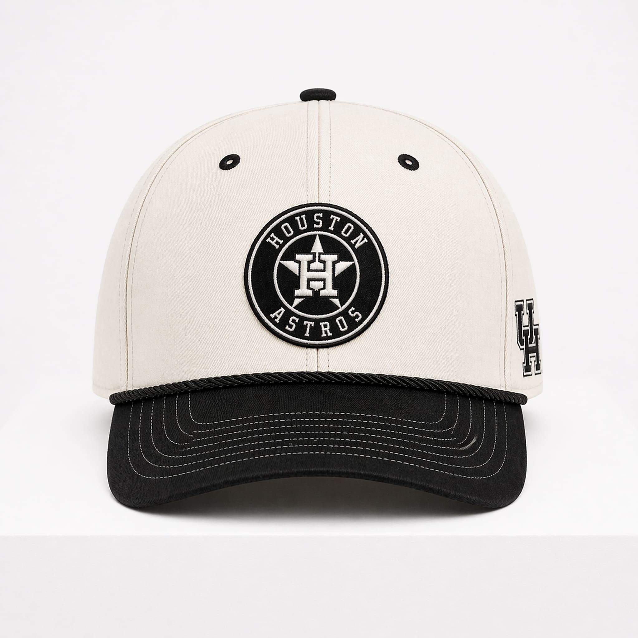 This hat features a modern off-white and black colorway, offering a clean and versatile look for everyday wear. The front showcases a bold circular Houston Astros patch, while the side features the iconic UH logo of the University of Houston, blending collegiate spirit with classic baseball aesthetics.