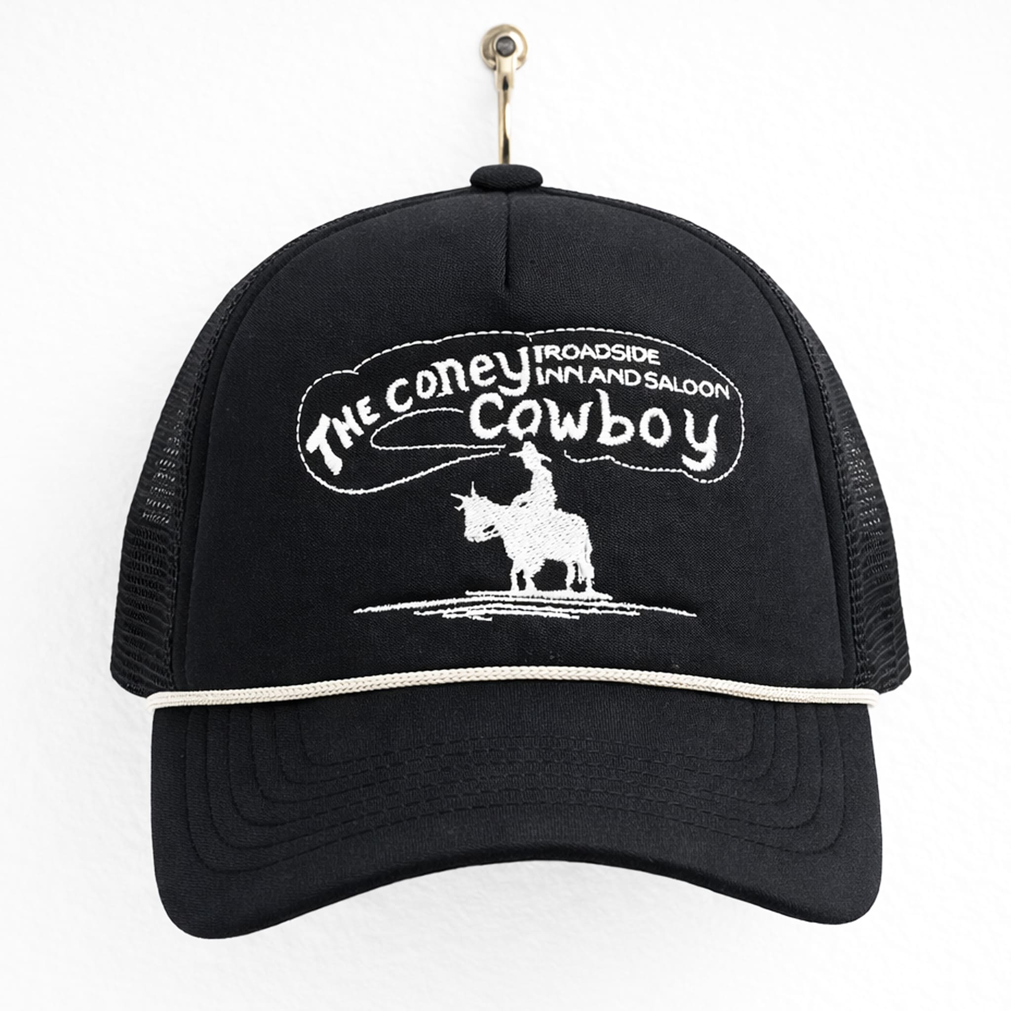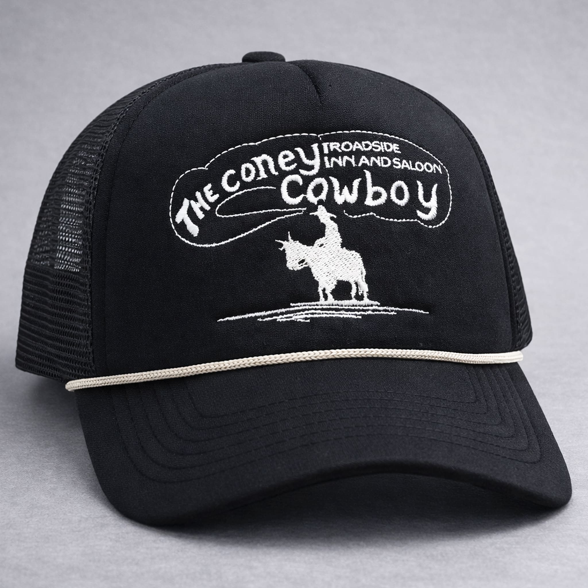 This hat features a mysterious black design with a breathable mesh back, highlighted by bold white embroidery reading “THE CONEY COWBOY” curved around an illustration of a cowboy riding a donkey, finished with a subtle beige rope trim. The result is a classic trucker hat look that feels both modern and streetwear-inspired.