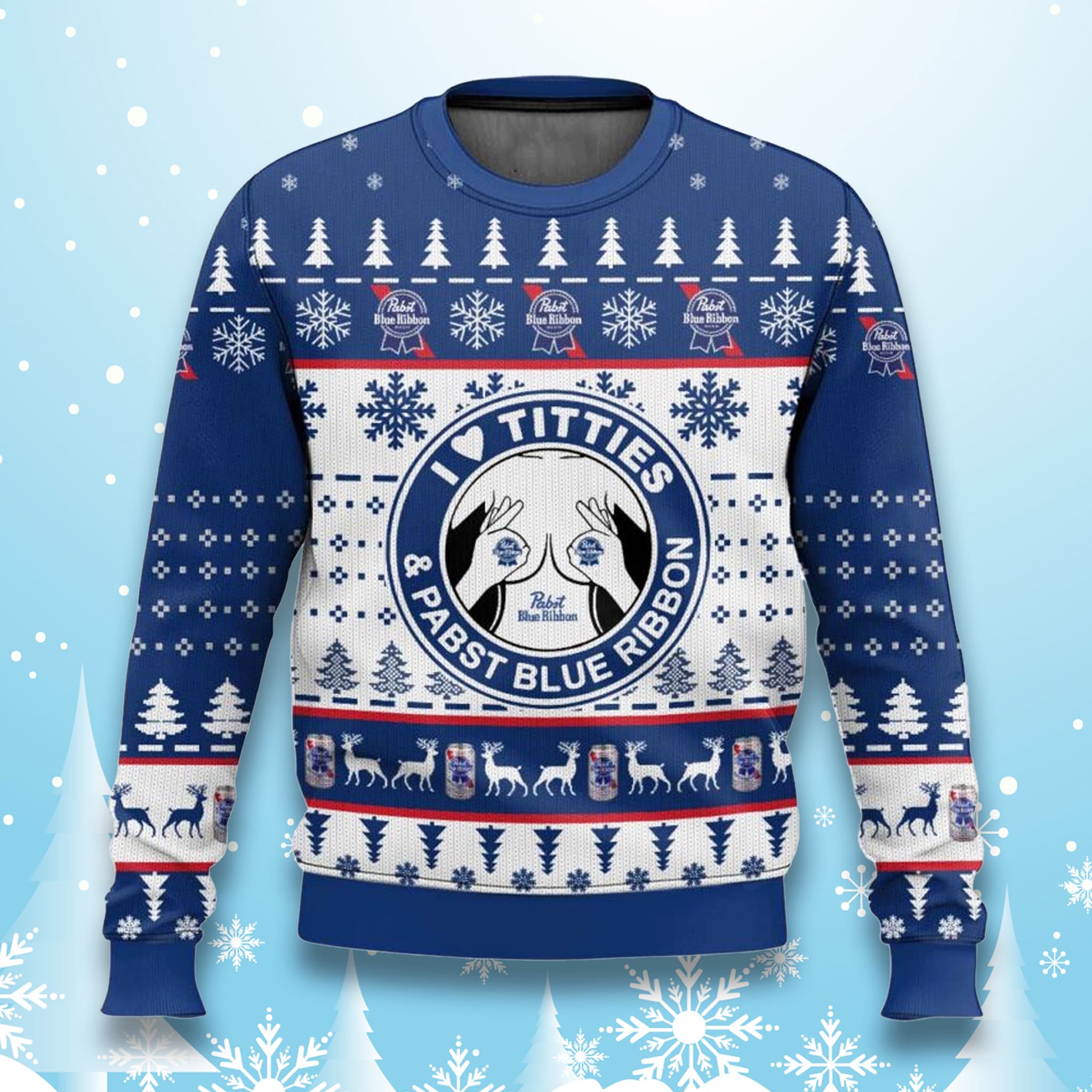 Eye-Catching Design for Maximum Impact. This Pabst Blue Ribbon Ugly Sweater features a classic Fair Isle style pattern, utilizing a dominant palette of deep blue, crisp white, and touches of red, colors synonymous with both the PBR brand and the winter season. The central design panel, the core of this funny Christmas sweater, features the bold text “I LOVE TITTIES” above the classic Pabst Blue Ribbon logo and trademark “Quality” ribbon, making the ultimate holiday party sweater.
