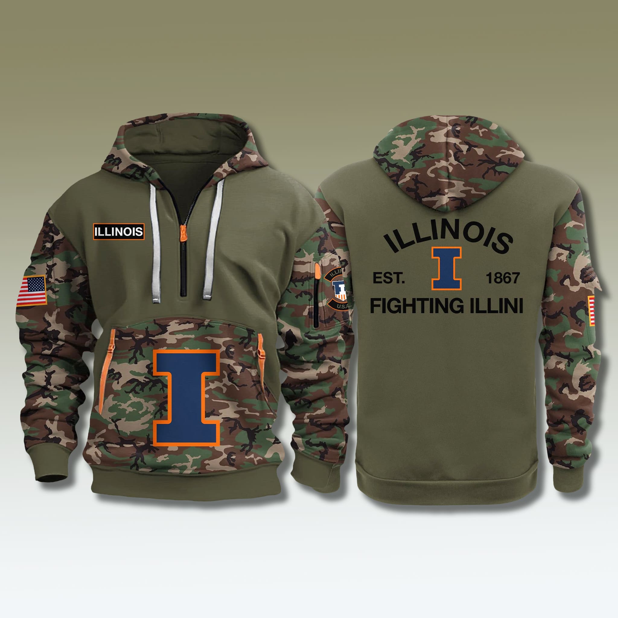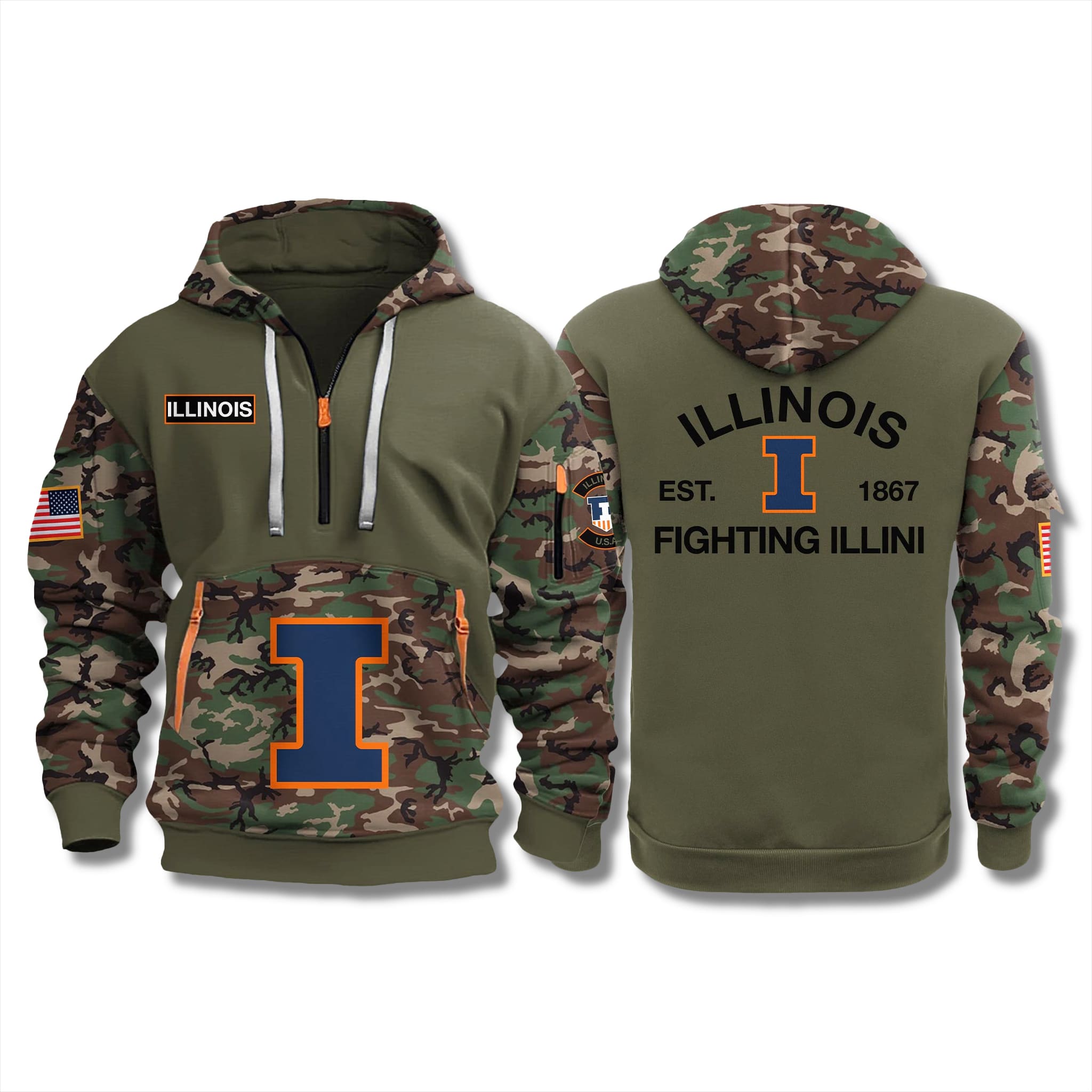 The hoodie stands out with its modern quarter-zip design, army-inspired olive green palette, and striking camo details along the sleeves and pockets. The signature block “I” logo in Illini orange and navy appears prominently on both the front and back – an unmistakable symbol of school pride.