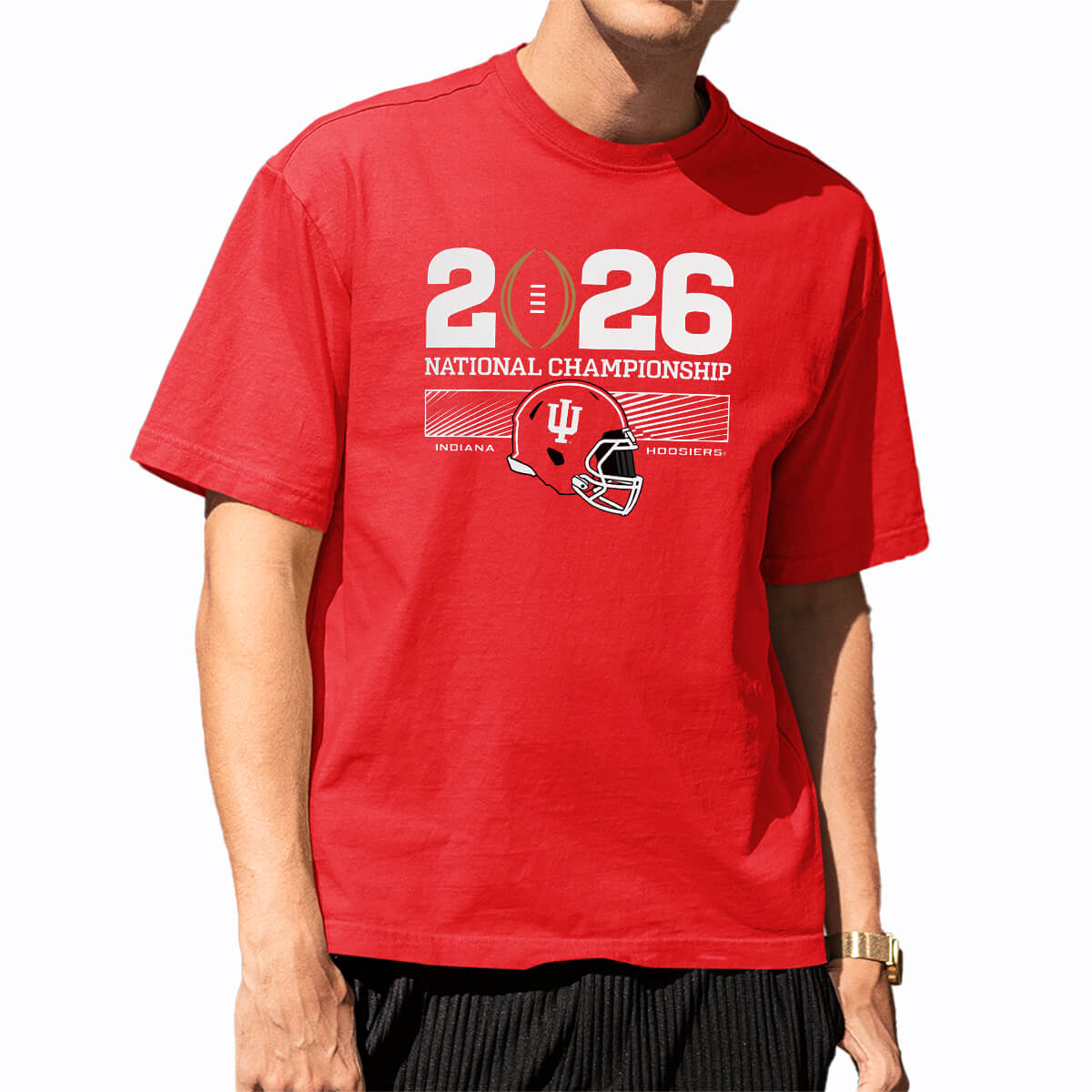 This red shirt features a standout design in the traditional crimson red of the Indiana Hoosiers, combined with 2026 graphics, a football, and the team helmet. The style is modern, simple, yet powerful, making it ideal as a commemorative college football championship T-shirt.
